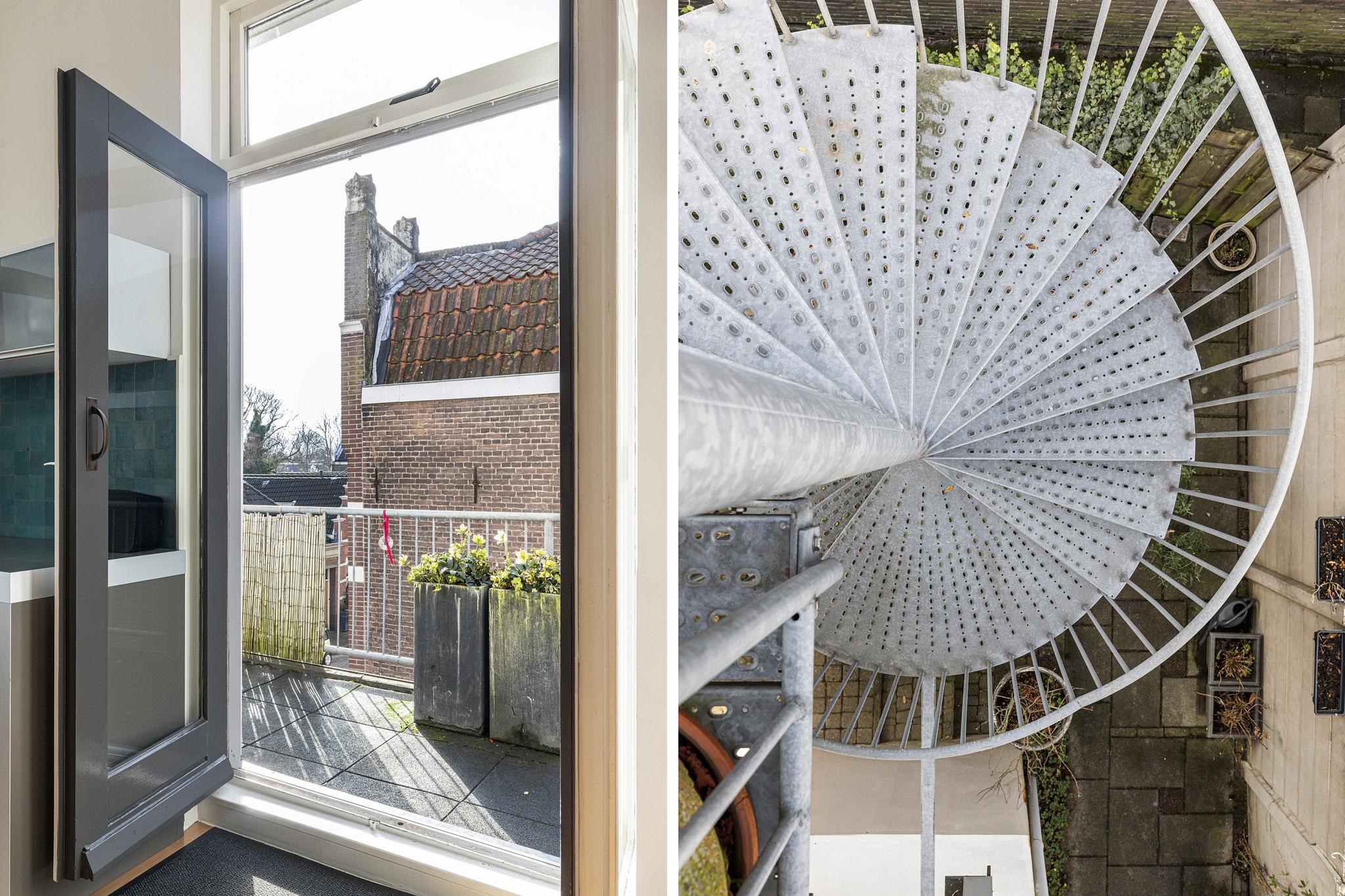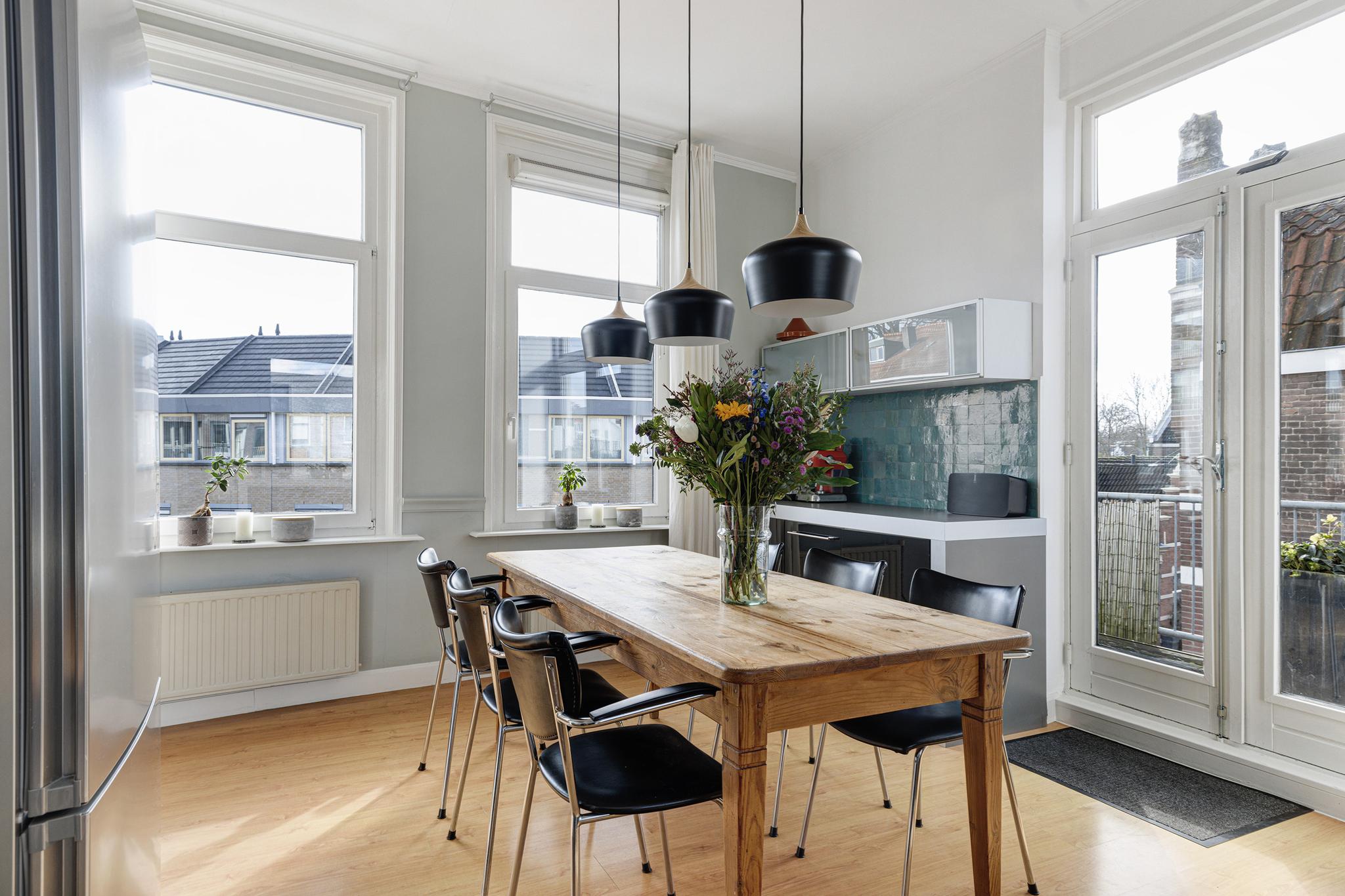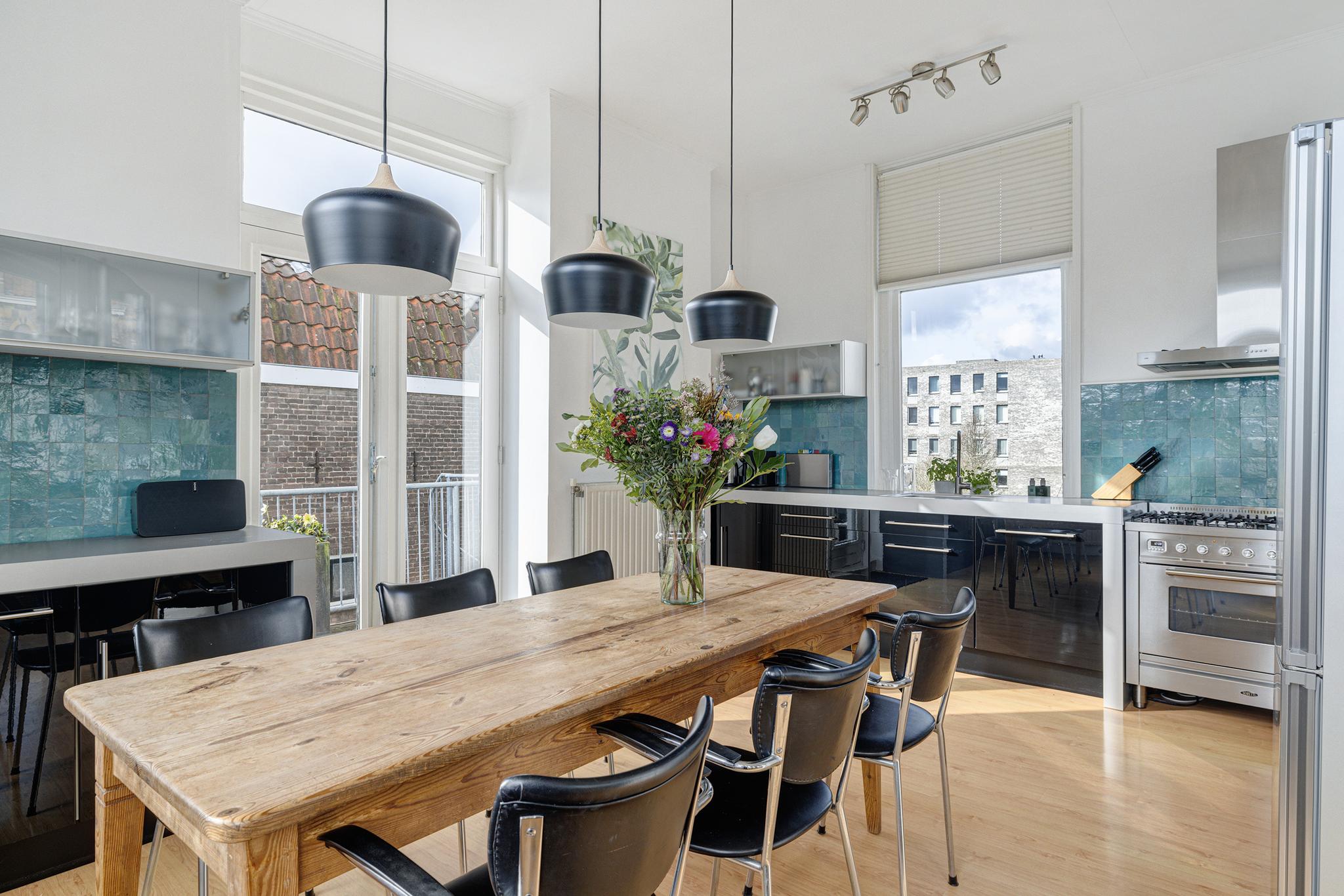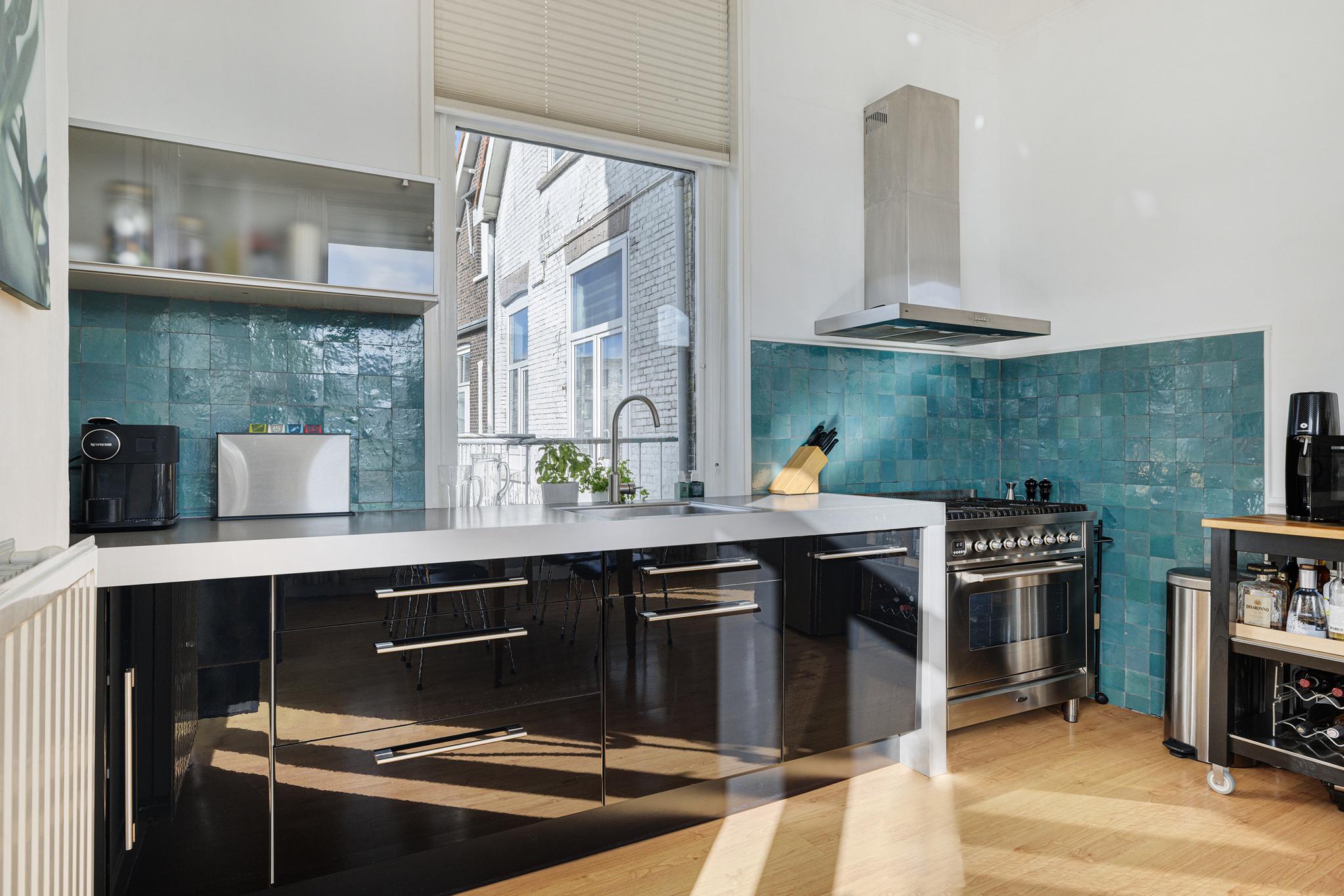 Strakke keuken in wandopstelling voorzien van vaatwasser, losse koelkast met vriezer, los gaskooktoestel (6 pitten) met oven, rvs schouw, spoelbak. Wat deze ruimte zo fijn maakt: de openslaande deuren naar het ruime en zonnige balkon, koffie drinken met zicht op de stad, we love it! Handig is ook de stalen draaitrap die het balkon met de tuin verbind.