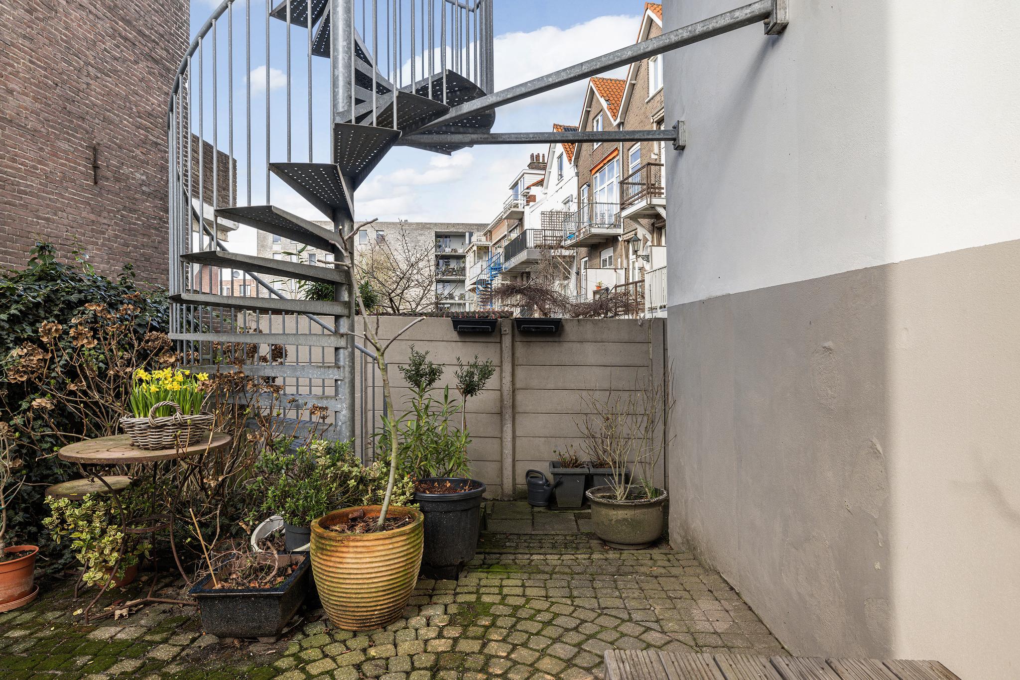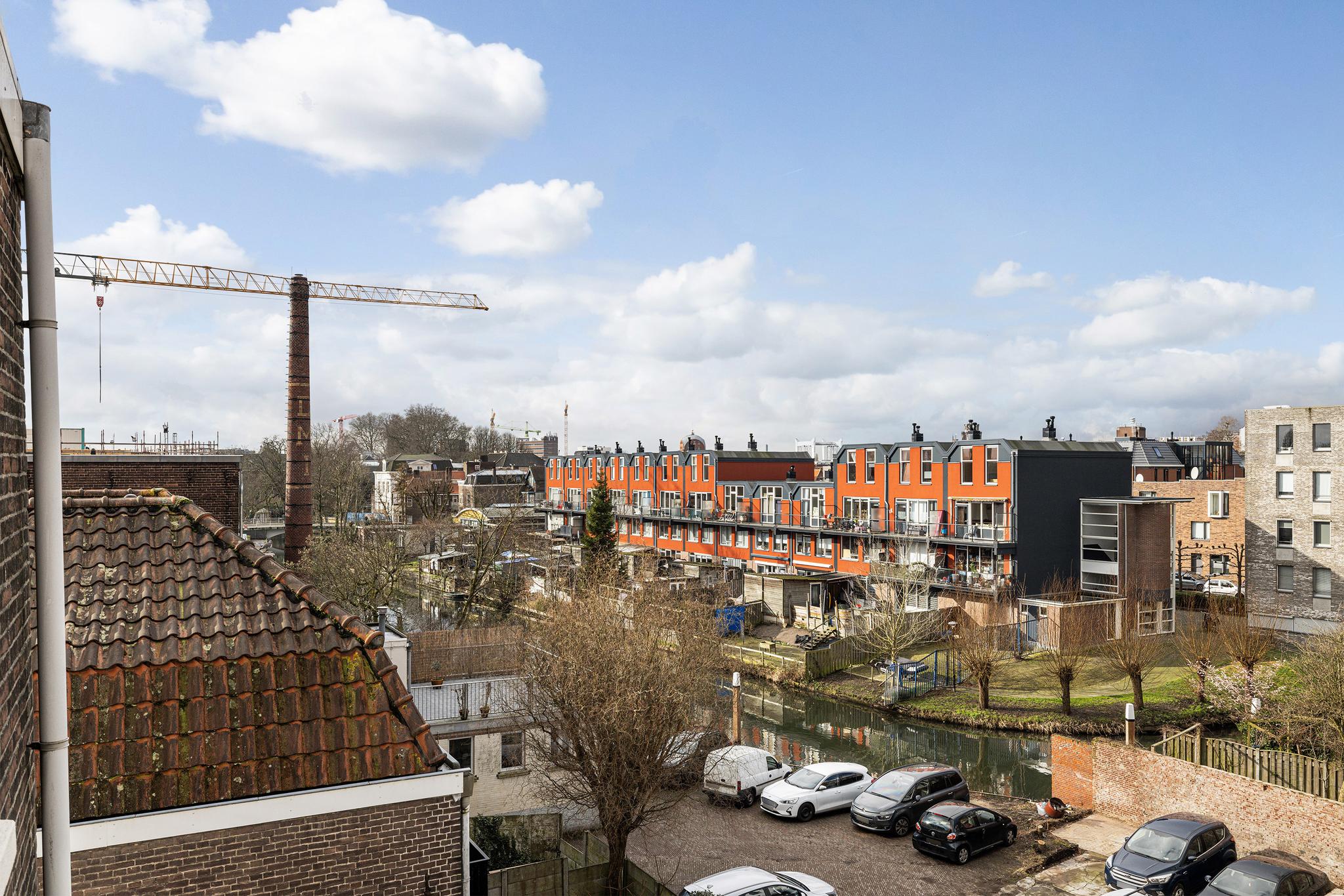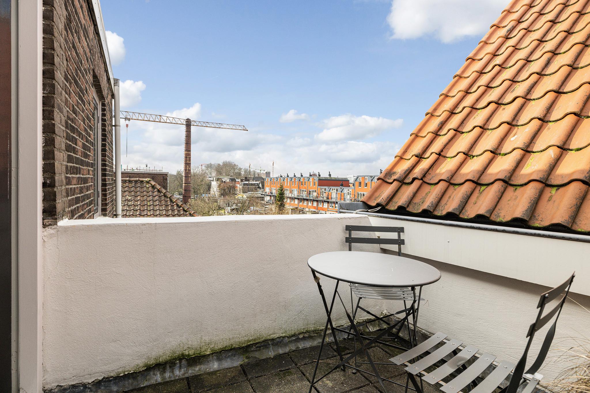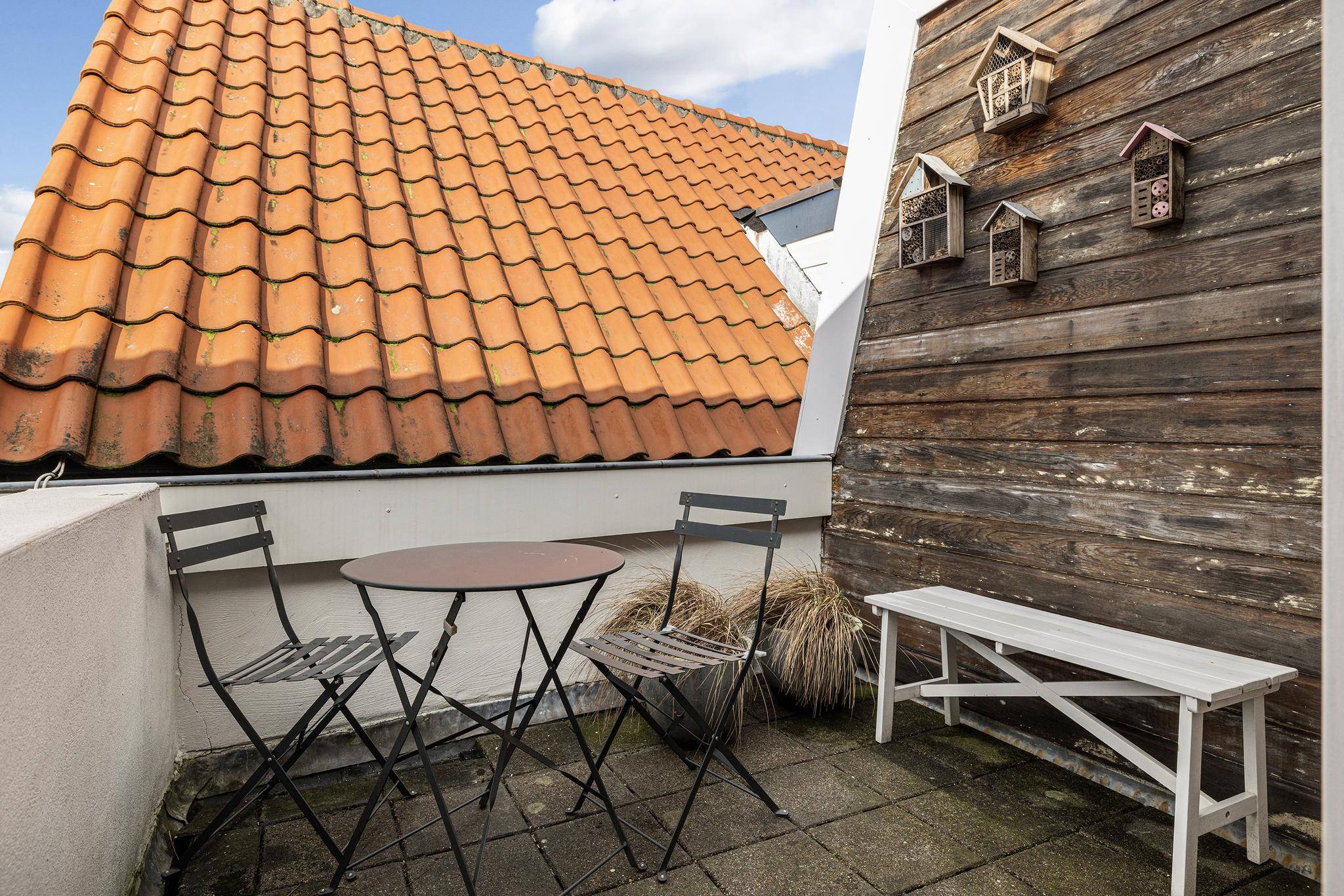 Strakke keuken in wandopstelling voorzien van vaatwasser, losse koelkast met vriezer, los gaskooktoestel (6 pitten) met oven, rvs schouw, spoelbak. Wat deze ruimte zo fijn maakt: de openslaande deuren naar het ruime en zonnige balkon, koffie drinken met zicht op de stad, we love it! Handig is ook de stalen draaitrap die het balkon met de tuin verbind.