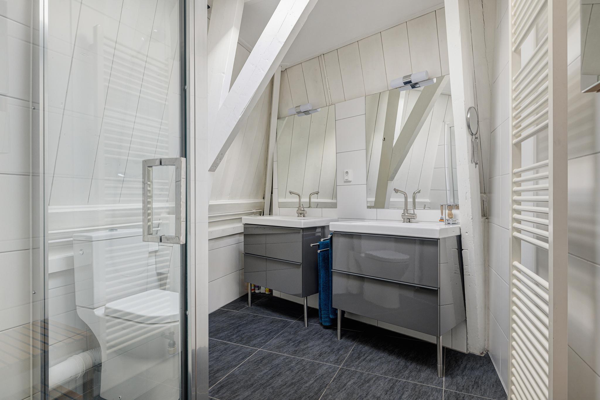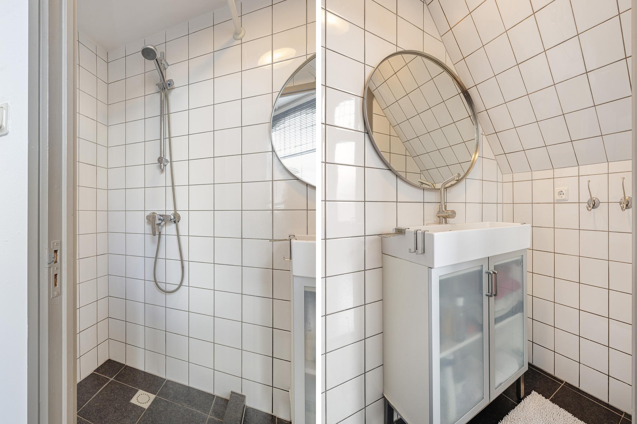 Ook is er een badkamer met douchehoek en wastafel met meubel aanwezig, geheel betegelde wanden.