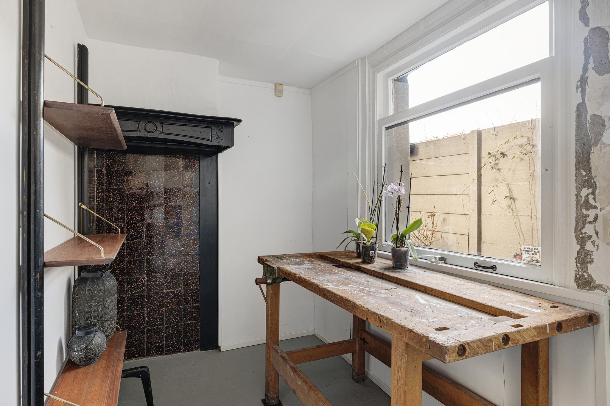 Verder kijk je je ogen uit in de ruimte: een mooie marmeren schouw, vaste kasten, de oude kasten van het postkantoor en achterin de ruimte een trap naar de voormalige woning van de beambte.
