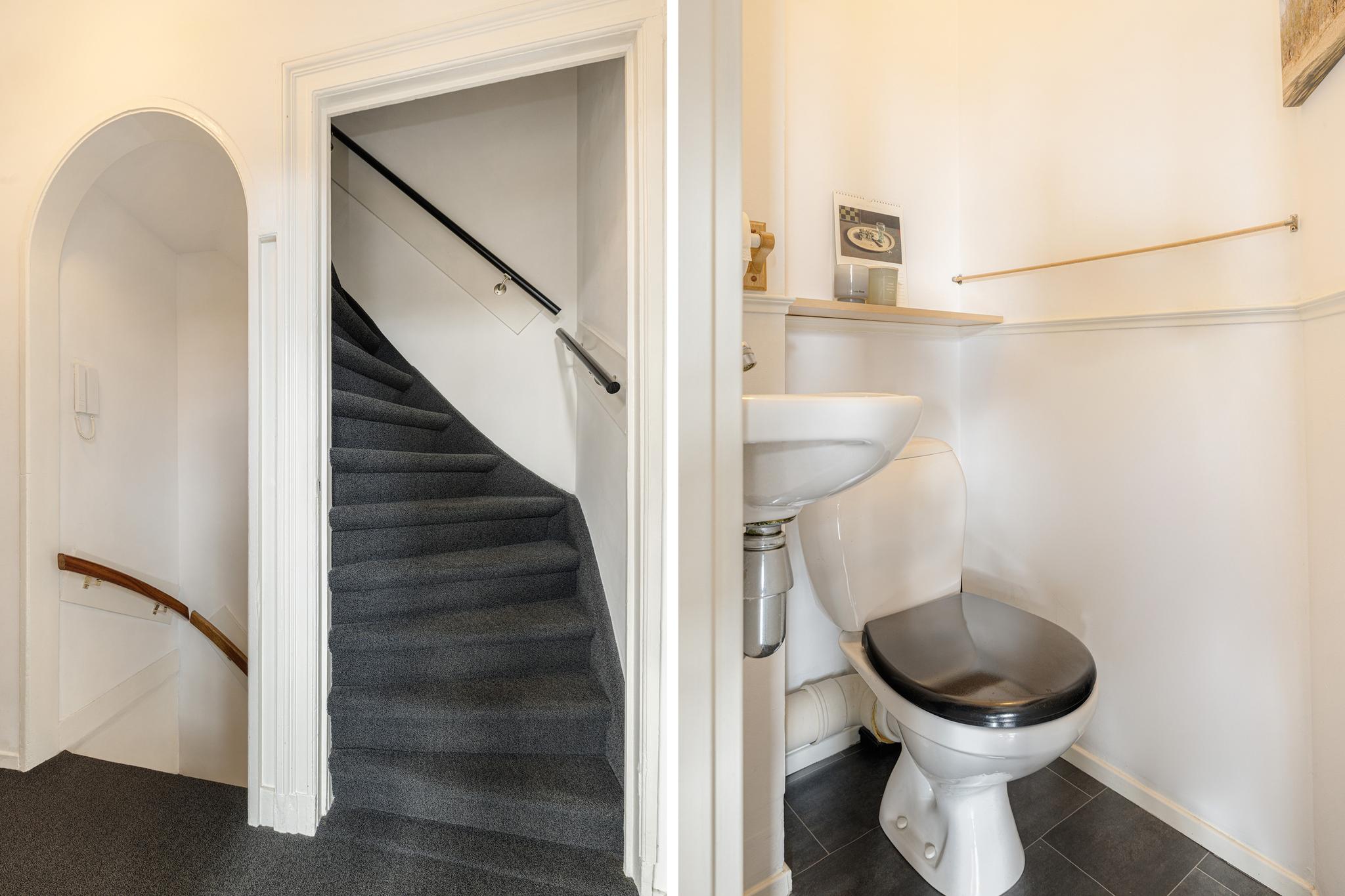 Hal met vaste trap naar de tweede verdieping en toilet (type duoblok met fonteintje).
