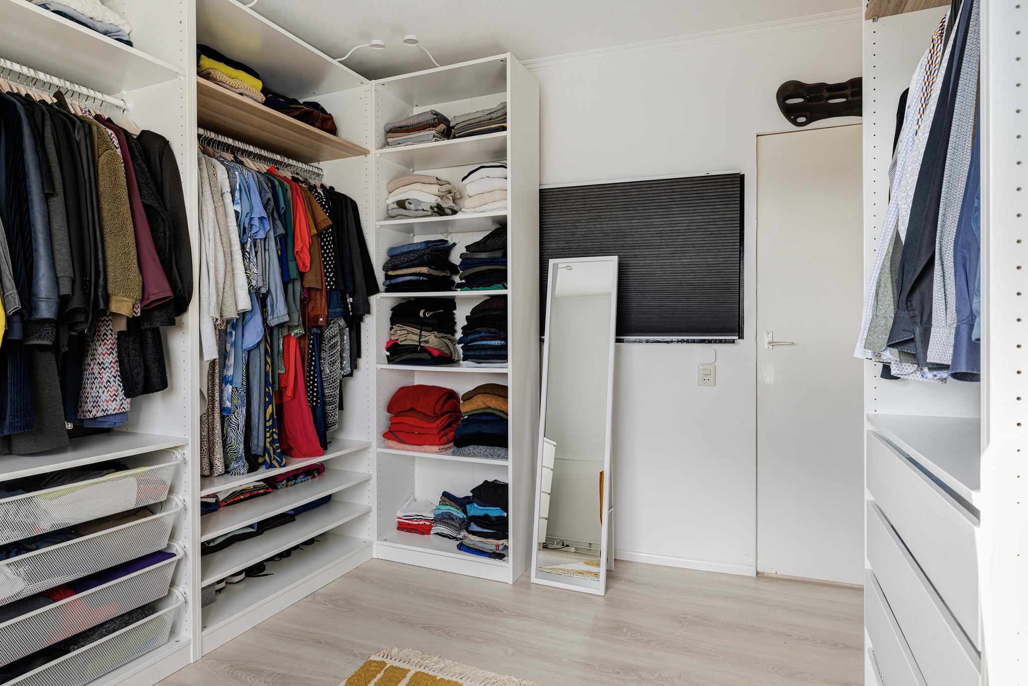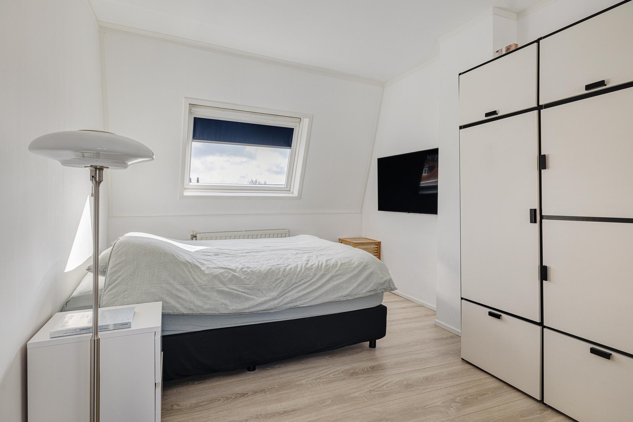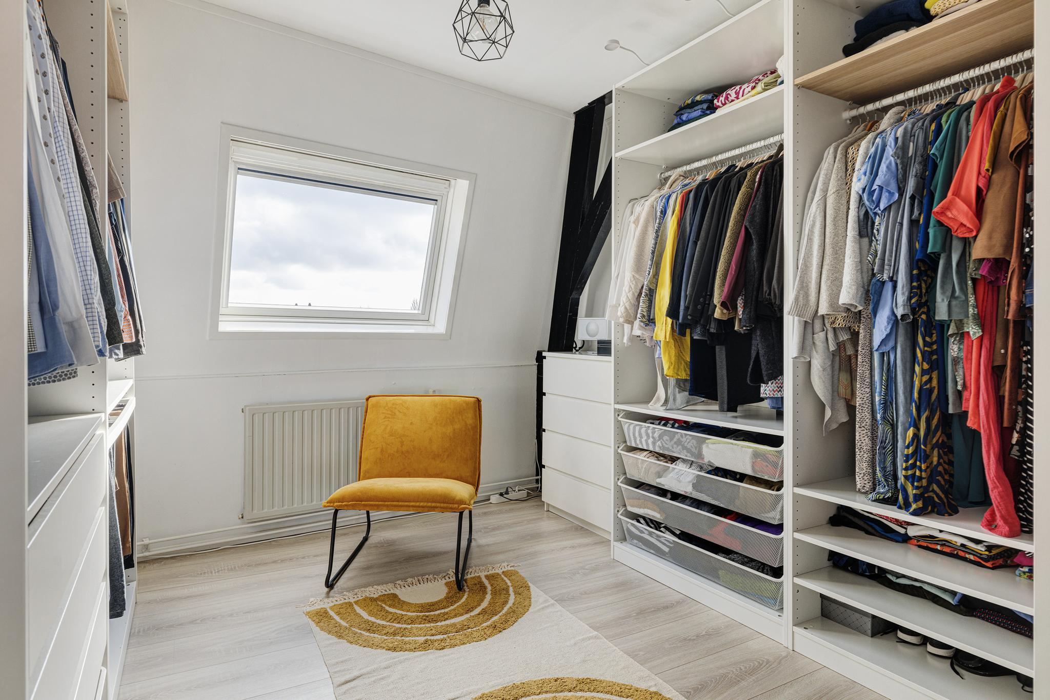 Slaapkamer met inloopkast en dakraam, ook hier een laminaat vloer en stuc wanden.