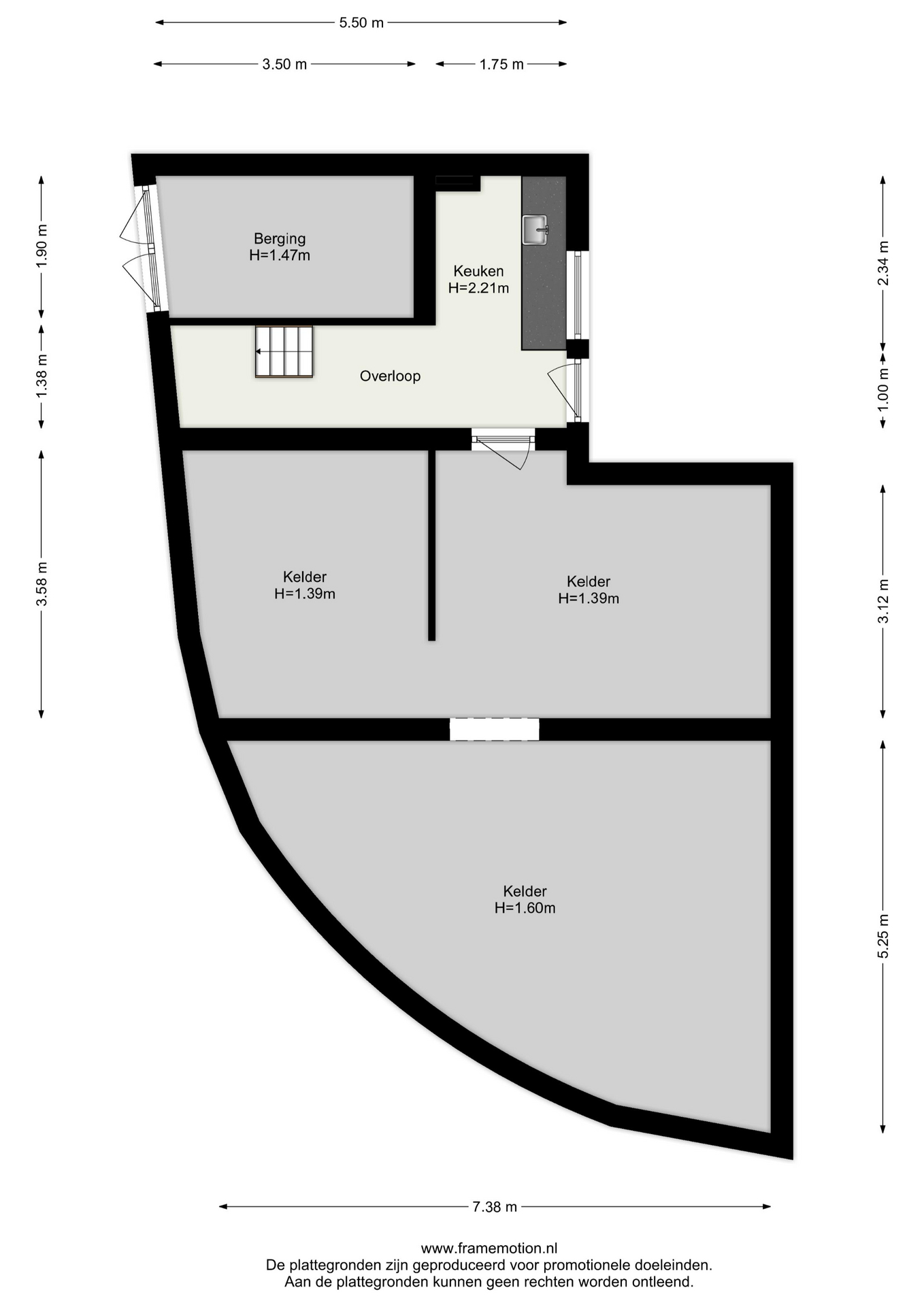 Trap naar de begane grond waar je de oude keuken tegenkomt met deur naar de tuin en een doorgang naar de enorme kelder onder een groot deel van de begane grond.