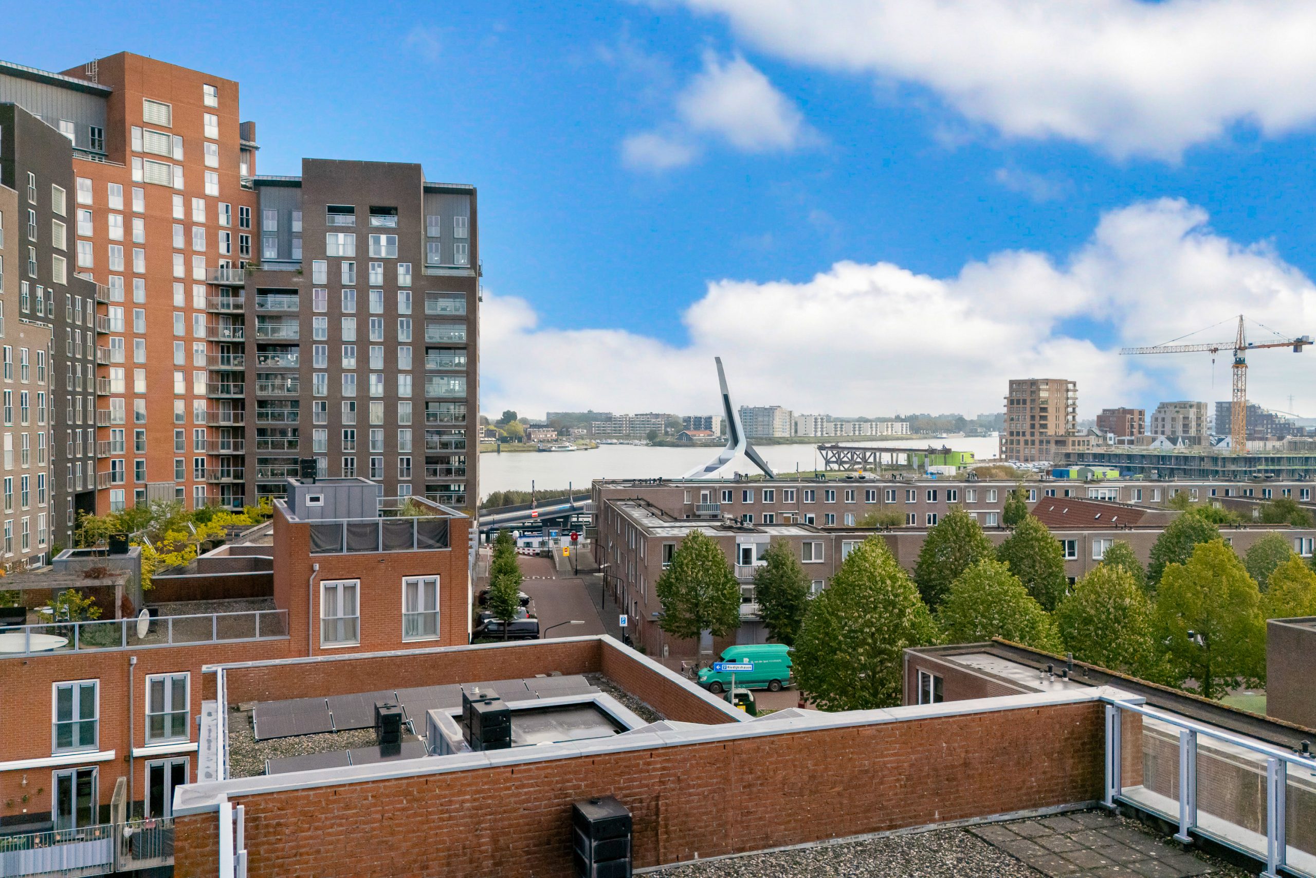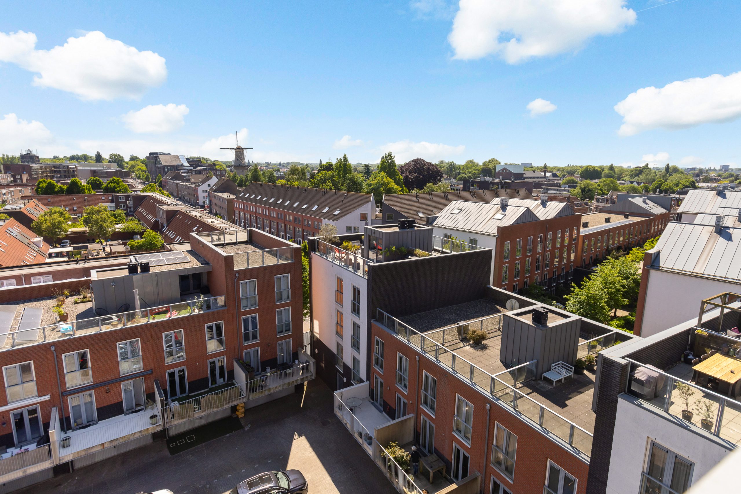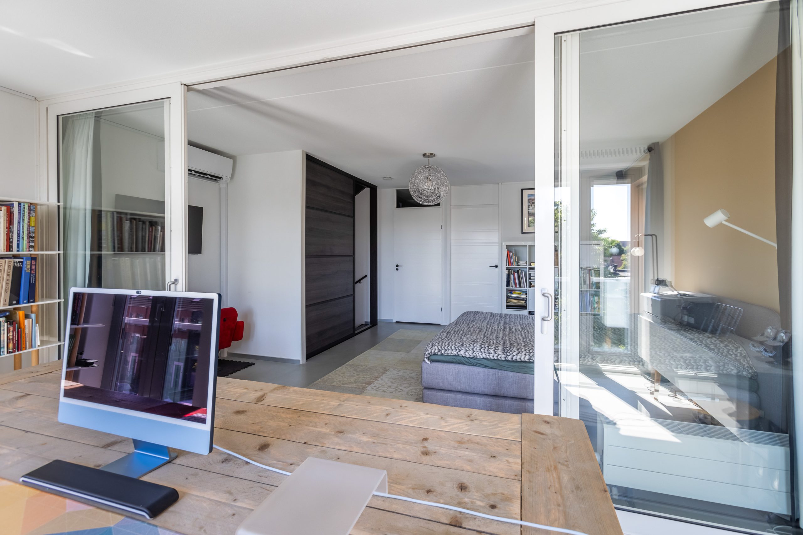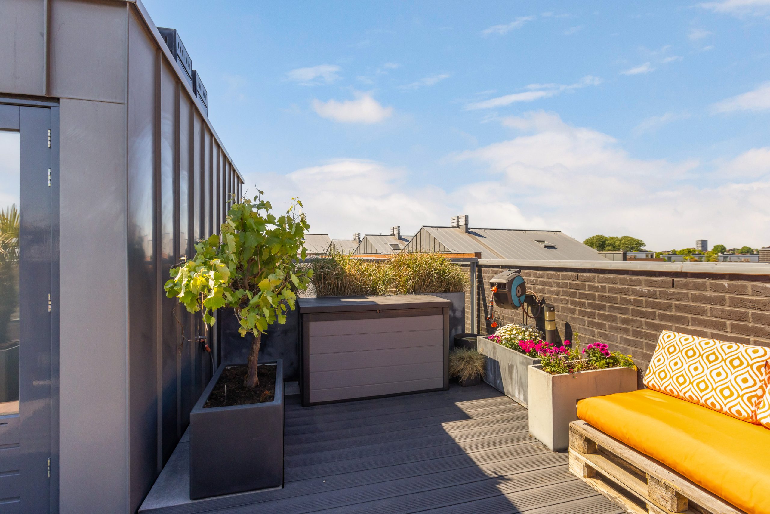 Overloop met toegang tot het grote dakterras. Het dakterras is zonnig en biedt prachtig uitzicht over Dordrecht, echt een unieke plek met veel privacy en meerdere zitmogelijkheden.
