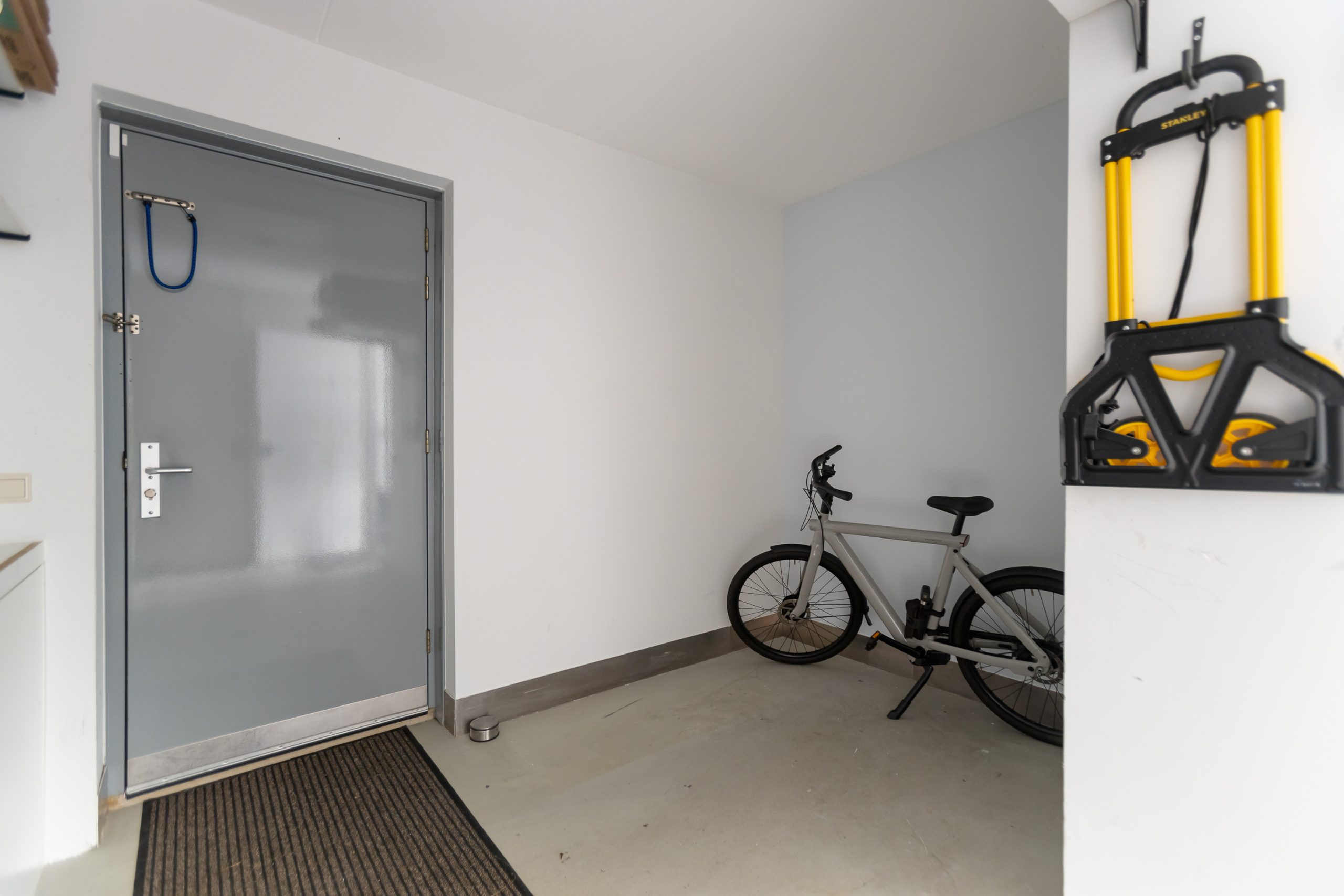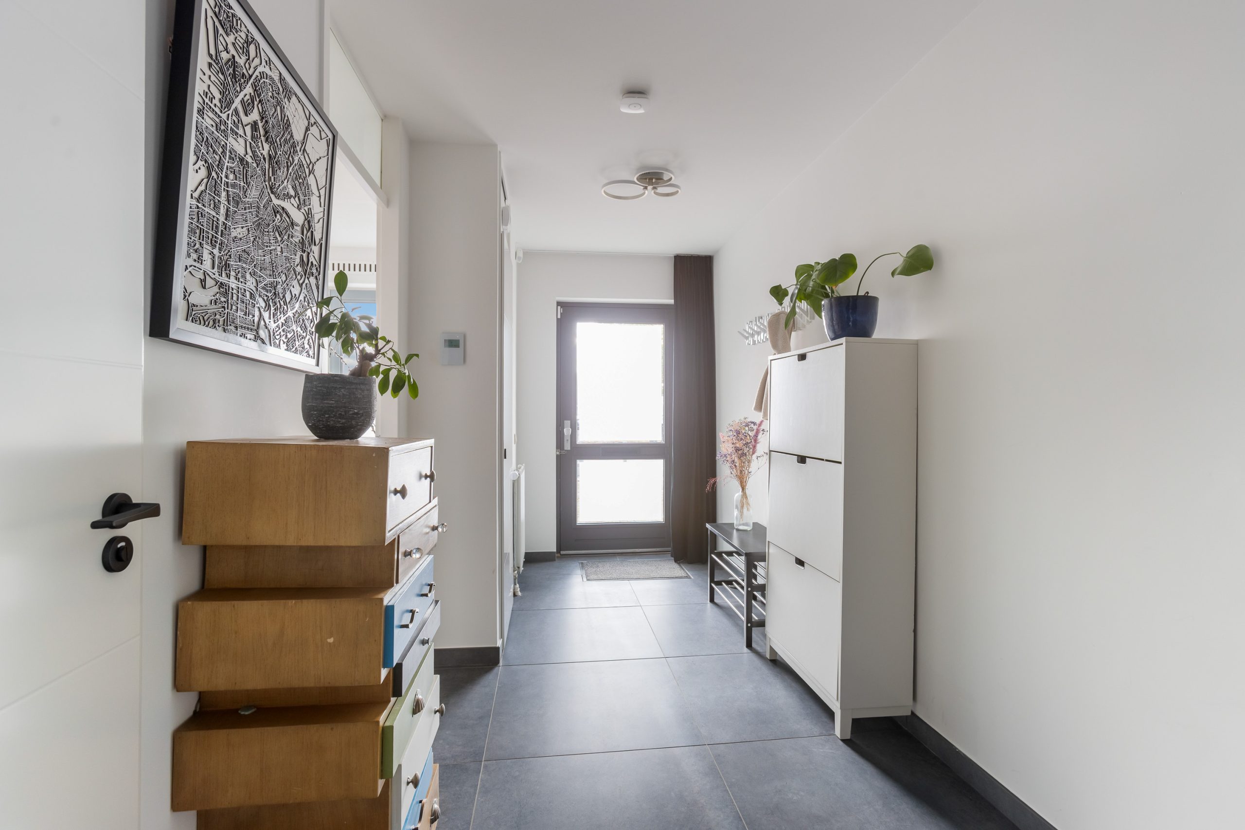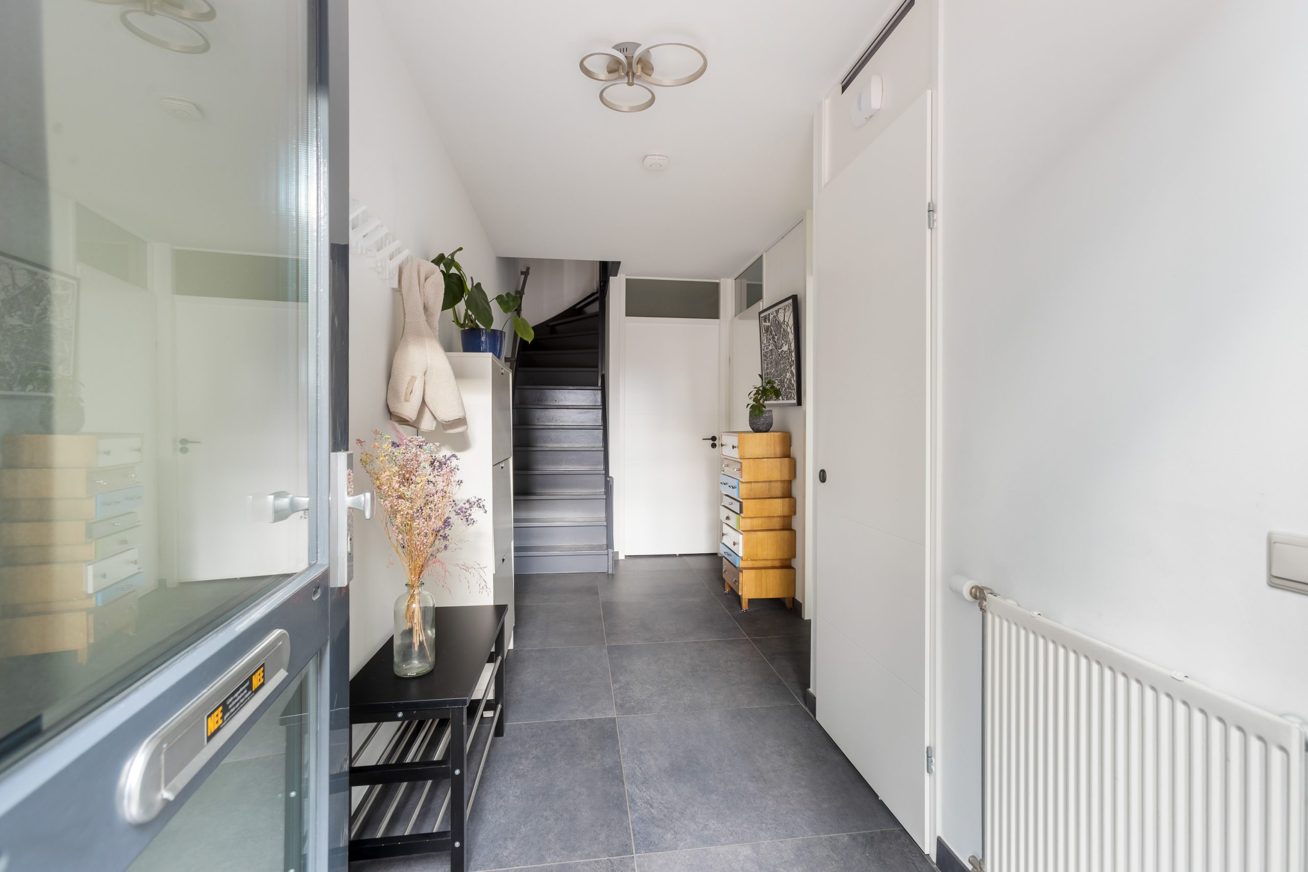 De ruime hal voorzien van een tegelvloer in antraciet tint en nette gestucte wanden. Daar is de trap naar boven naar de woonkamer en toegang tot kruipruimte, de meterkast, toilet, voorkamer en de berging.