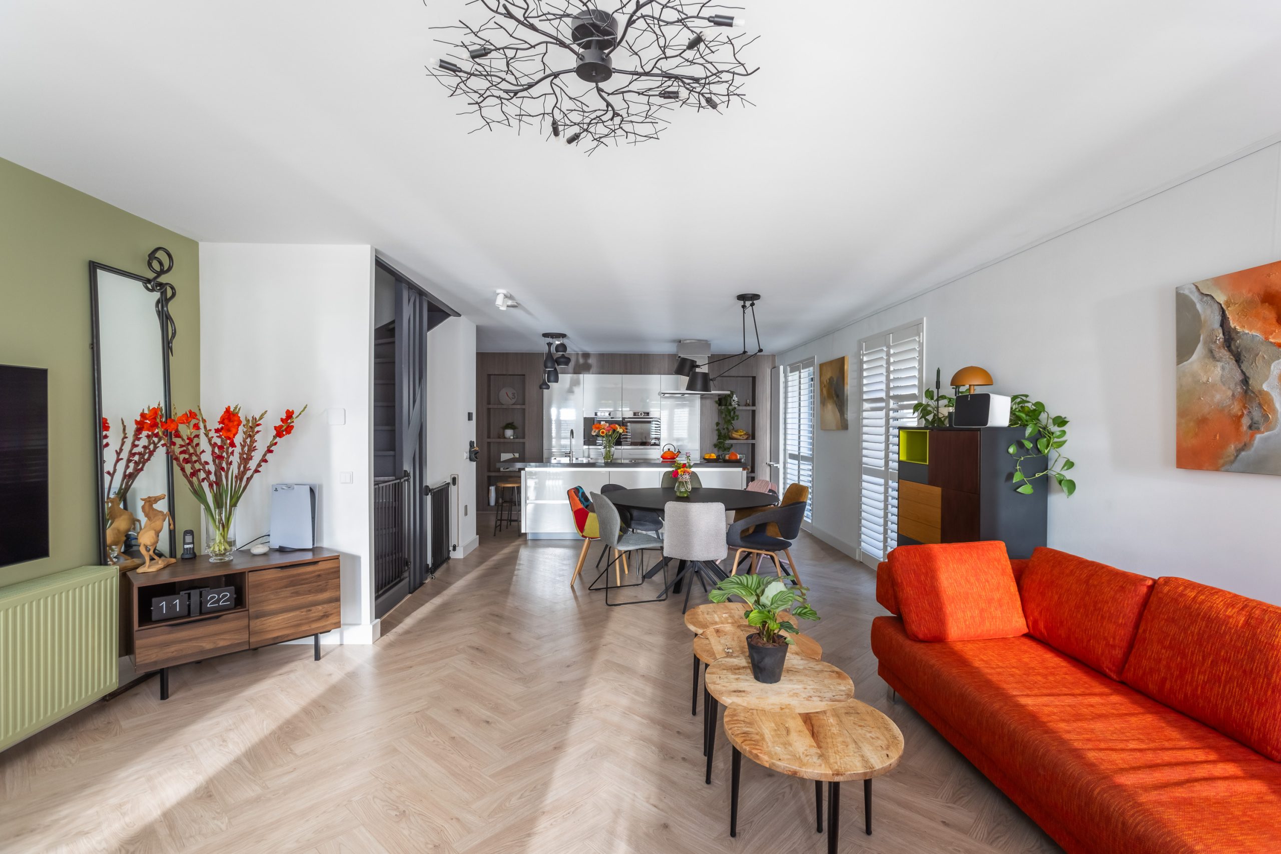 Heerlijk open leefruimte met aan 2 kanten ramen en Franse balkons. In de kamer is een grote open keuken aanwezig, de wanden en plafond zijn glad-gestuct en op de vloer is een kliklaminaat (merk Meister) visgraat geplaatst, heerlijk modern en strak, passend bij het huis.