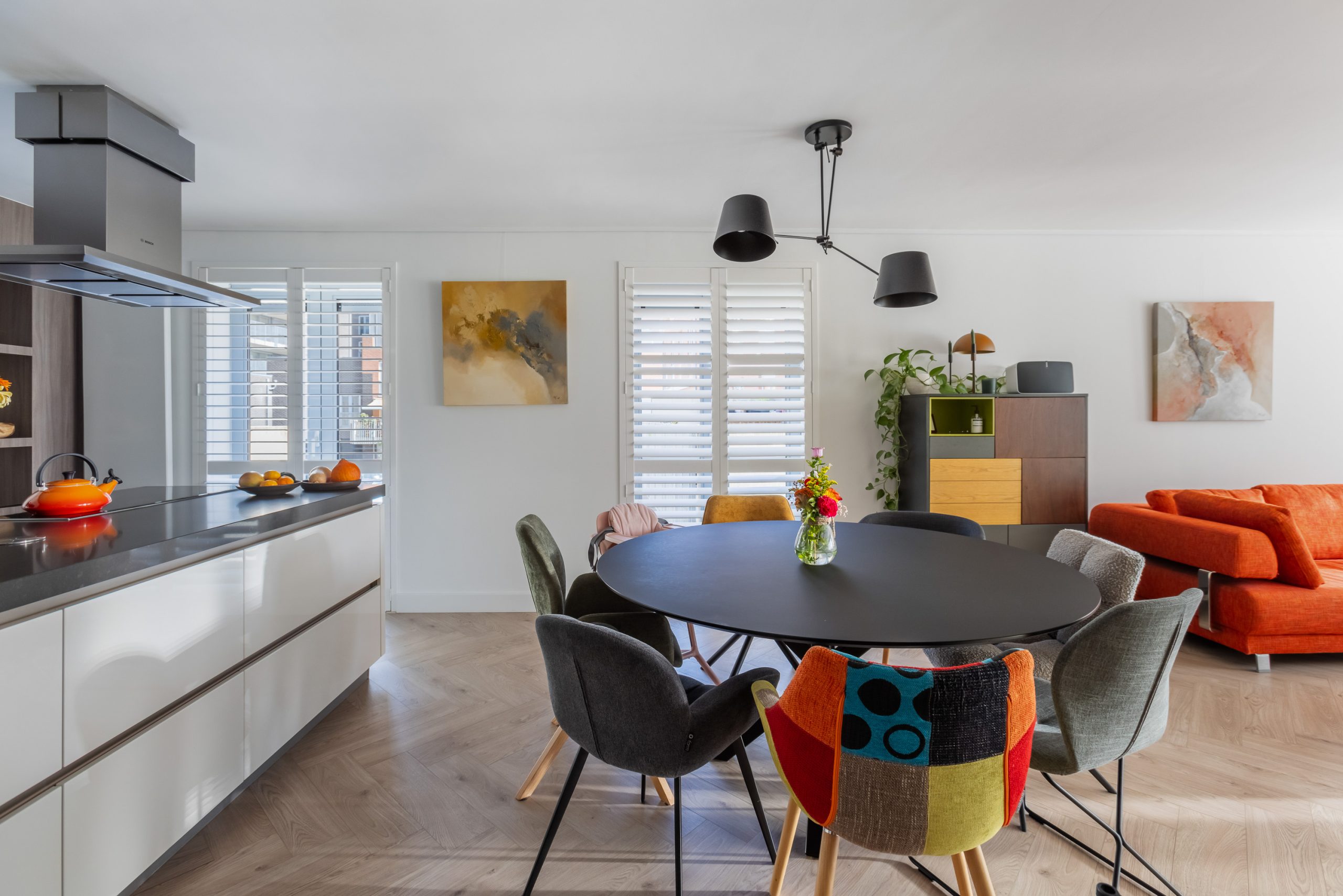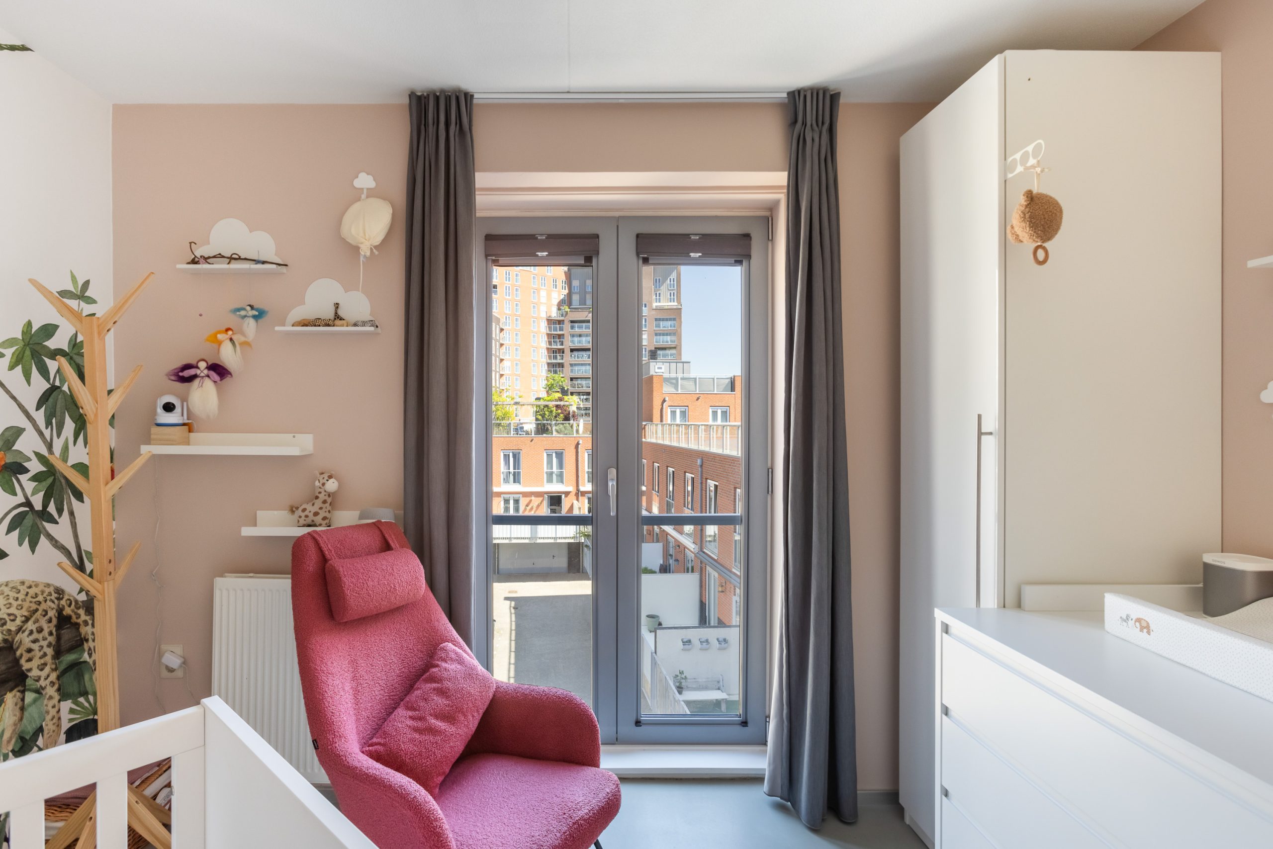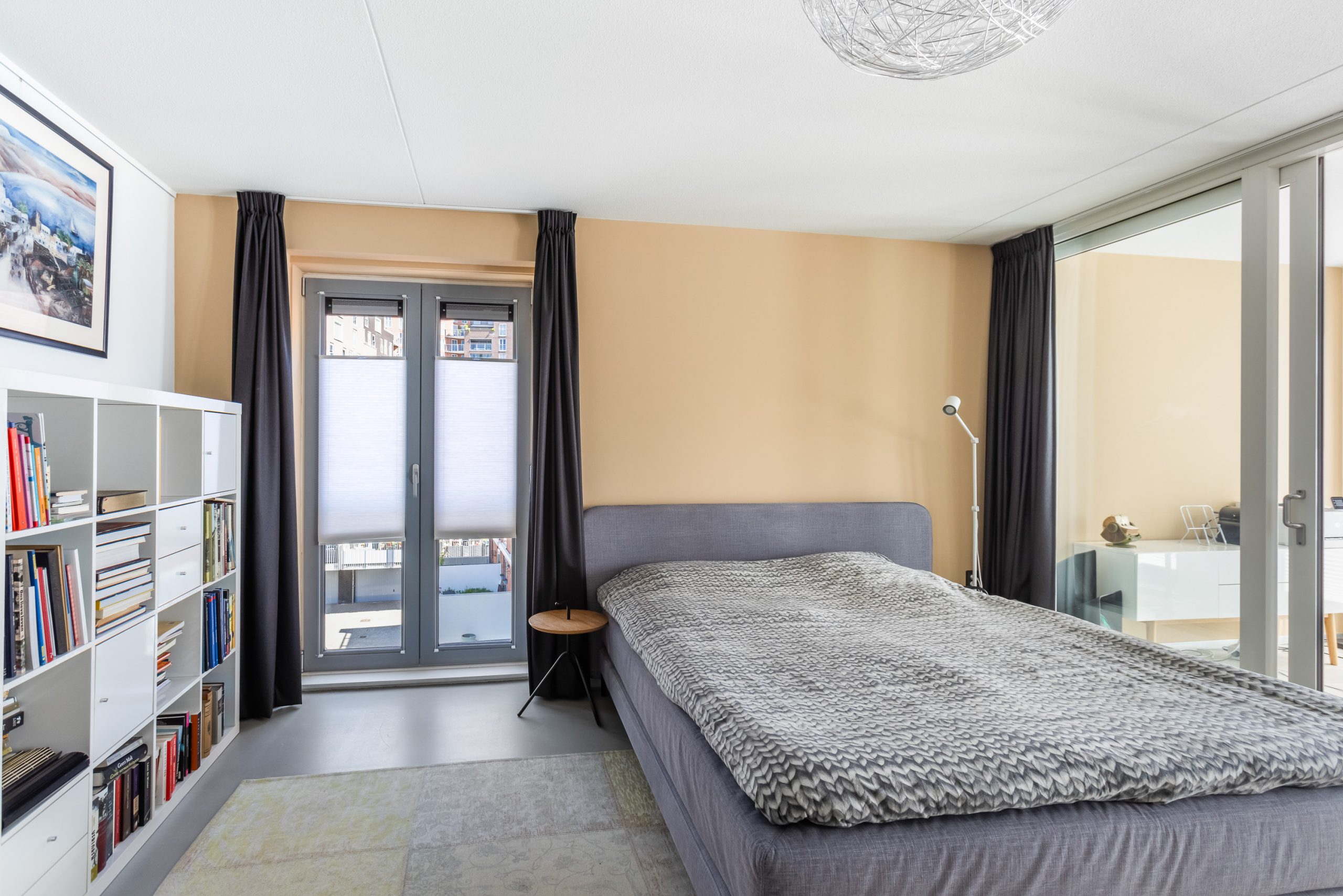 De ruimte beschikt over 3 grote ramen met Frans balkon met op maat gemaakte en in kleur gespoten Easyclick plissé. Hiervandaan heb je een enorm uitzicht over de Lijnbaan.