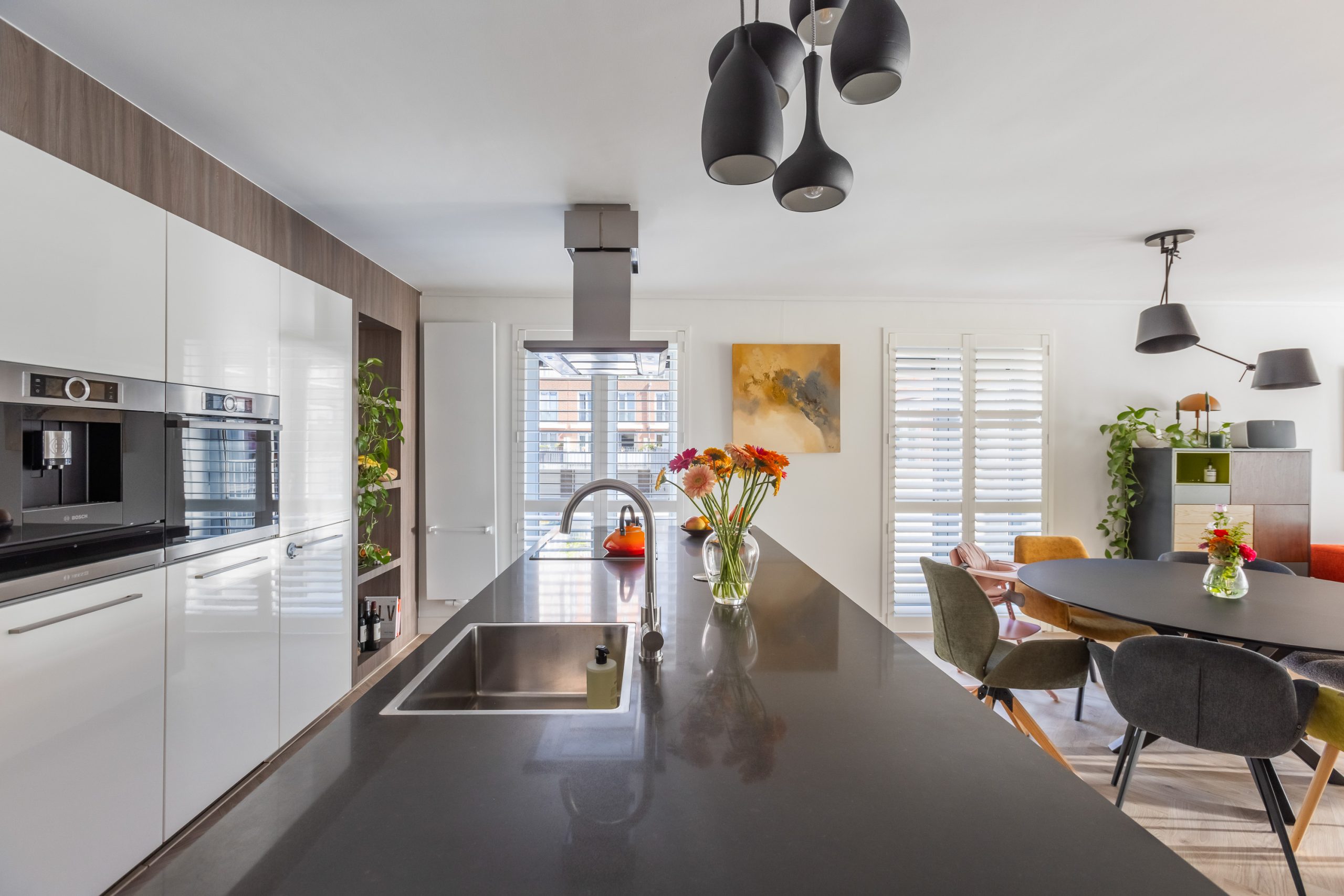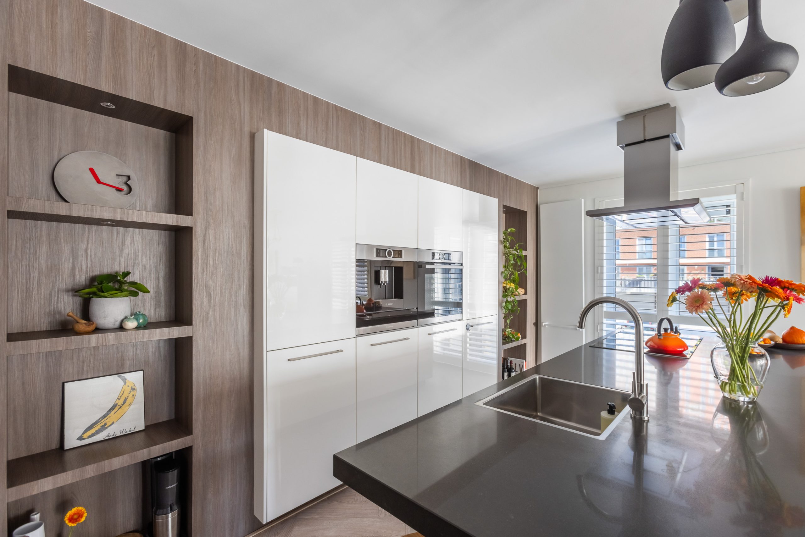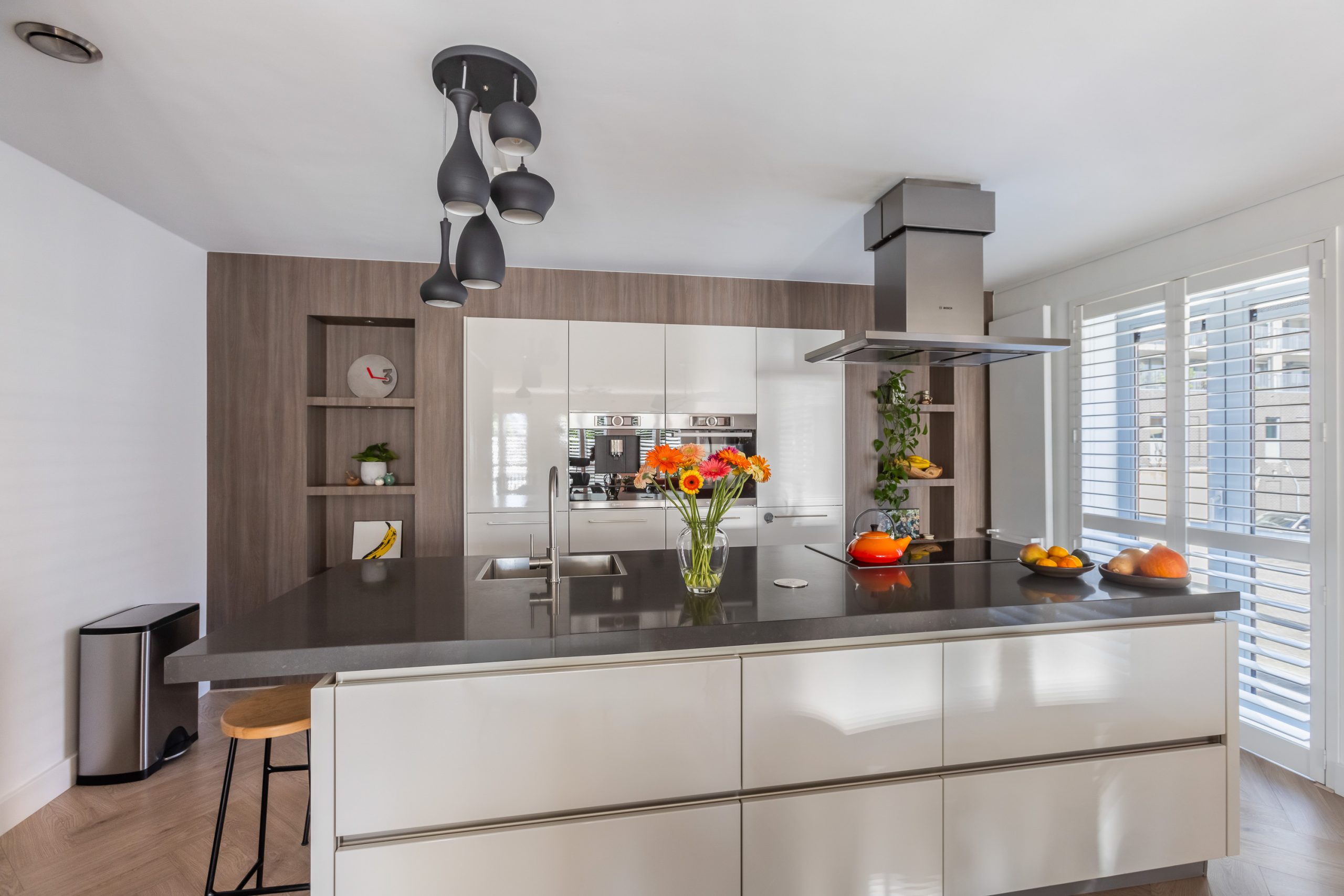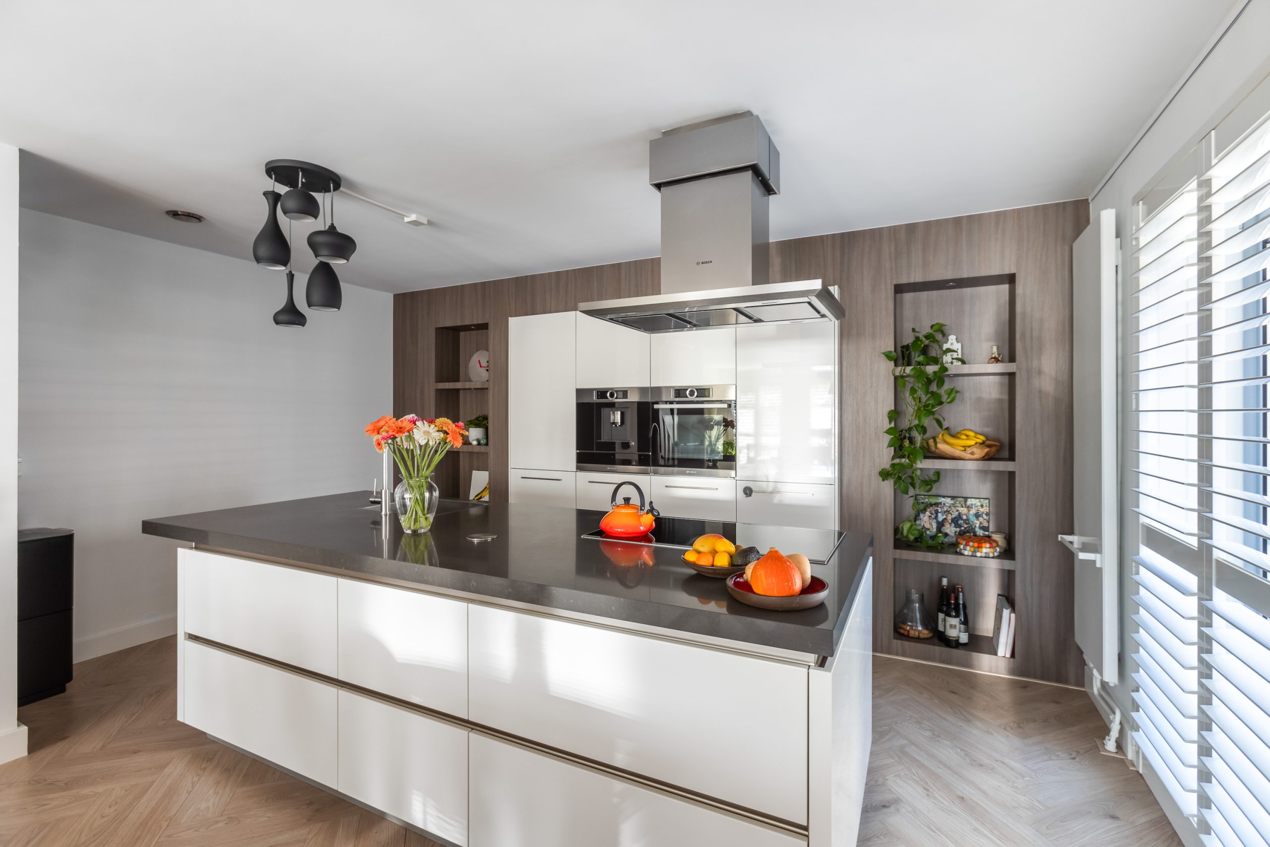 De keuken is op maat gemaakt voor de ruimte en uitgevoerd met een wandopstelling en een groot eiland met veel lades en een bar. De keuken is uitgerust met Bosch inbouwapparatuur: een Zeolith vaatwasser, inductie kookplaat, recirculatie kap, koelkast, vriezer, koffiezet apparaat, oven en diverse nissen om objecten in uit te stallen.