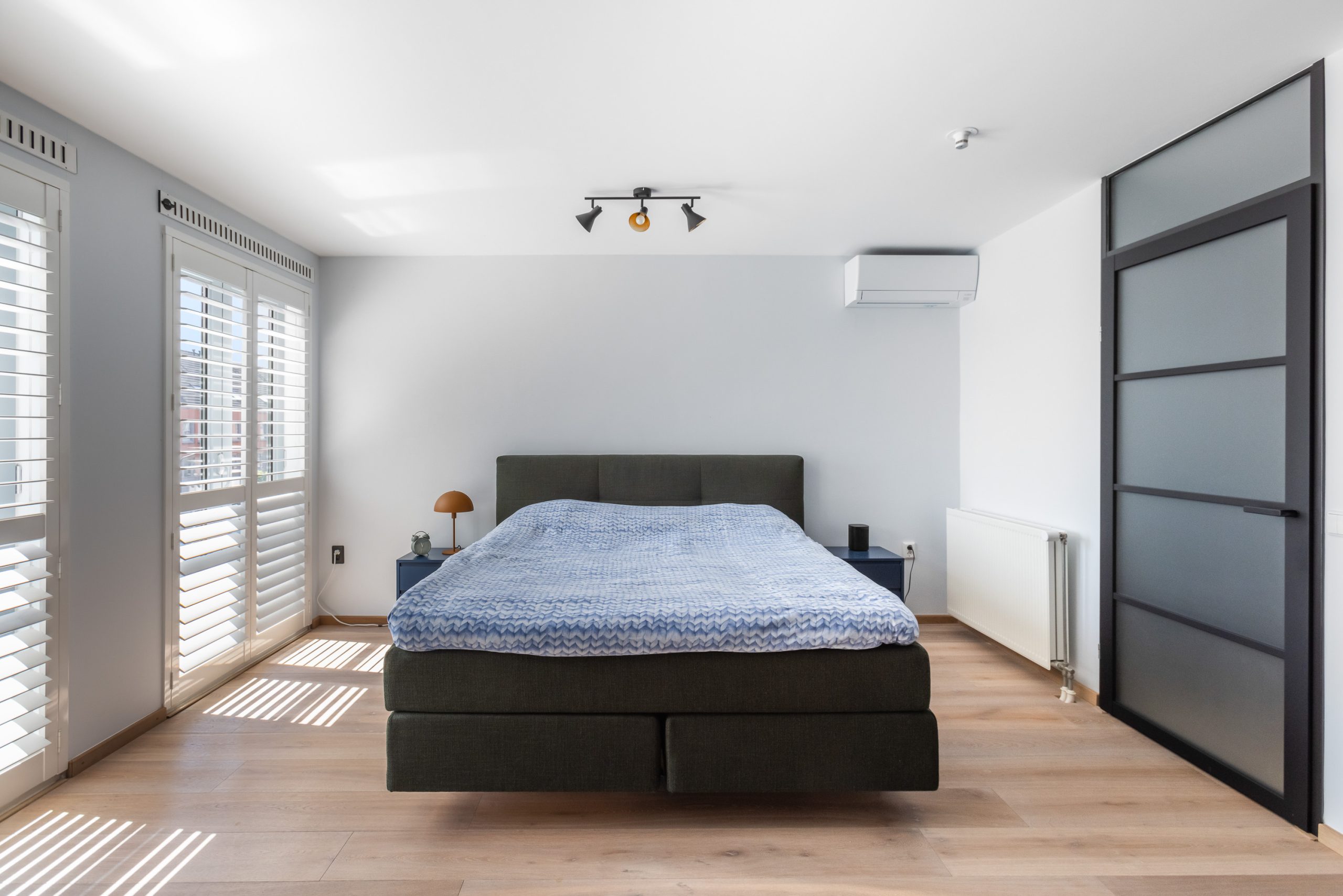In het slaapgedeelte is een radiator en hangt een airconditioning; in badkamergedeelte is een elektrische design radiator met blower geplaatst.