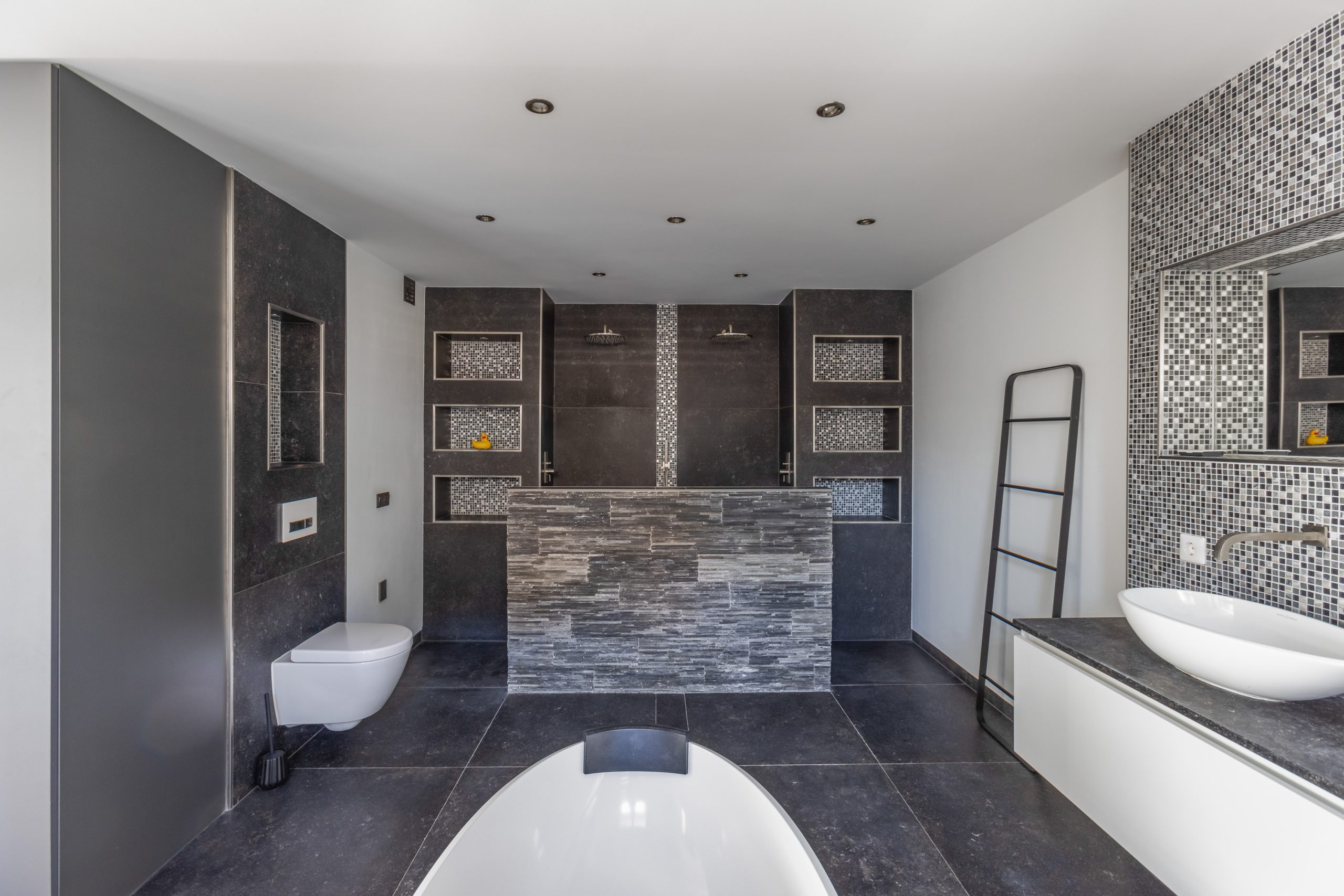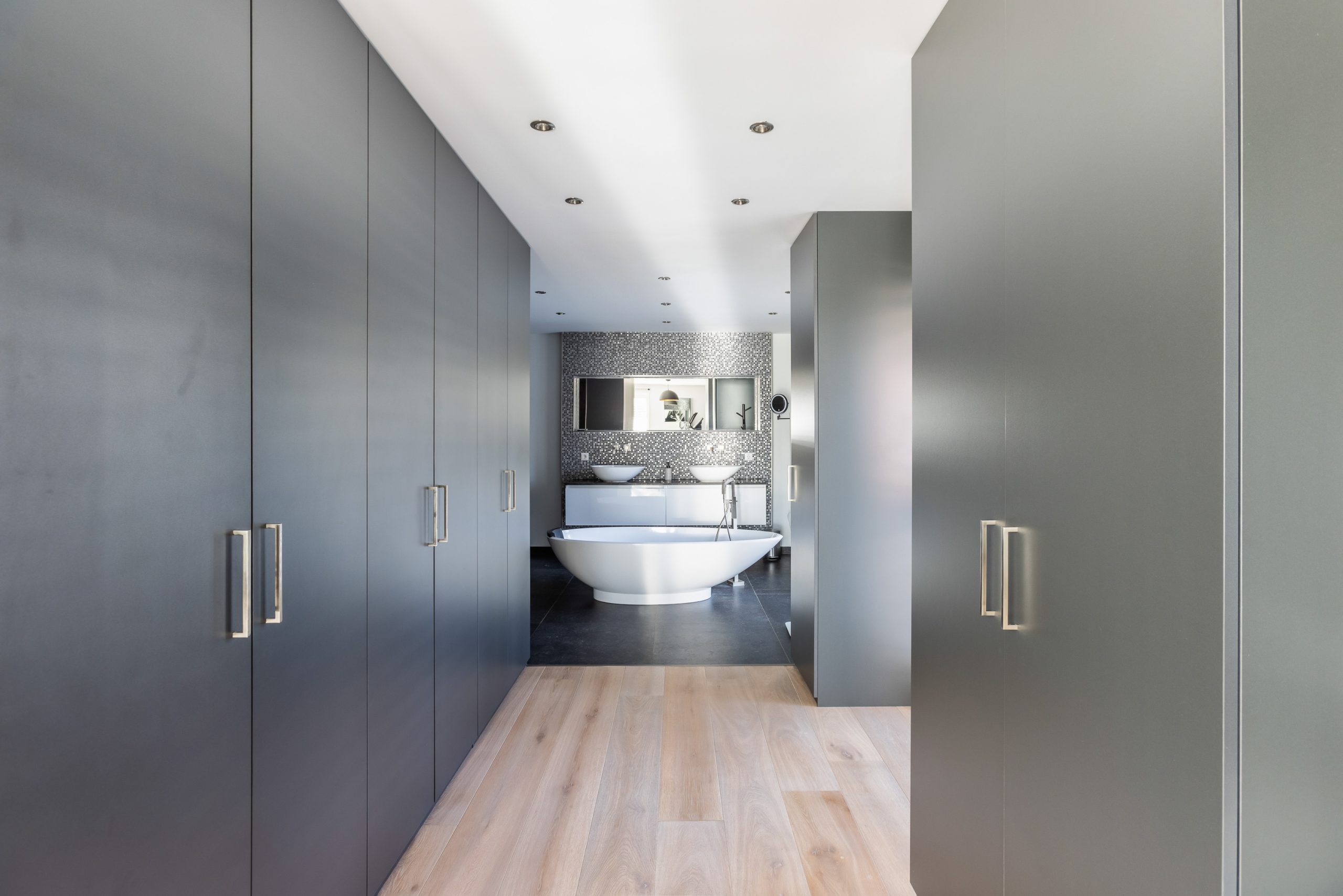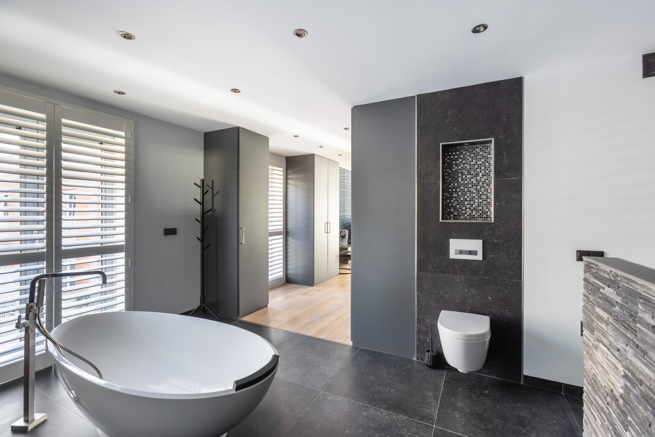 De vaste kasten en luxe badkamer zijn en-suite. De badkamer is uitgevoerd met grote zwarte tegels, inbouwspotjes en verlichte nisjes, een vrij-hangend toilet, 2 inloop-regendouches naast elkaar, 2 waskommen van vulkanisch kalksteen met meubel en een vrijstaand bad van het merk Victoria+Albert.