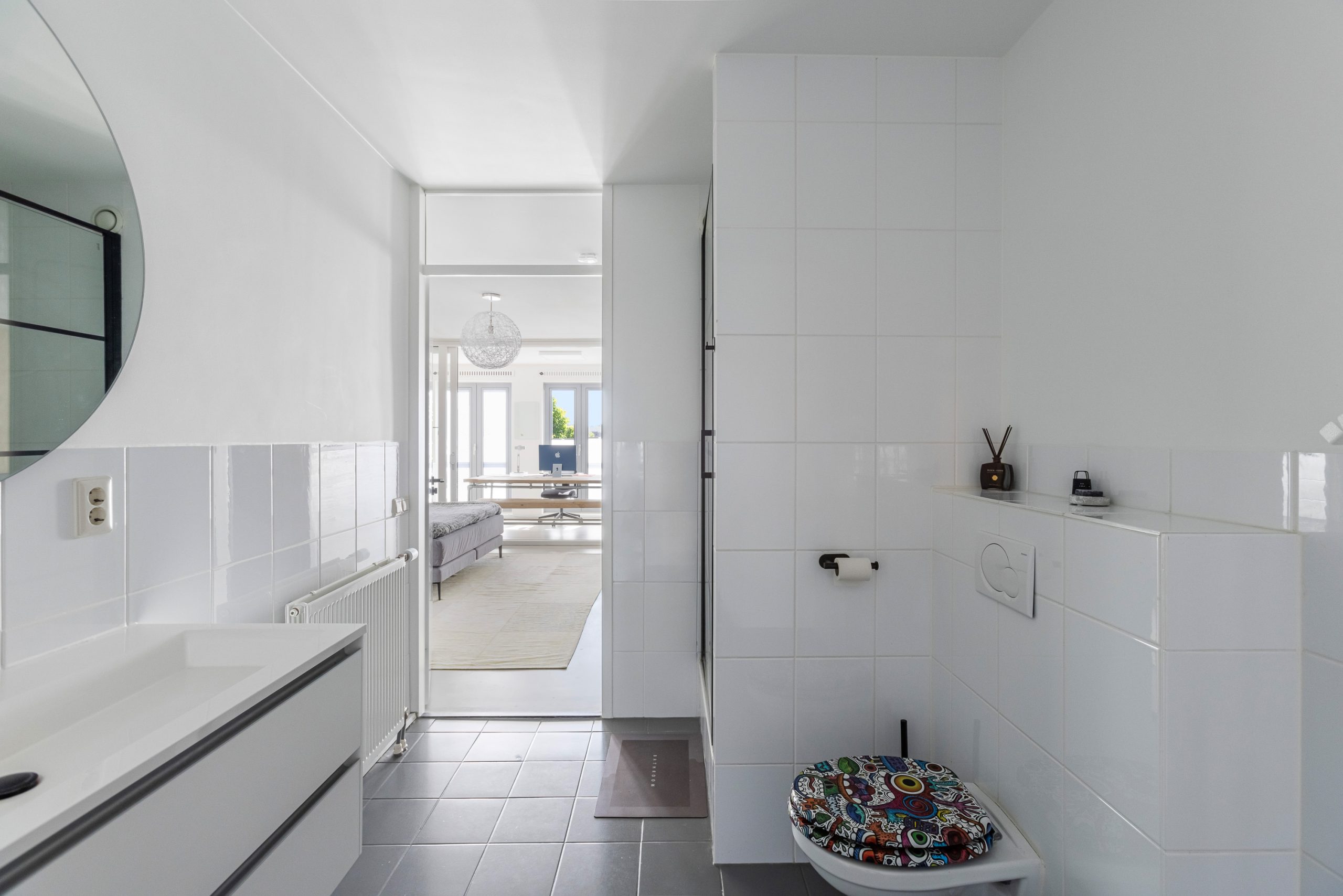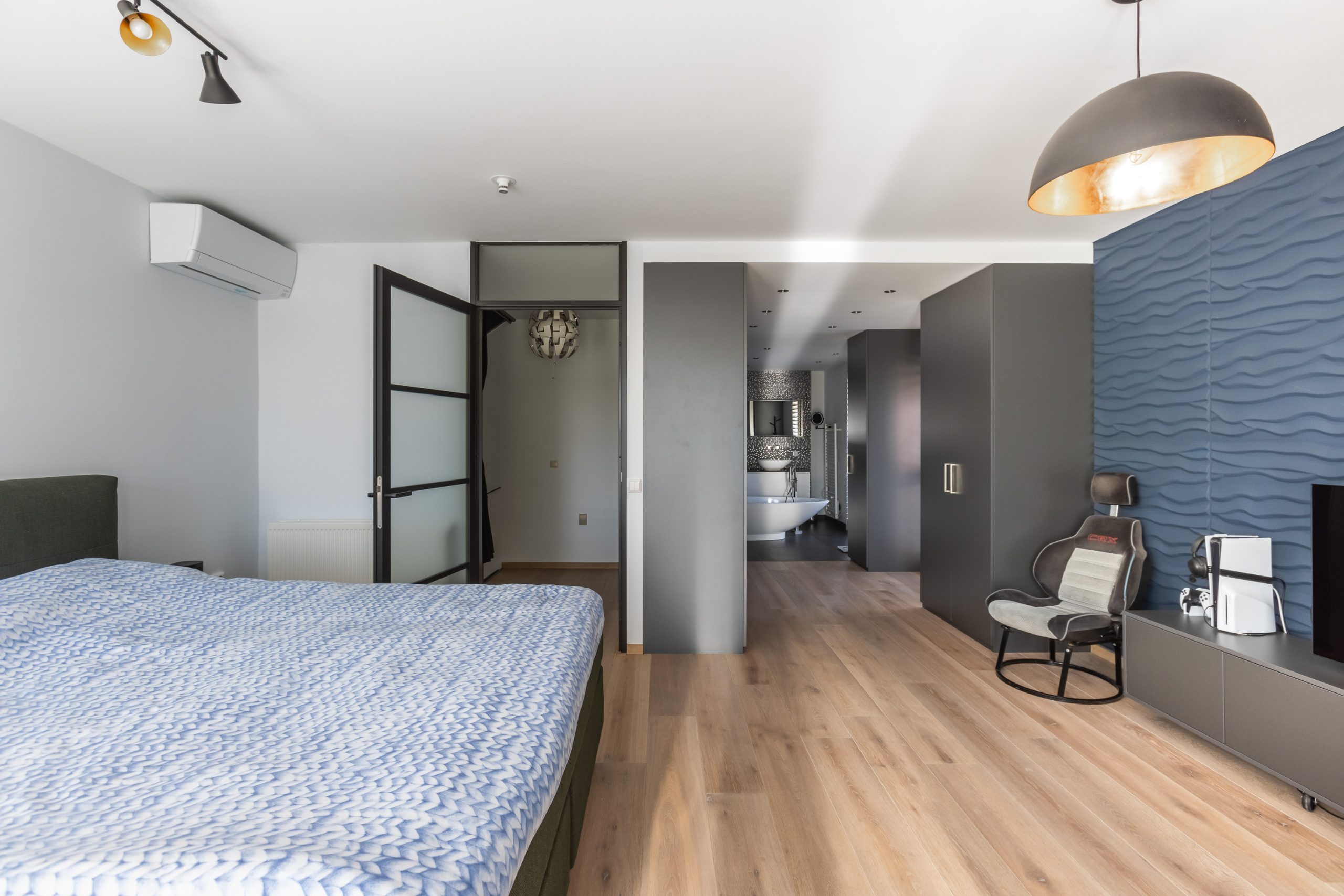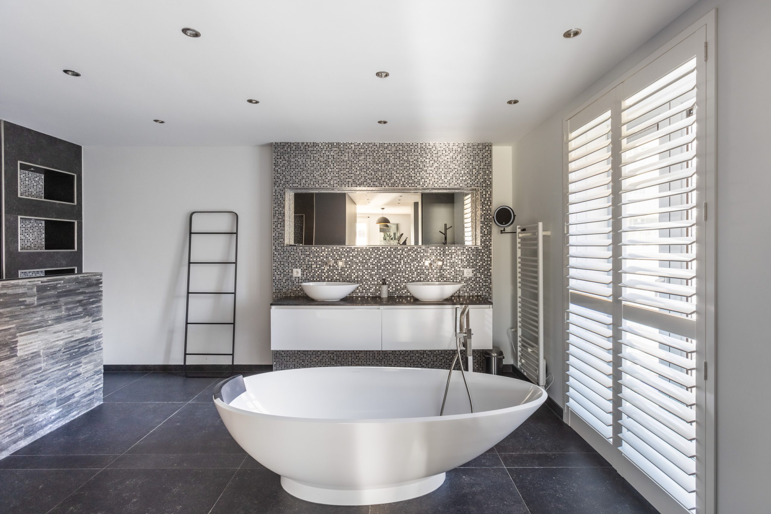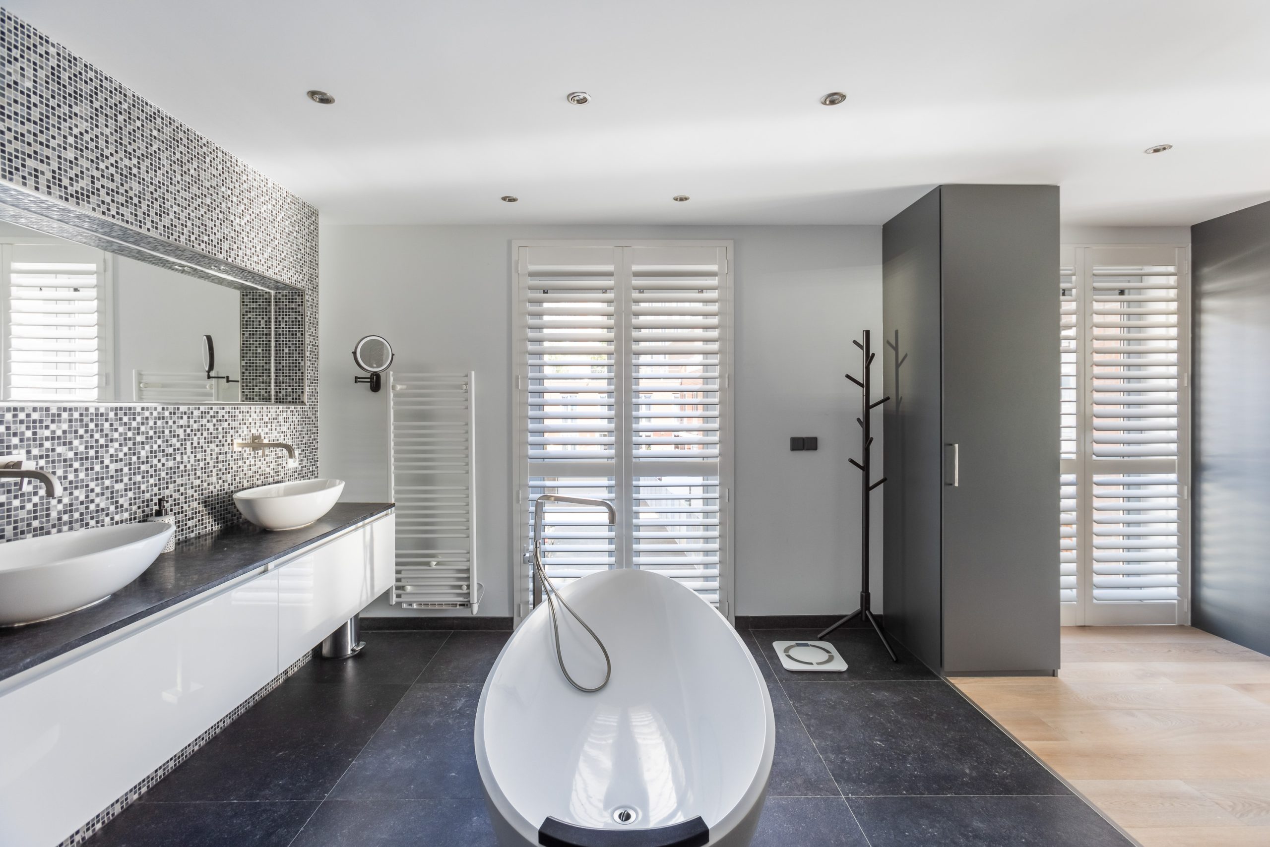 De vaste kasten en luxe badkamer zijn en-suite. De badkamer is uitgevoerd met grote zwarte tegels, inbouwspotjes en verlichte nisjes, een vrij-hangend toilet, 2 inloop-regendouches naast elkaar, 2 waskommen van vulkanisch kalksteen met meubel en een vrijstaand bad van het merk Victoria+Albert.
