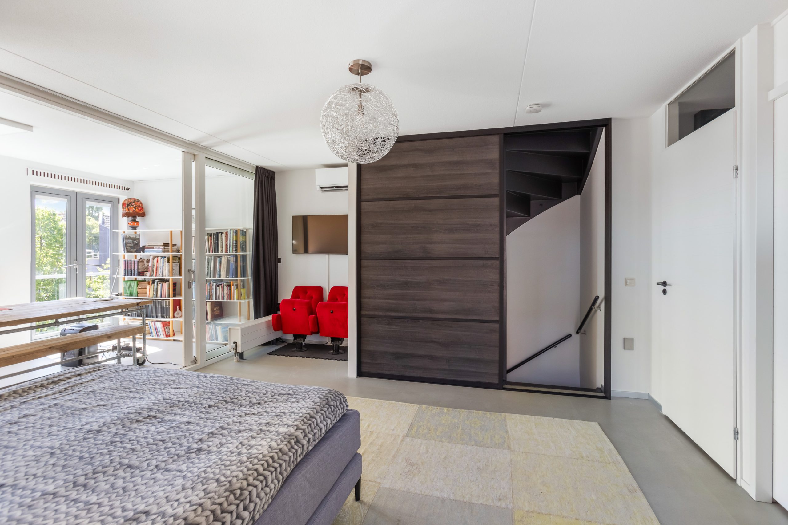 Via de schuifdeuren voor het trappengat kom je in een enorm grote overloop welke nu in gebruik is als extra slaapkamer. Er zit een groot raam en Frans balkon. Middels een schuifpui is een aparte ruimte bereikbaar die nu dienst doet als kantoor maar dit kan ook een slaapkamer zijn, een toffe gym of een speelkamer.