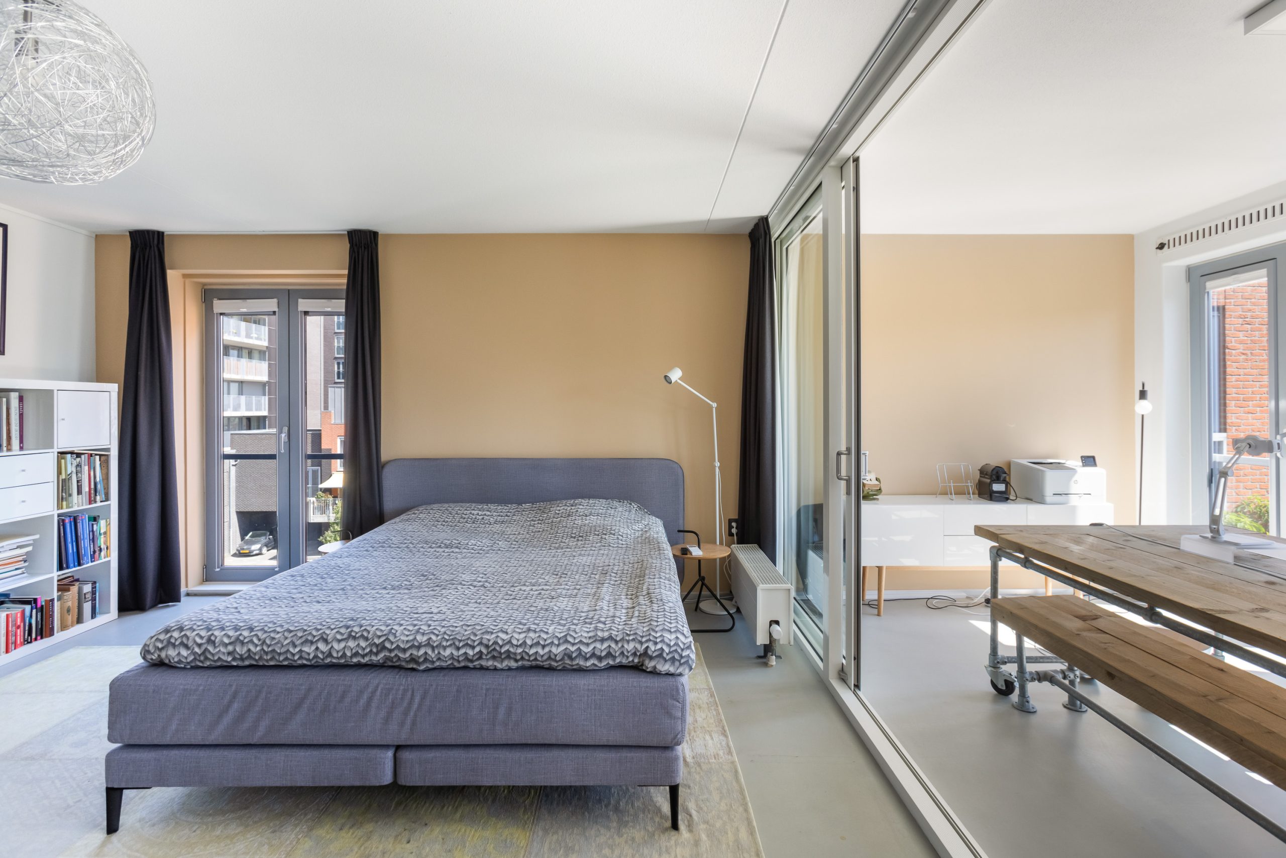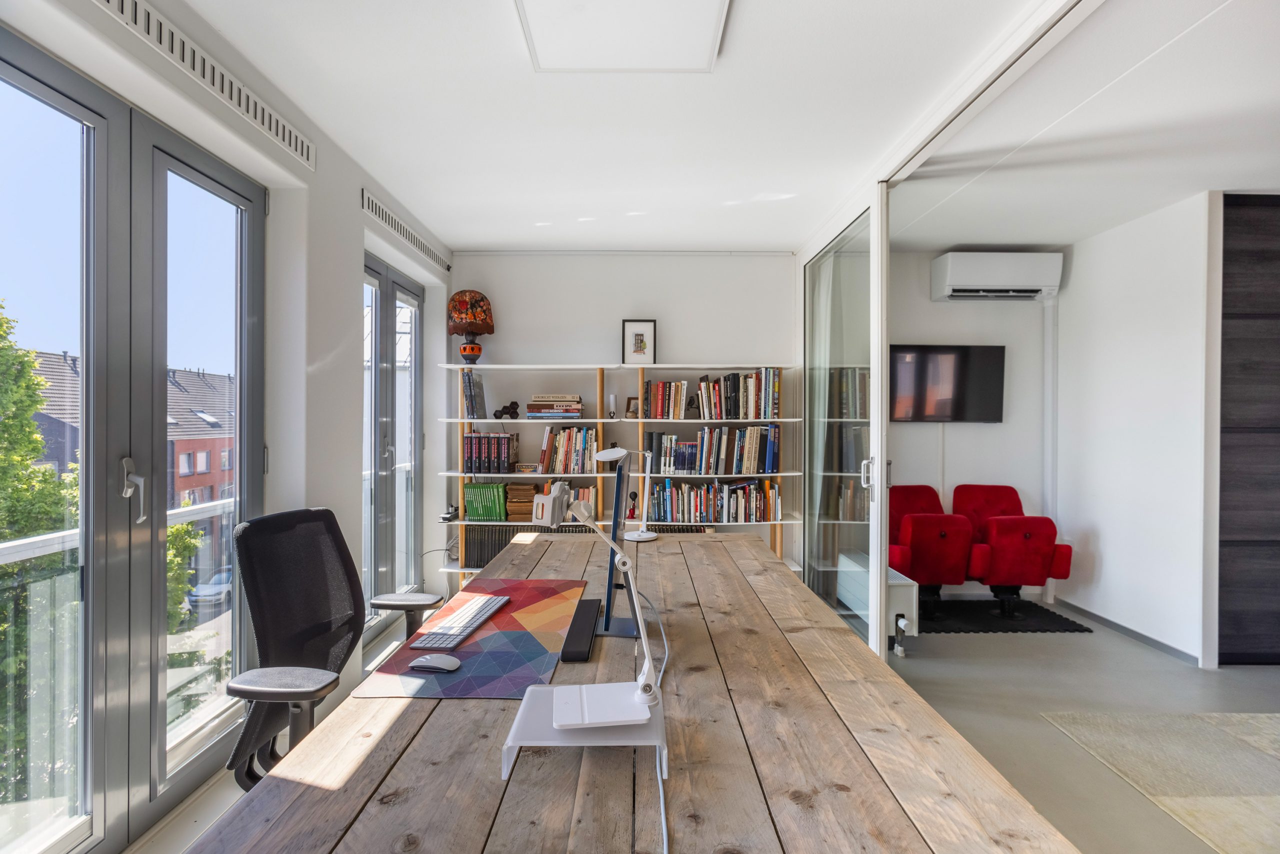 Lichte kamer aan voorzijde, een ideaal thuiskantoor of hobbykamer! De kamer is voorzien van grote raampartijen, stucwerk wandafwerking en een strakke gietvloer.