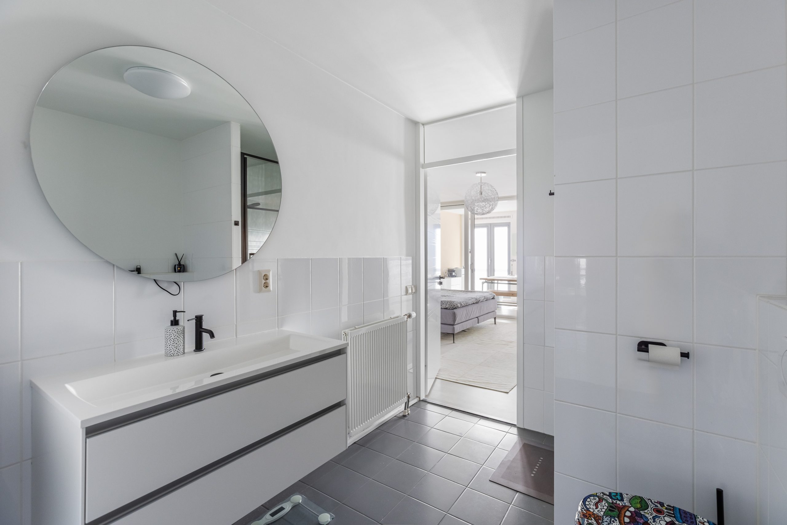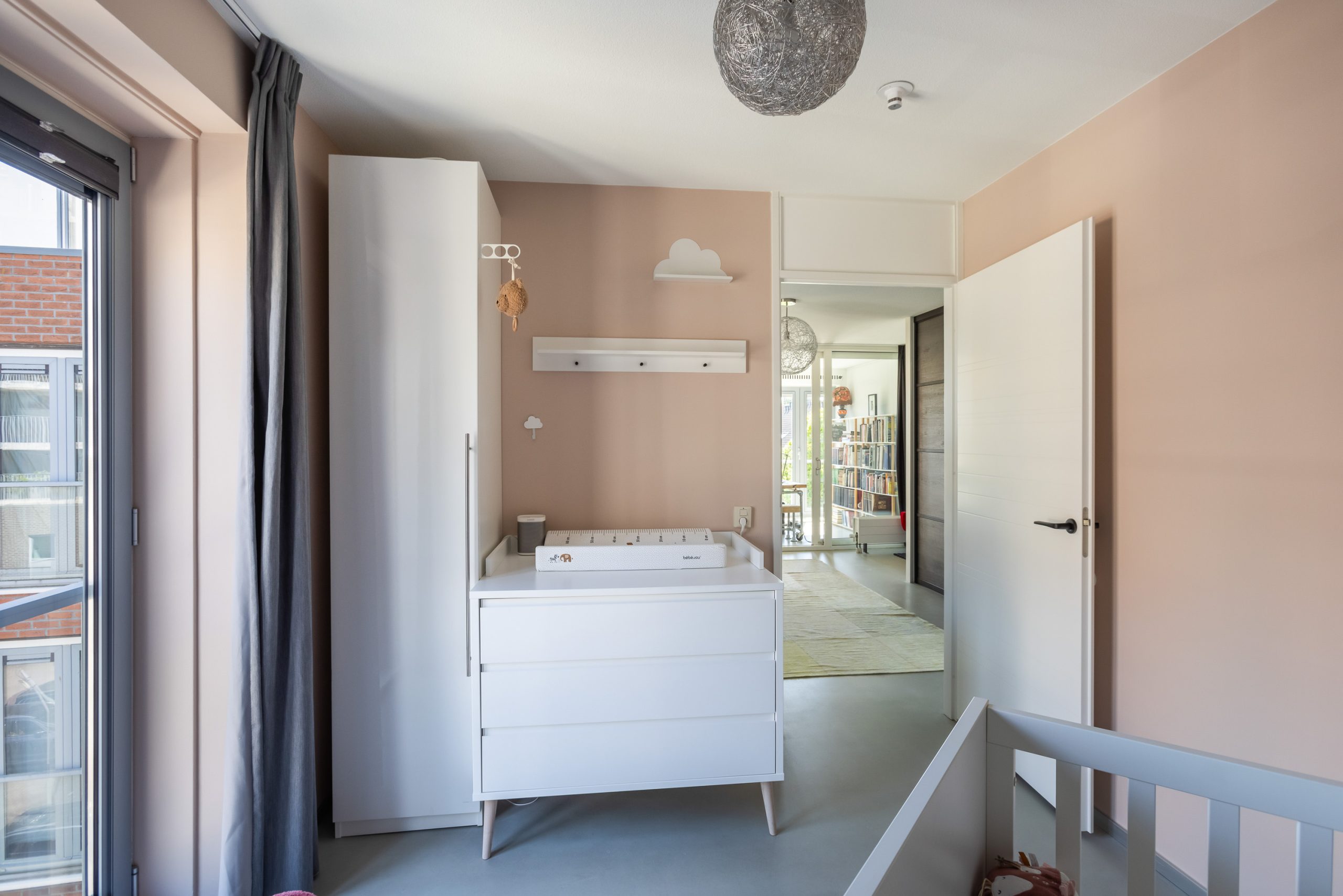 Vanuit de overloop/slaapkamer is een deur naar de tweede badkamer met douche, wastafel en meubel, vrijhangend toilet en opstelling voor wasmachine en droger. Gedeeltelijk betegelde wanden. En ook vanuit de slaapkamer is de deur naar nog een slaapkamer wat nu de babykamer is met raam en Frans balkon.