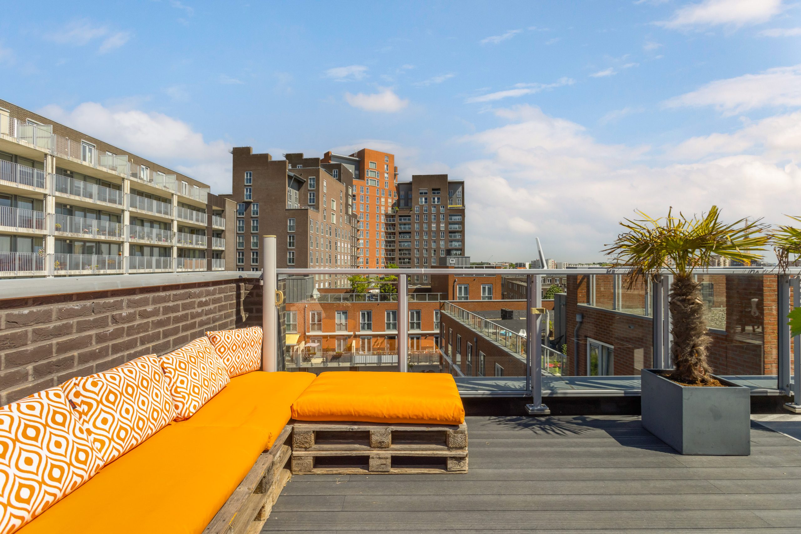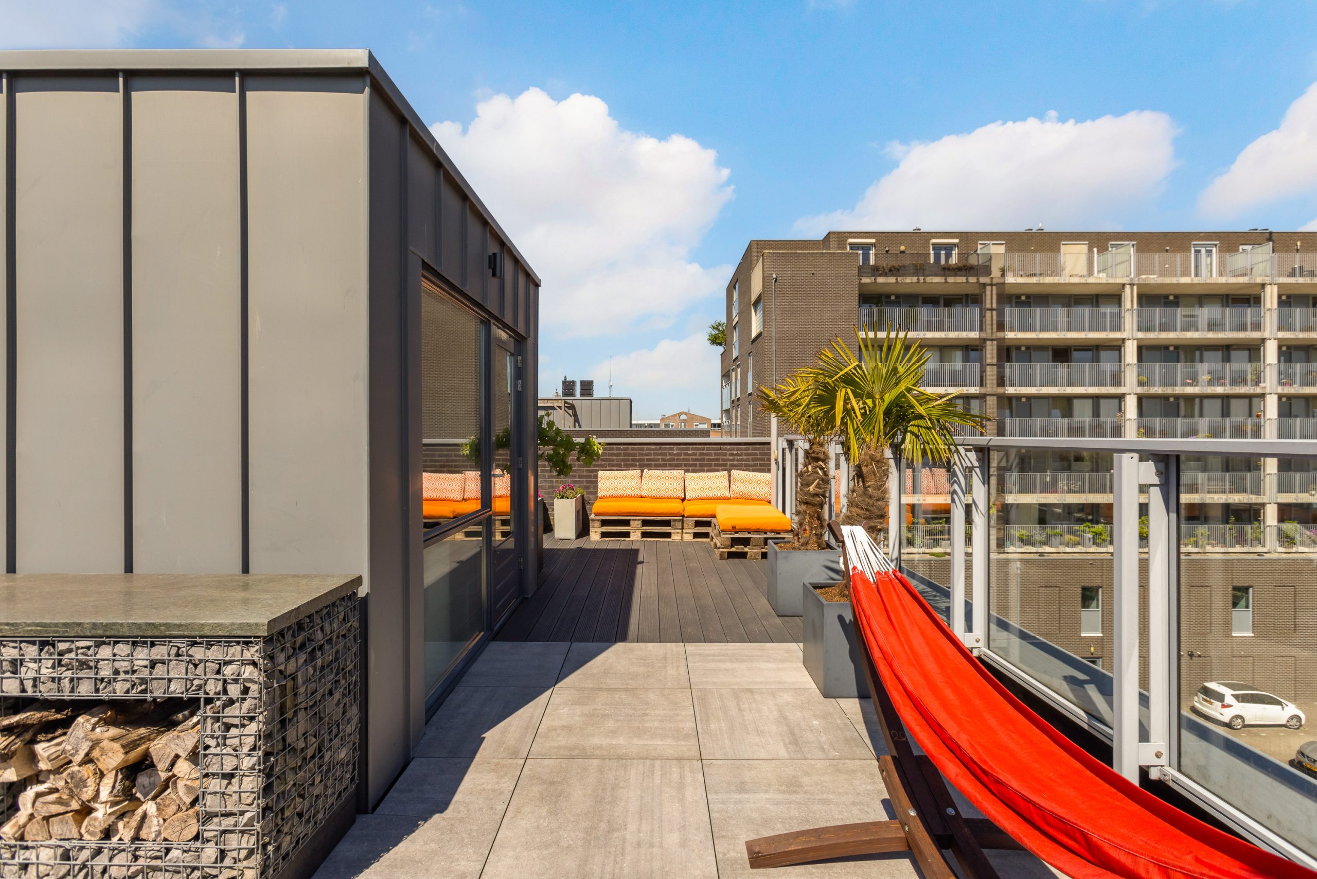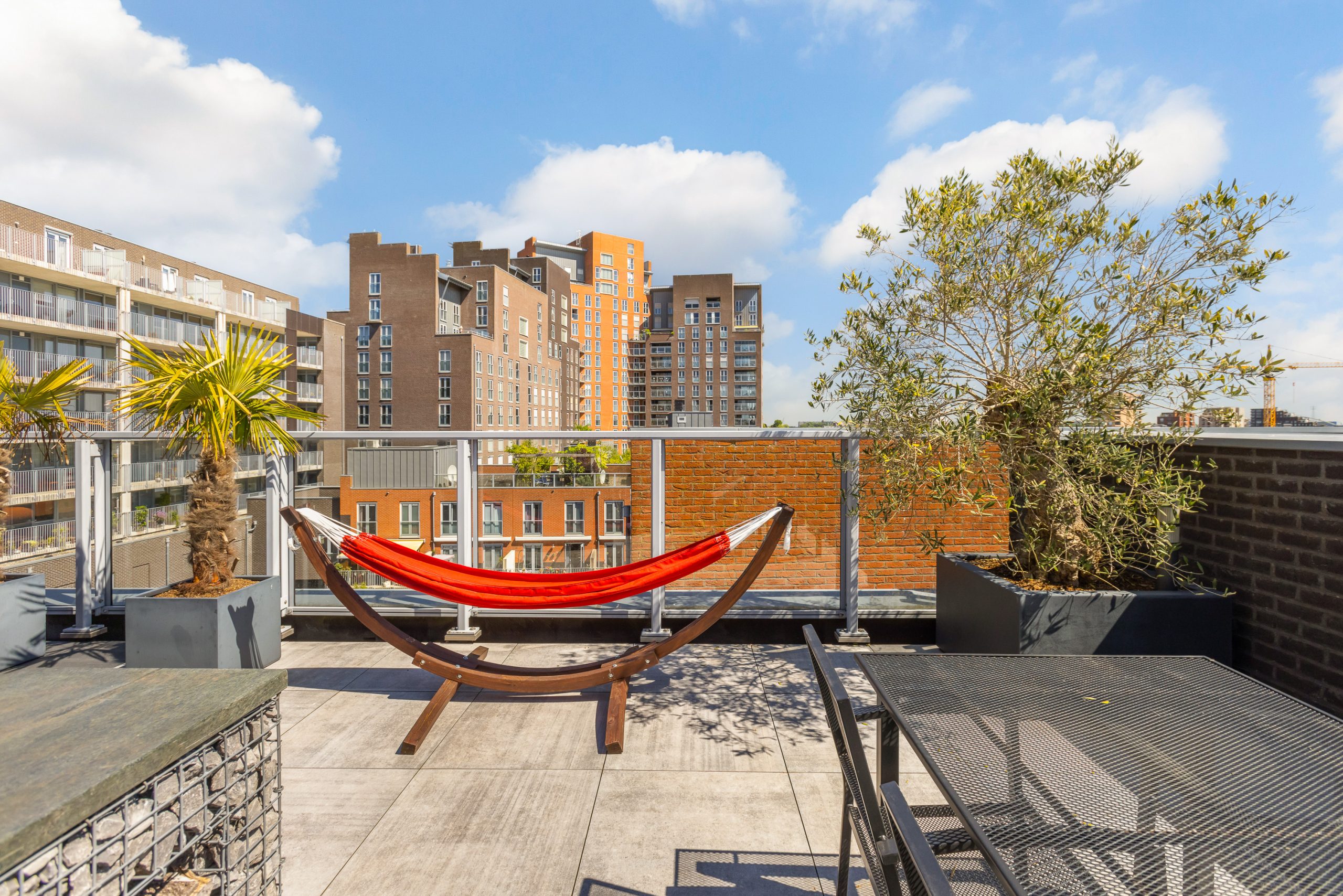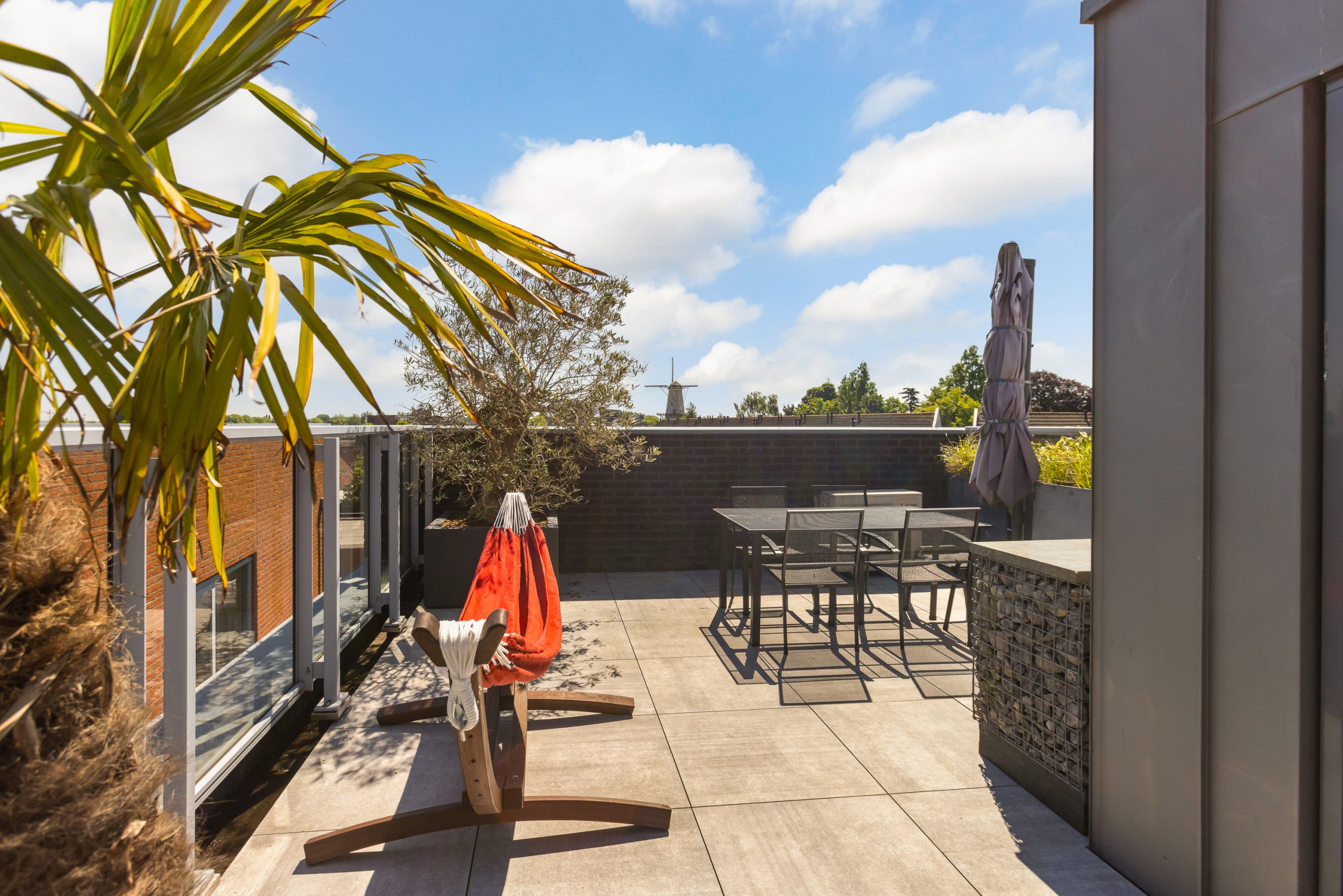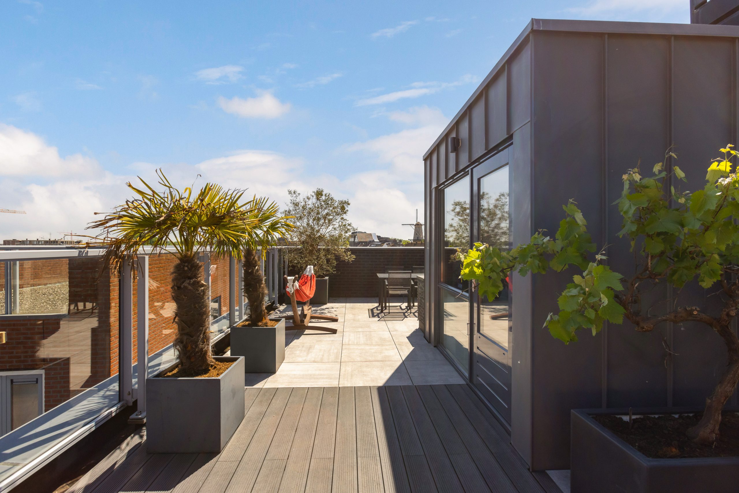 Dakterras is voor de helft uitgevoerd met kunststof composiet vlonderplanken en deels met grote keramische tegels. Er staat een hele oude olijfboom, palmbomen, druivenrank, zware natuurstenen (BBQ) tafel met stroomaansluiting, wateraansluiting en haspel.