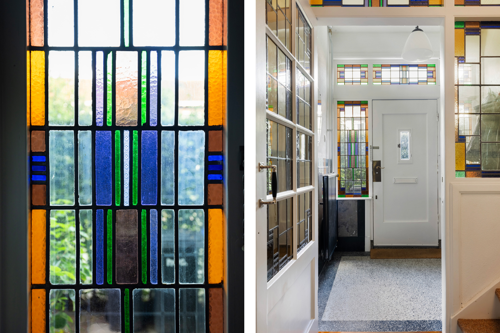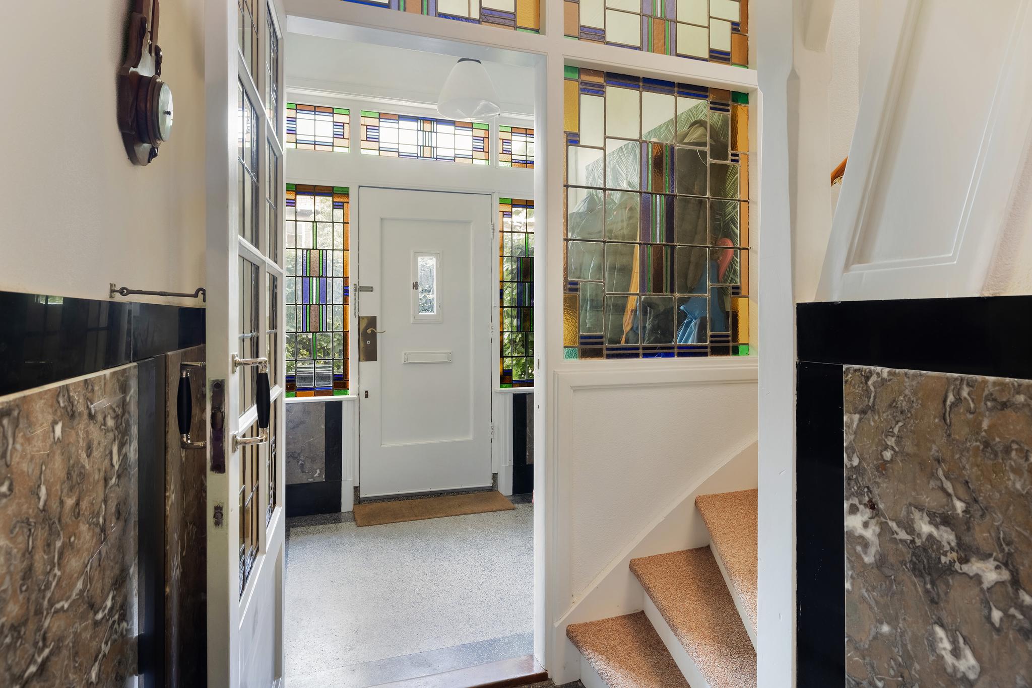 Entree in het vestibule met toegang tot de hal. De authentieke details zoals de marmeren lambrisering springen meteen in het oog!
