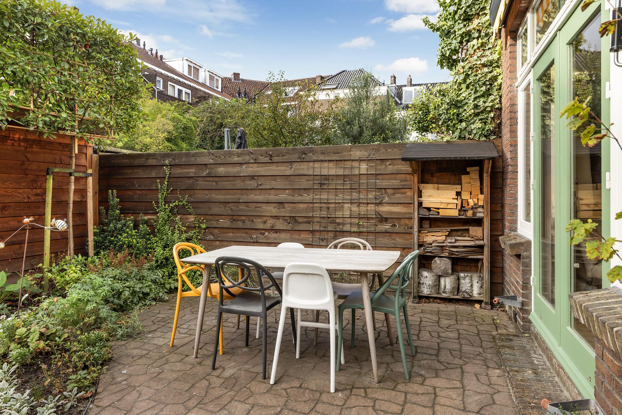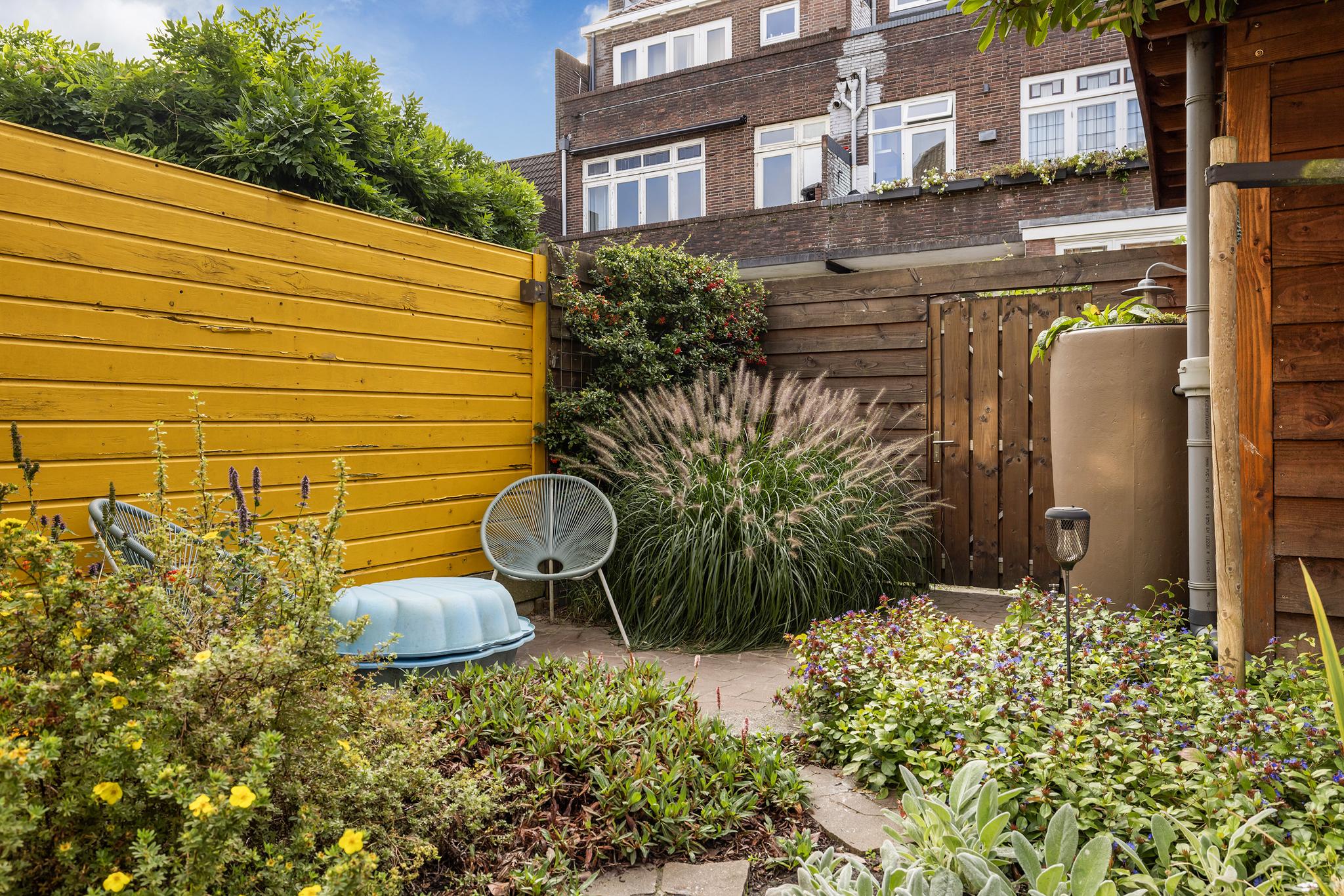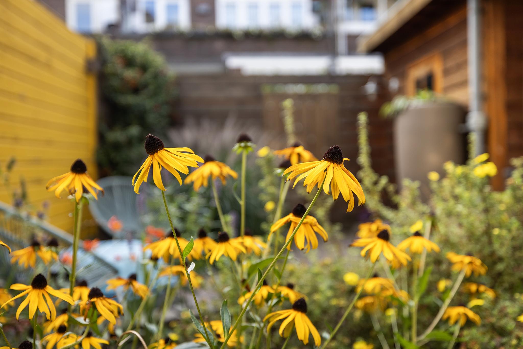 De in 2019 nieuw aangelegde stadstuin met achterom en een eigen berging is overdag heerlijk zonnig en een fijne besloten plek om te kunnen zitten.