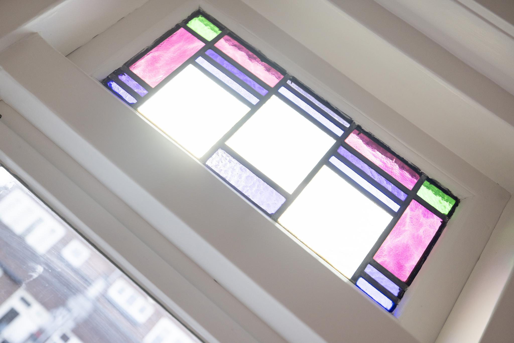 Overloop met vaste trap naar de tweede verdieping en toegang tot alle vertrekken. Alle slaapkamers zijn gekenmerkt door glas in lood ramen en hoge plafonds.