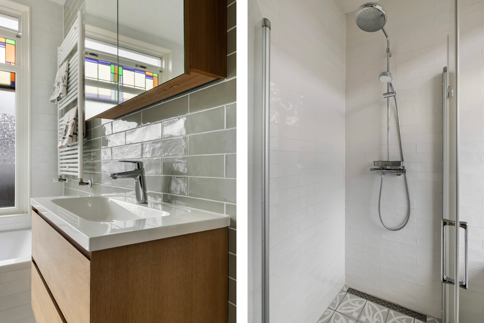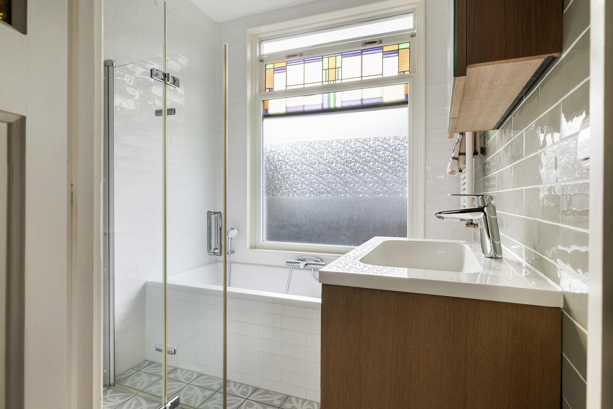 In 2018 vernieuwde badkamer met wastafel en meubel, bad, douche, geheel betegelde wanden, plafondspots en designradiator.