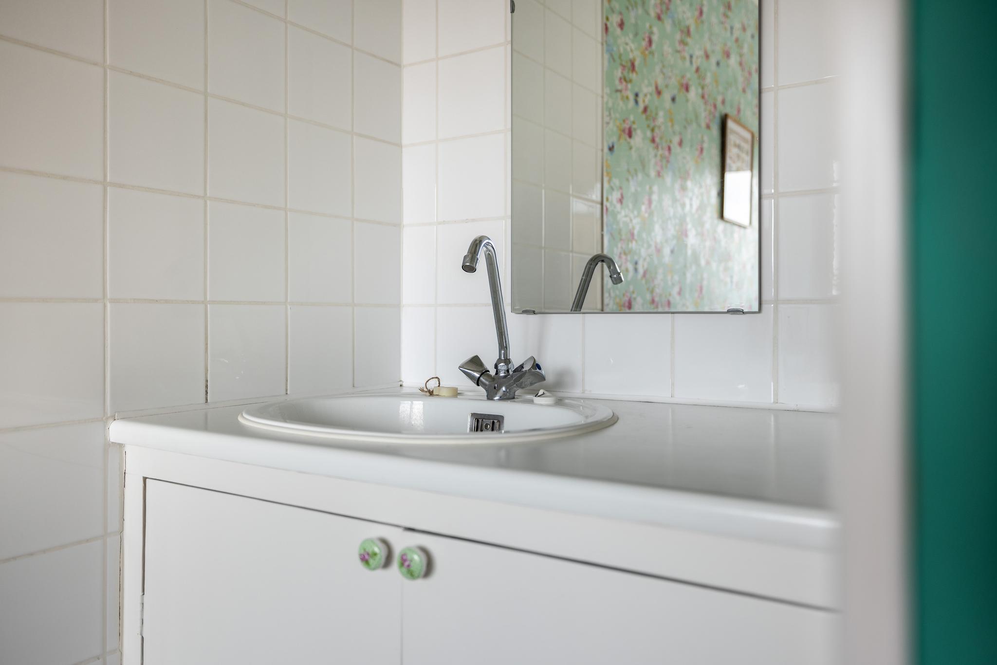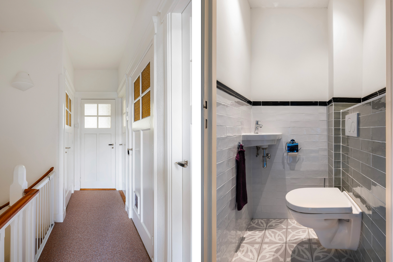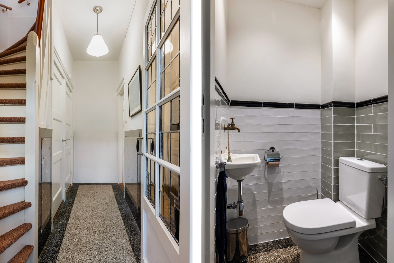 Hal met toegang naar toilet (met fonteintje), meterkast en kelder en toegang tot de woonkamer.