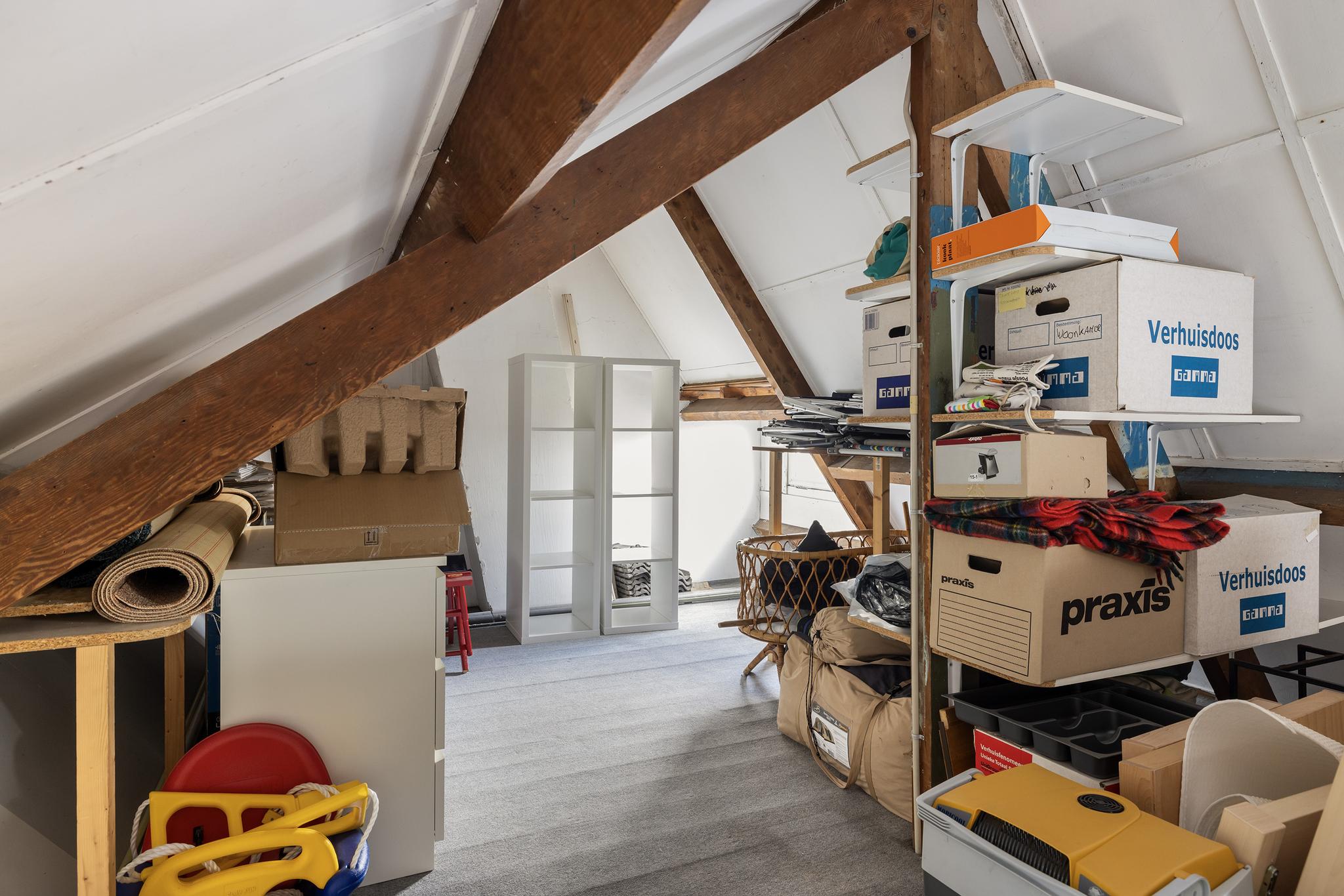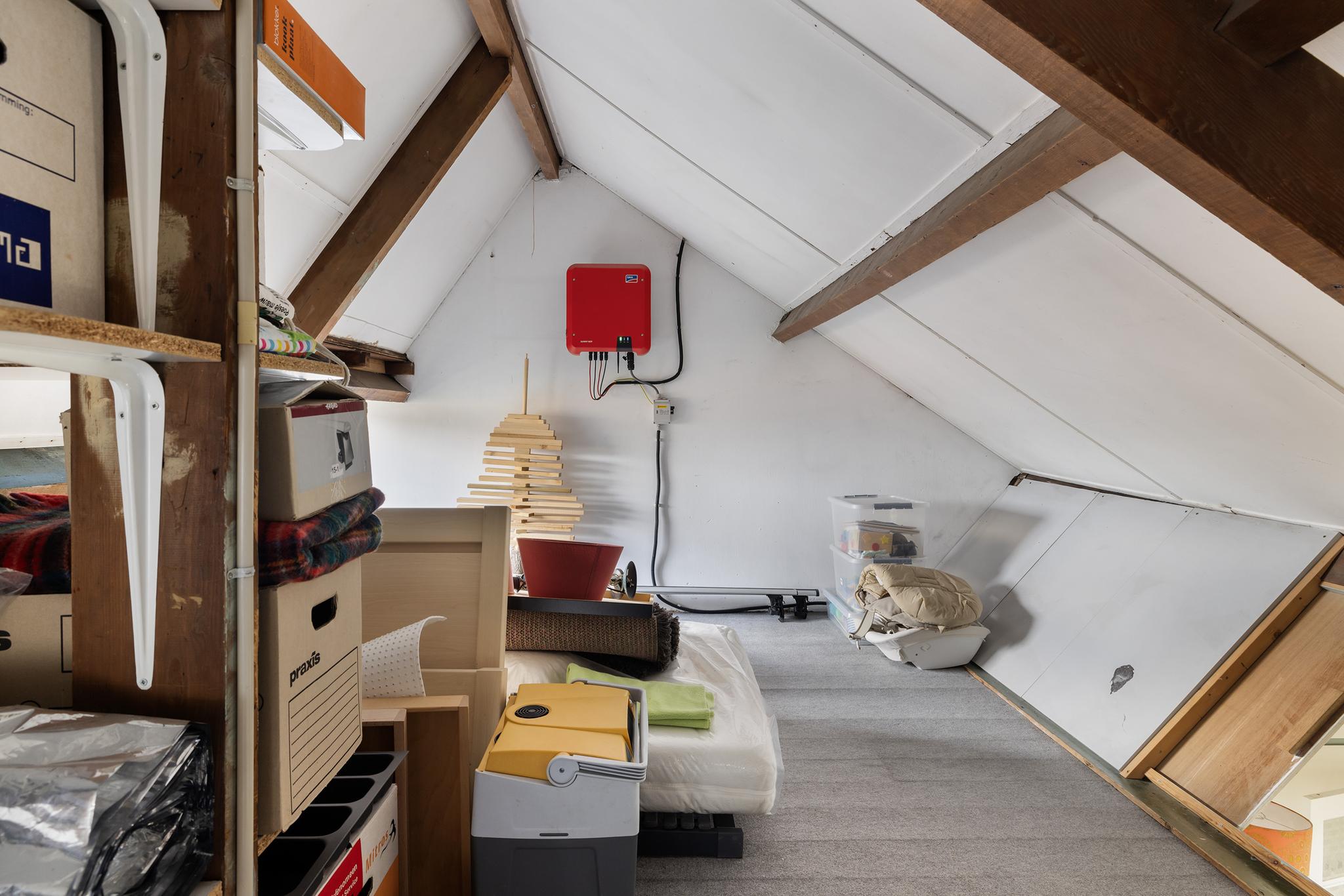 Via een vaste trap kom je op de vliering; echt een zeer goede ruimte met stahoogte om spullen op te bergen. Er zitten 2 kleine dakkappelen (de enige ramen met enkel glas bevinden zich hier)