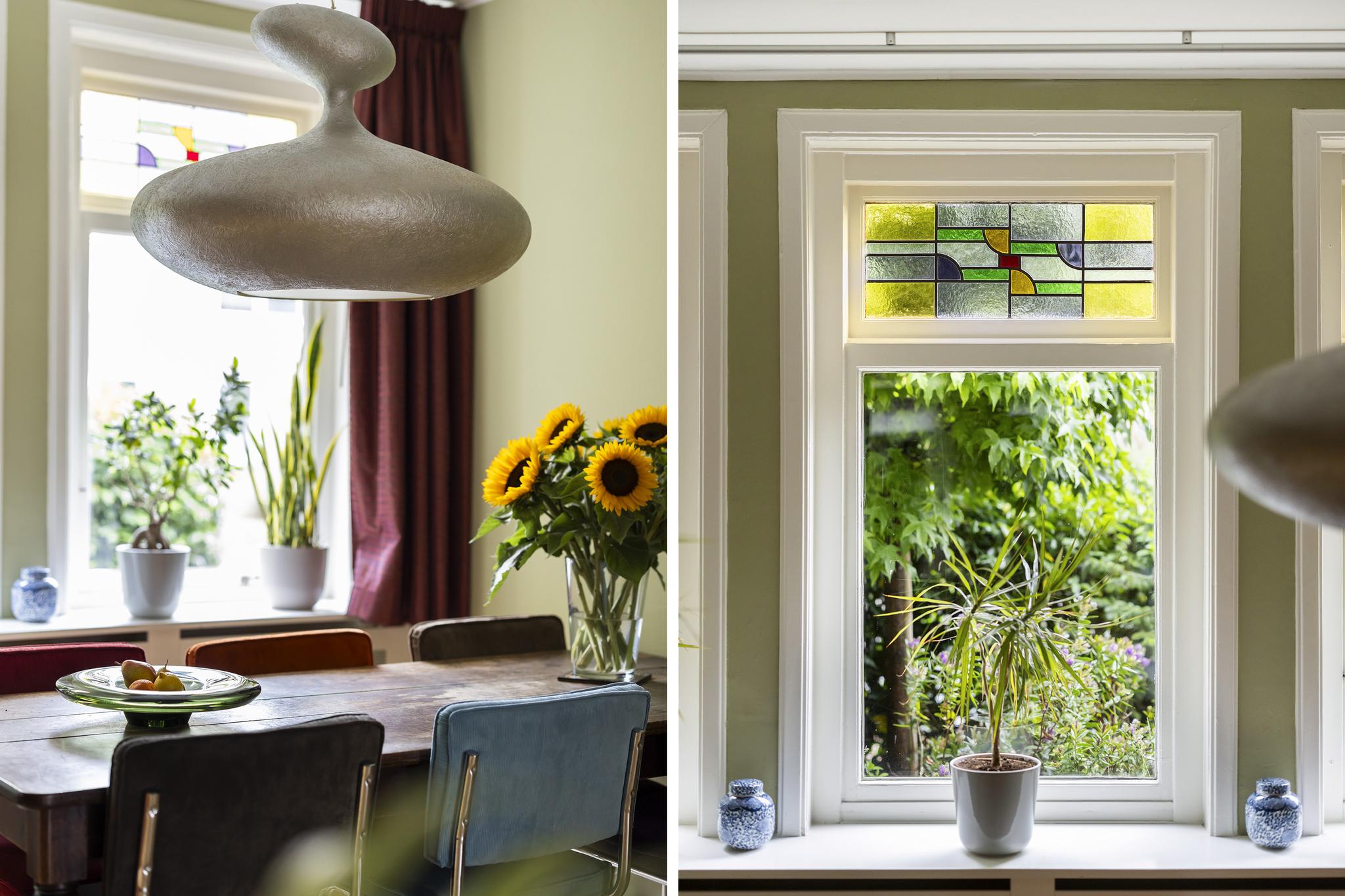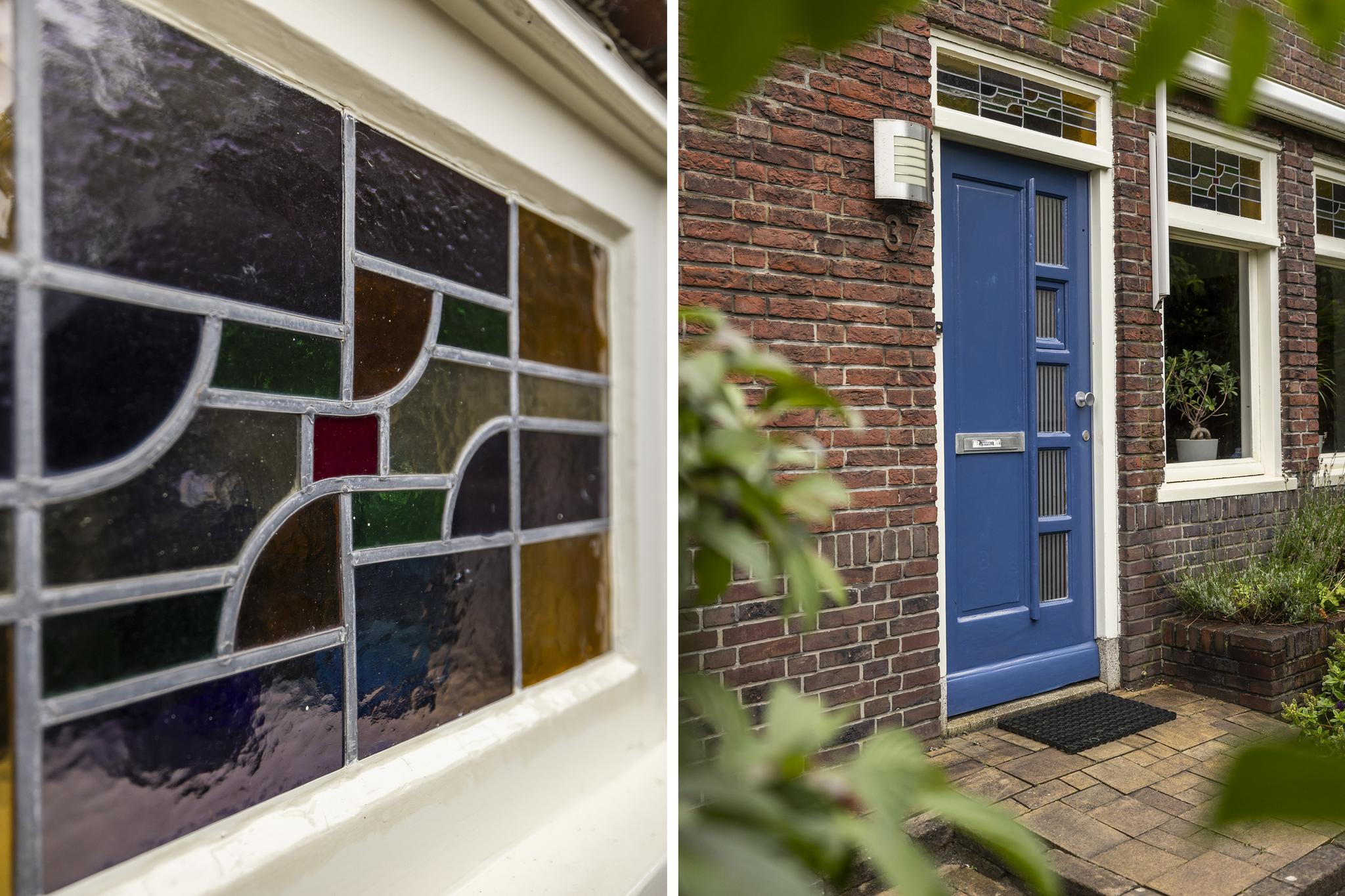 Prachtige jaren '30 details: glas-in-lood ramen, paneeldeuren.