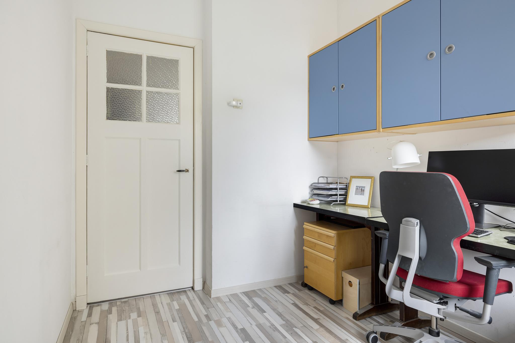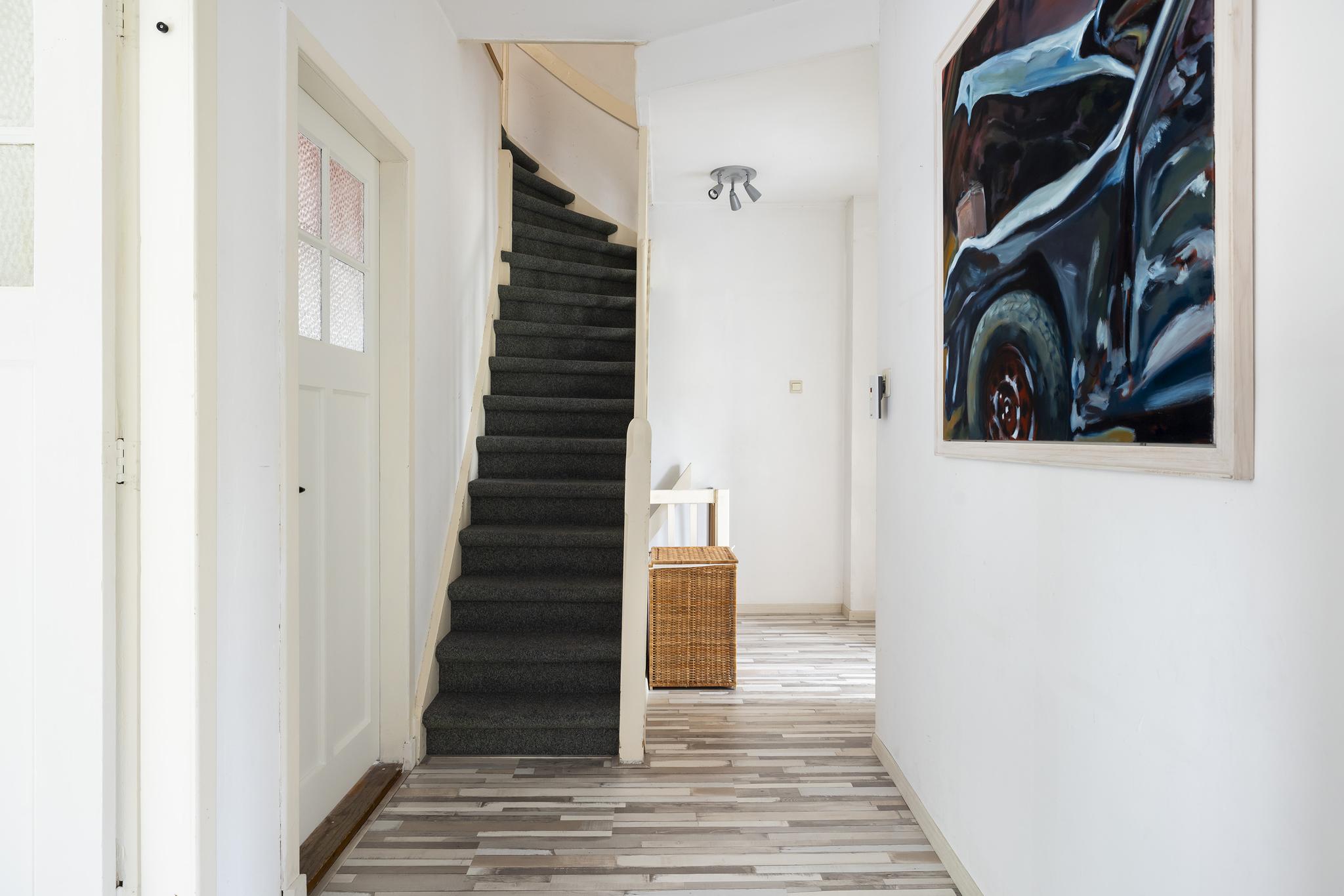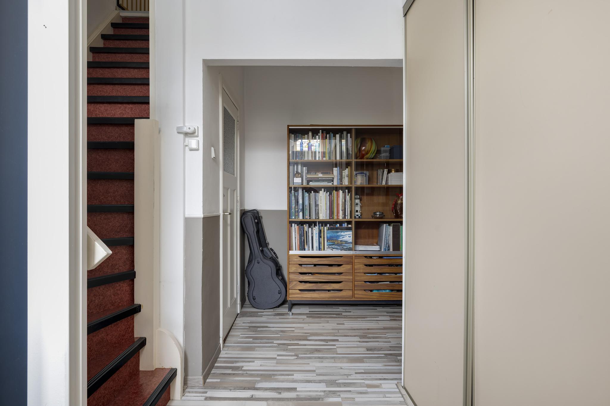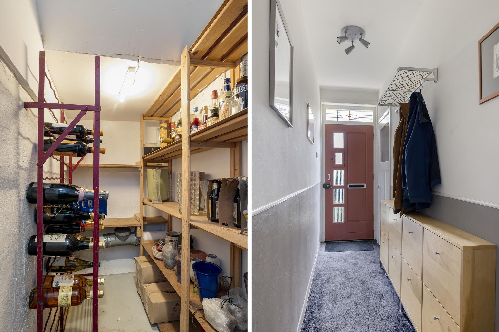 Hal, meterkast, fijne kelderkast en toegang tot woonkamer en keuken. Aan het einde van de hal linksaf vinden we nog een verlengde van de hal, een grote ruimte met vaste schuifkastenwand, toilet en de trap naar de eerste verdieping. Dit is een perfecte ruimte voor een werkplek, hobbyhoek of speelruimte voor de kinderen.