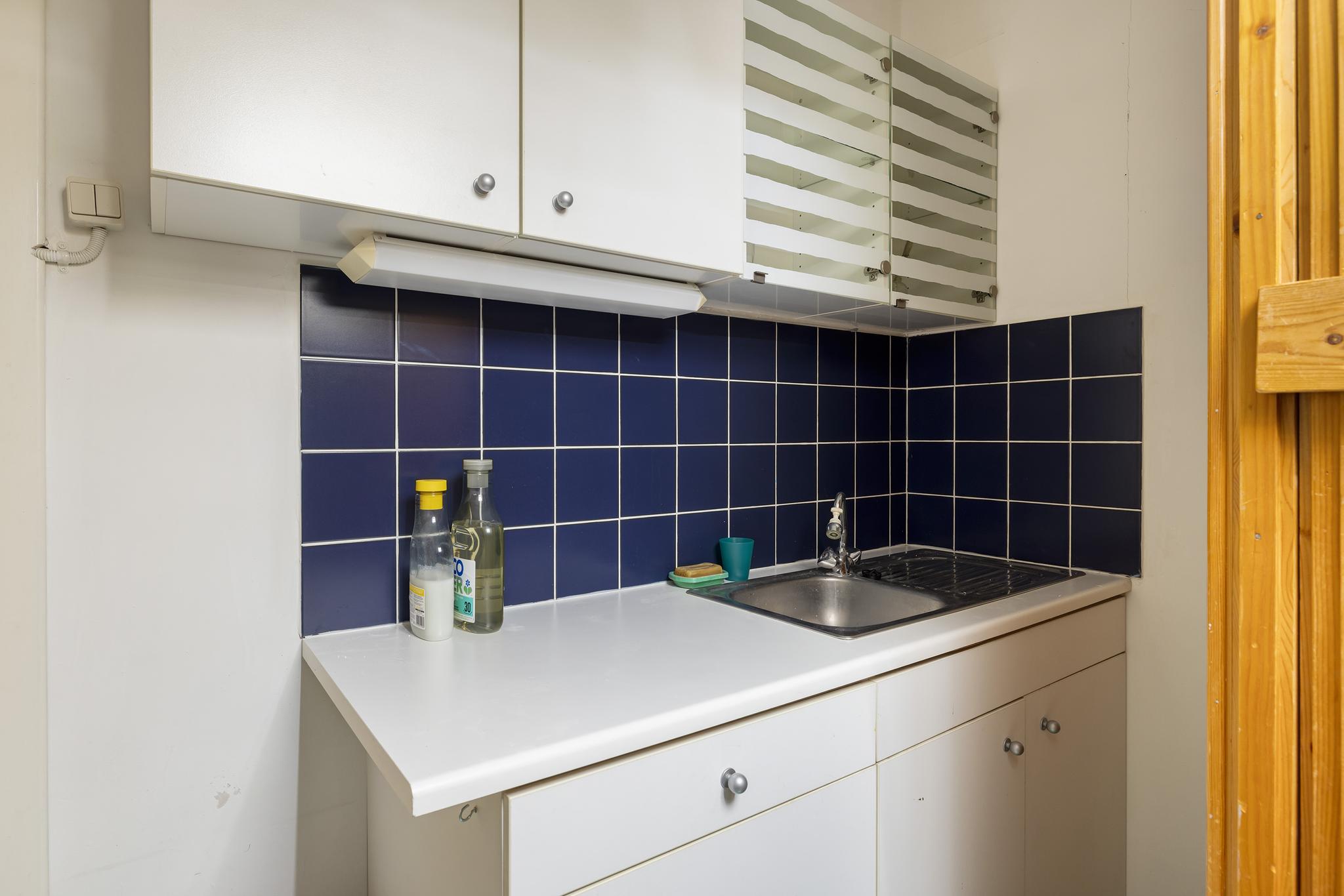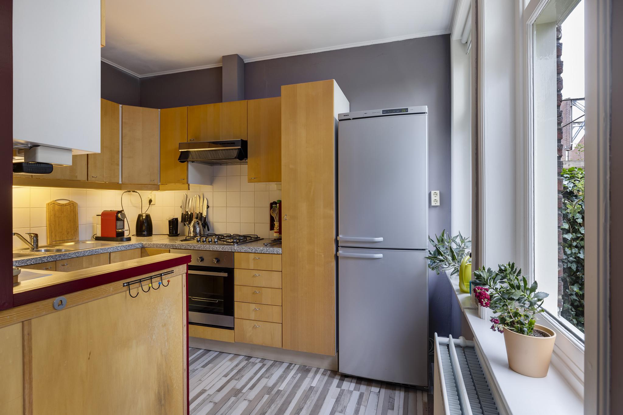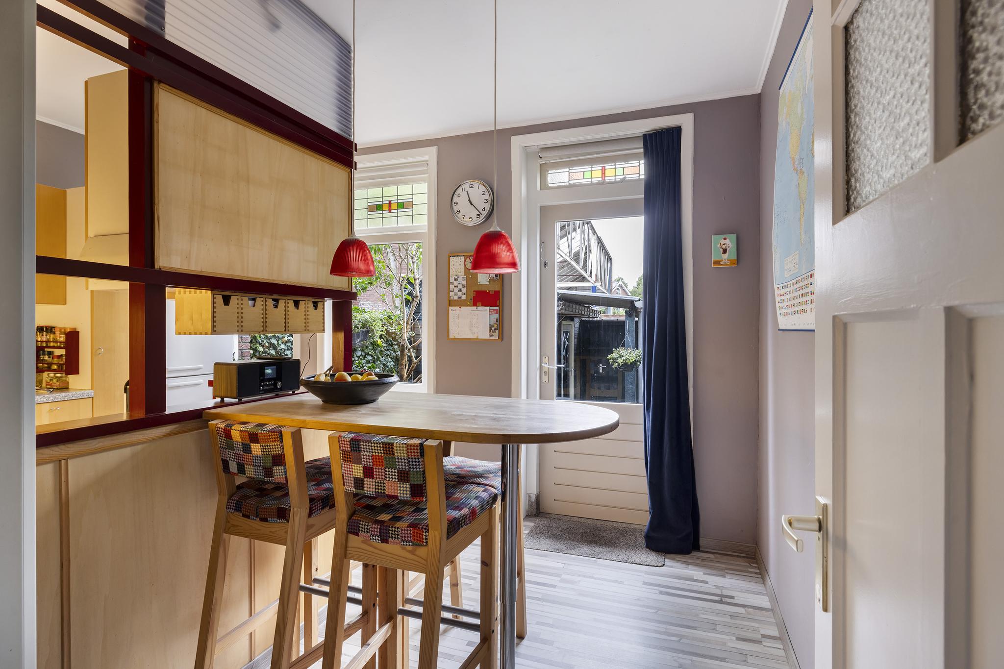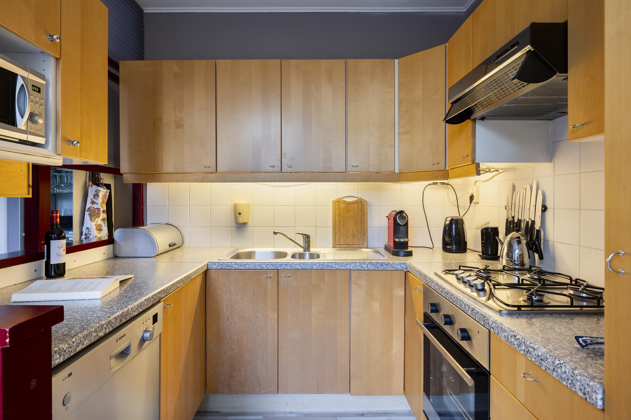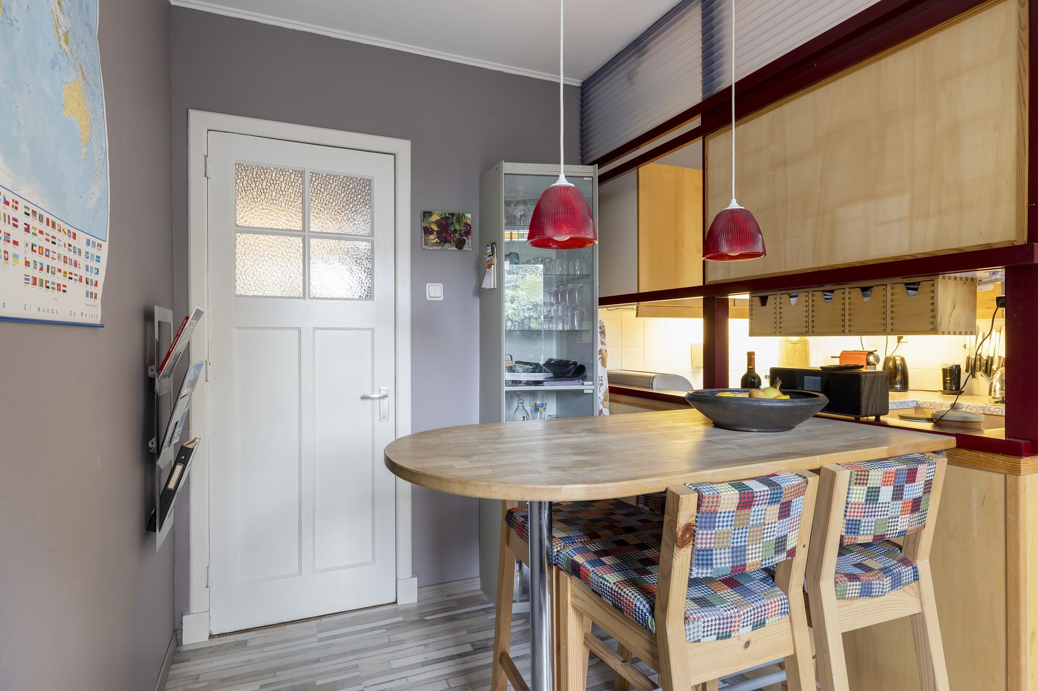 Ook de keukenruimte is van een groot formaat en biedt momenteel plaats voor een keuken in U-opstelling met gaskookplaat, afzuigkap, oven, vaatwasser, losse koel/vries combinatie, 1,5 spoelbak en aangrenzend een bartafel. Vanuit de keuken is de achtertuin bereikbaar.