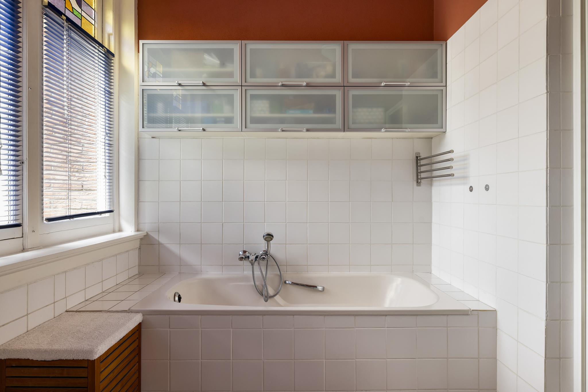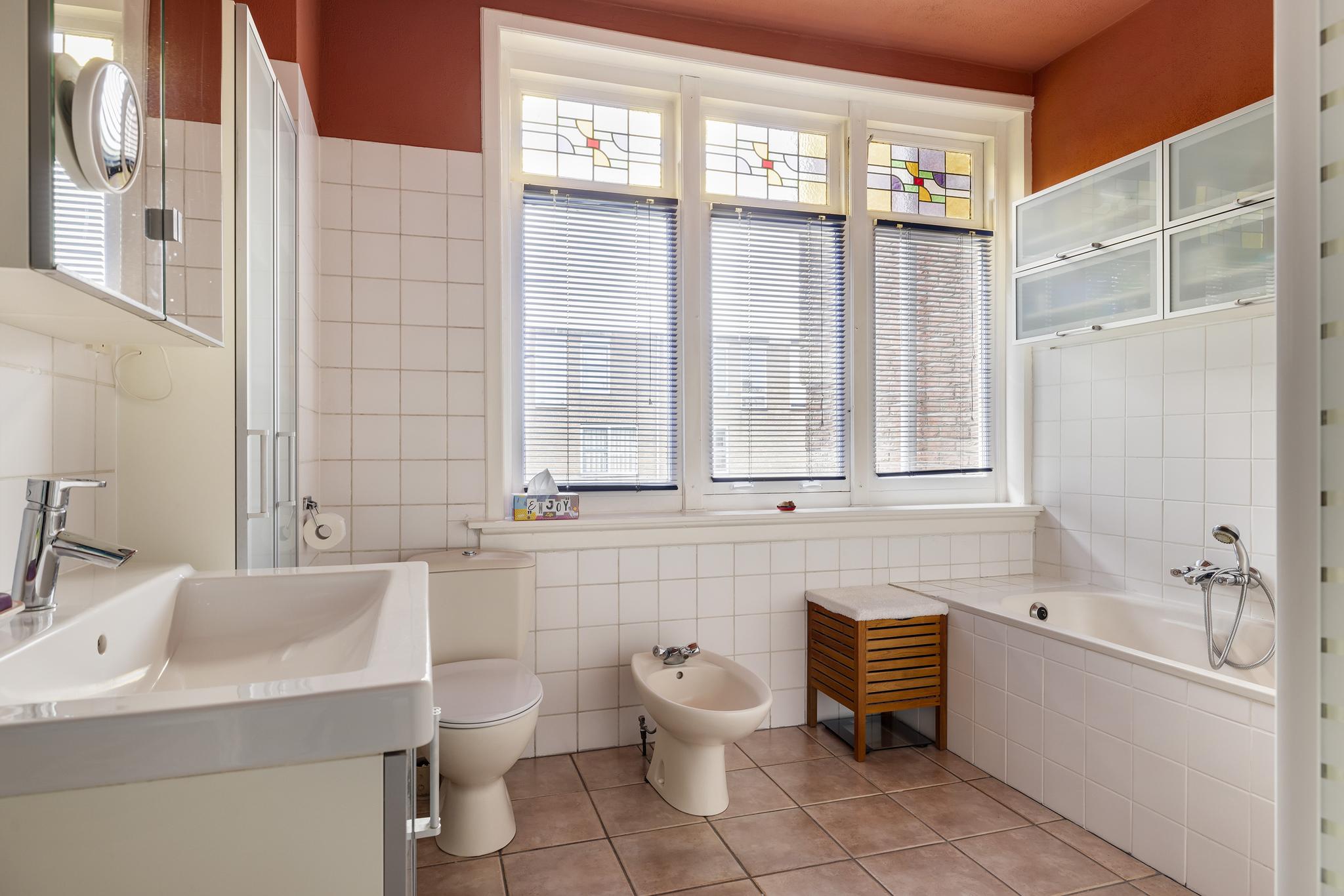 Grote badkamer (geheel betegeld) met een ligbad, aparte douche, brede wastafel, toilet en bidet. Ook de badkamer is voorzien van prachtige glas-in-lood ramen.