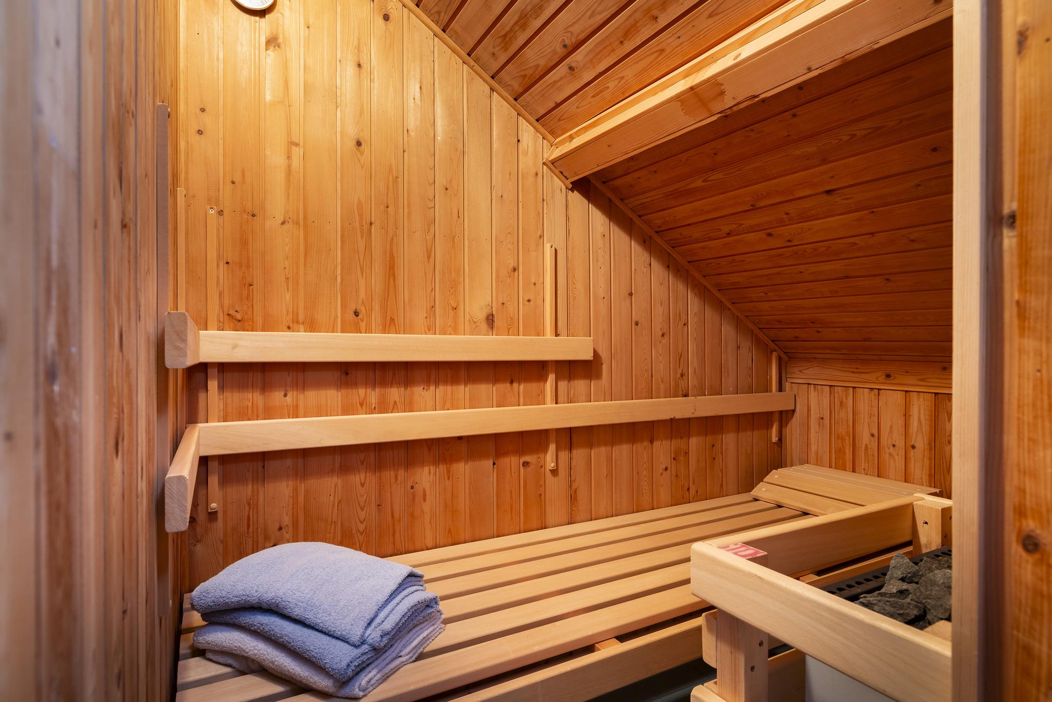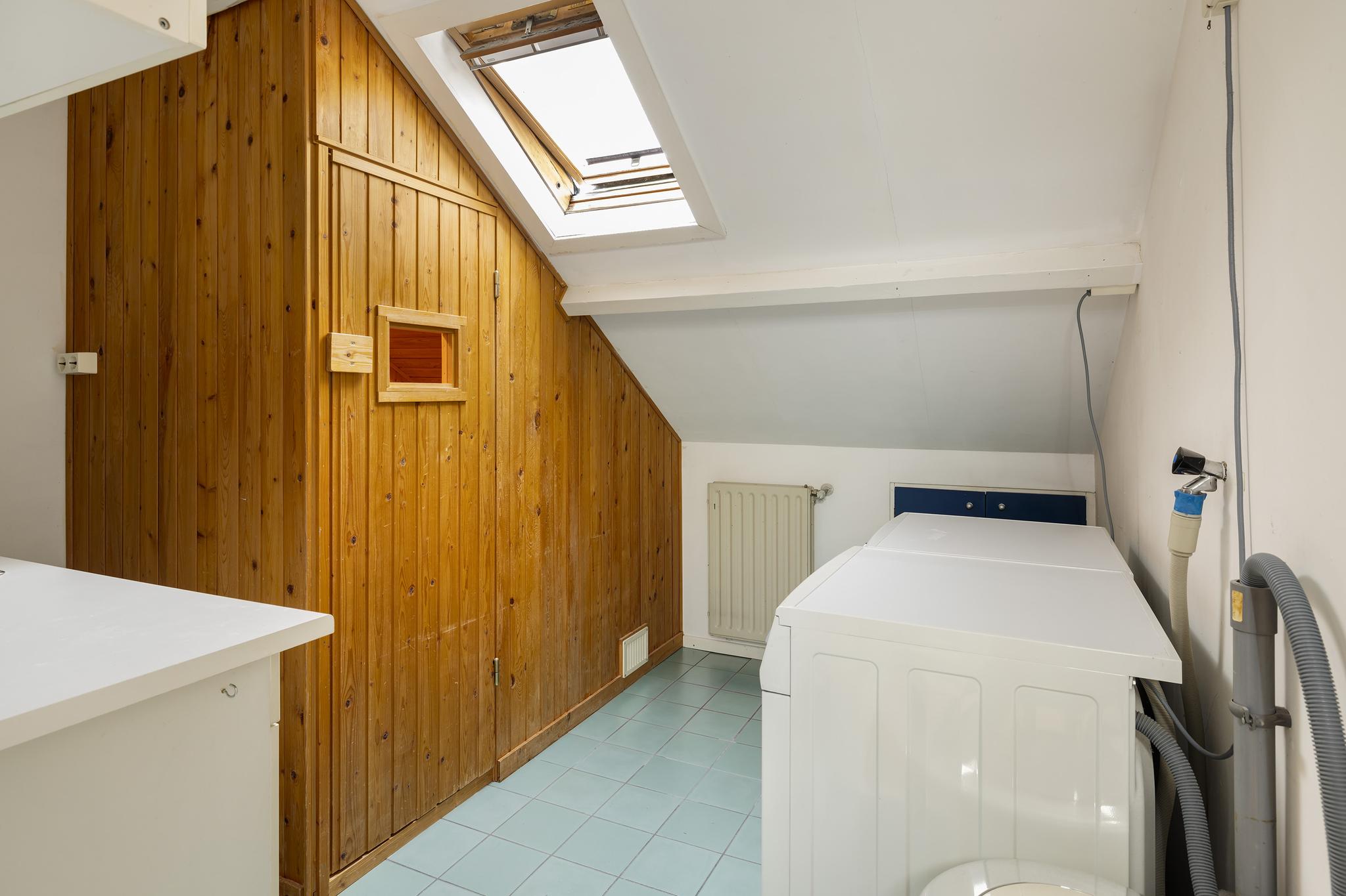 Wasruimte met keukenblok met spoelbak, wasaansluiting, tweepersoons sauna en dakraam. Deze ruimte leent zich goed om een tweede badkamer te realiseren!