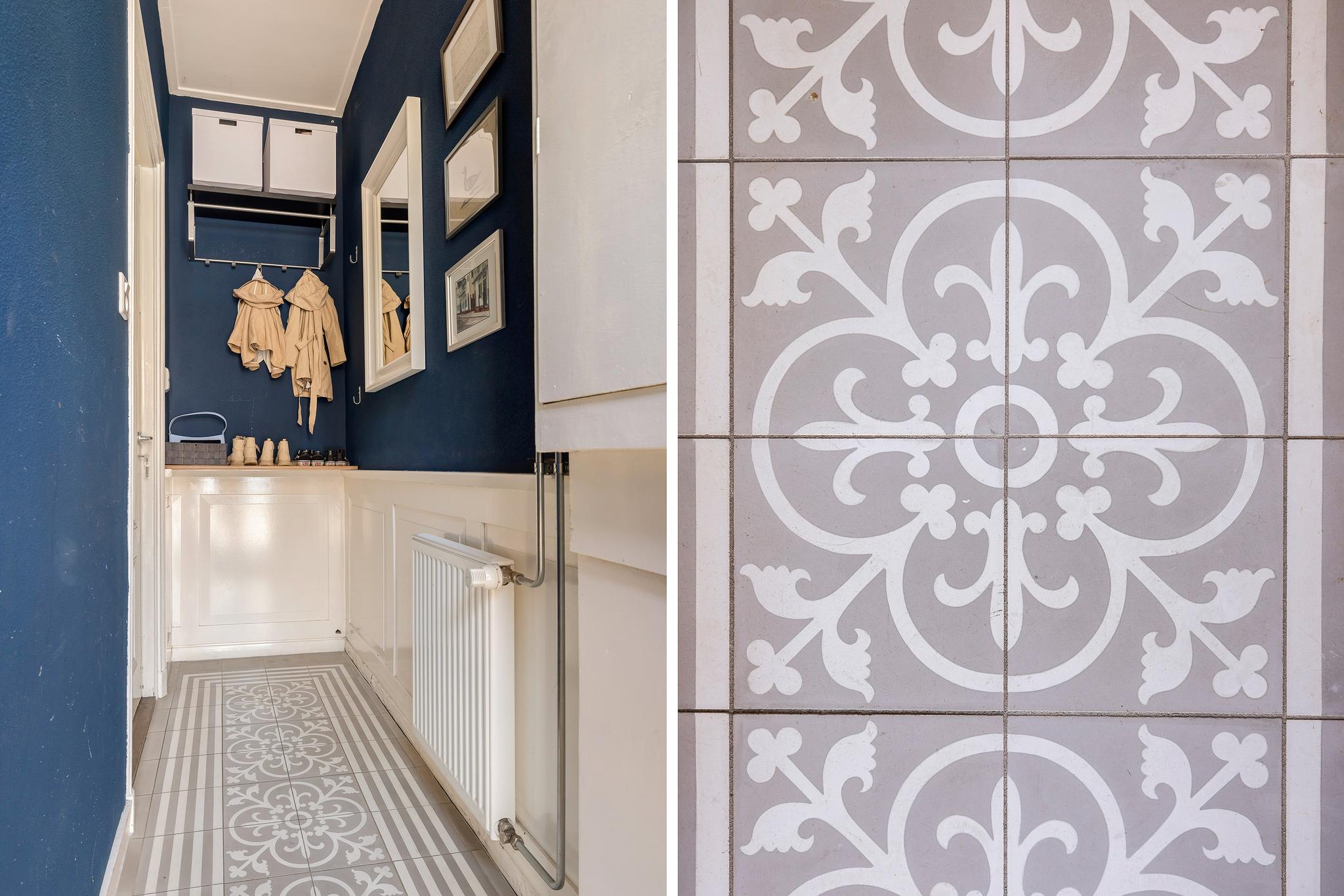 Entree in de hal met meterkast en deur naar de woonkamer.