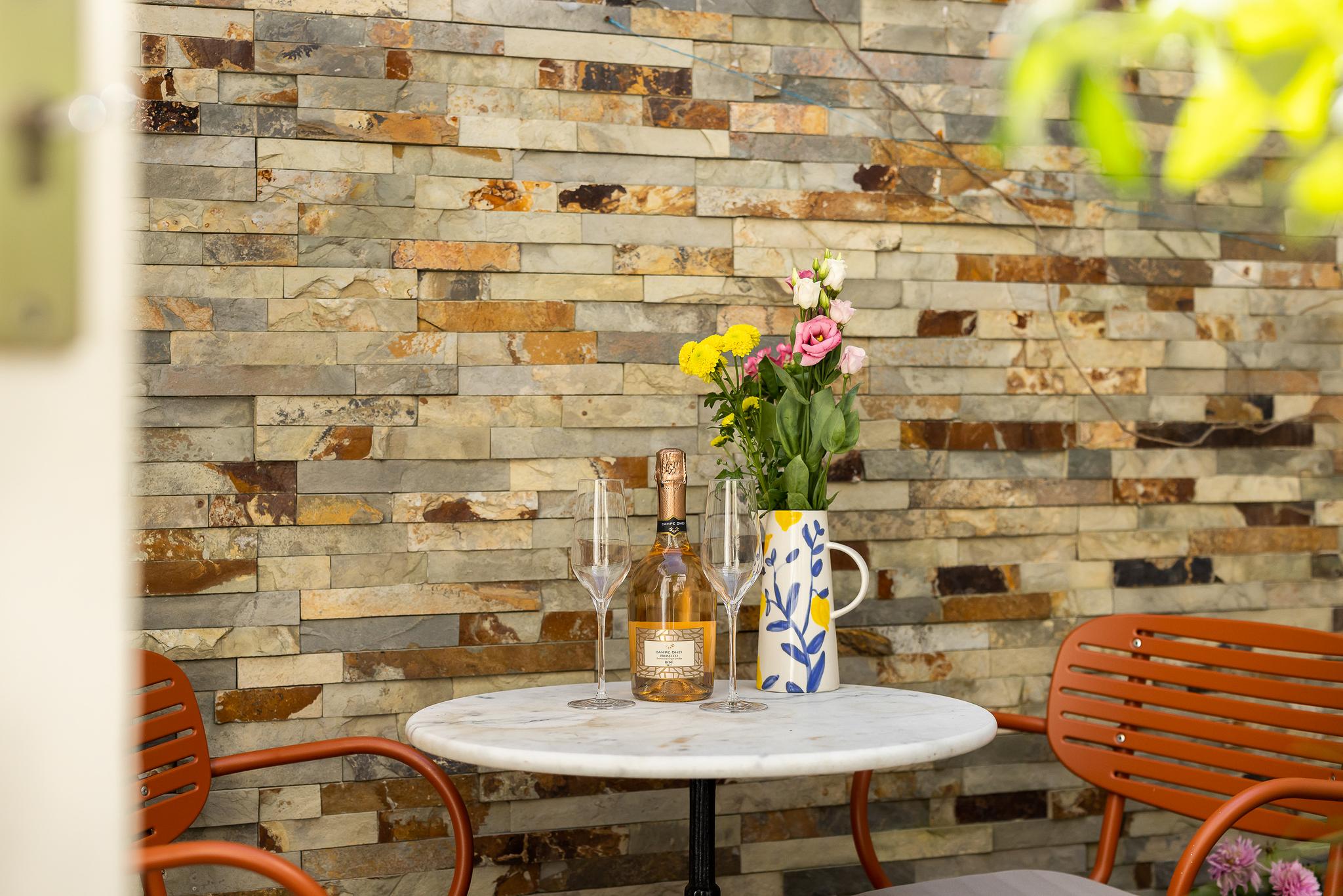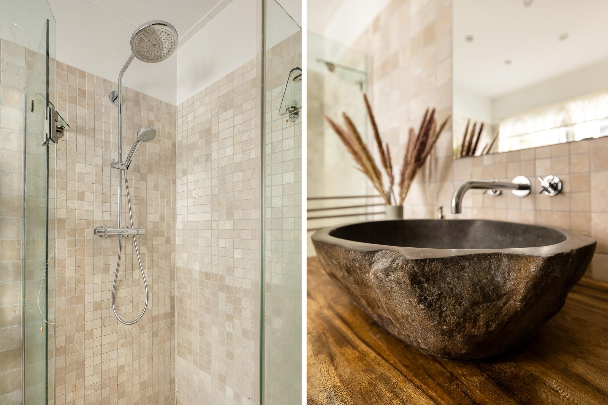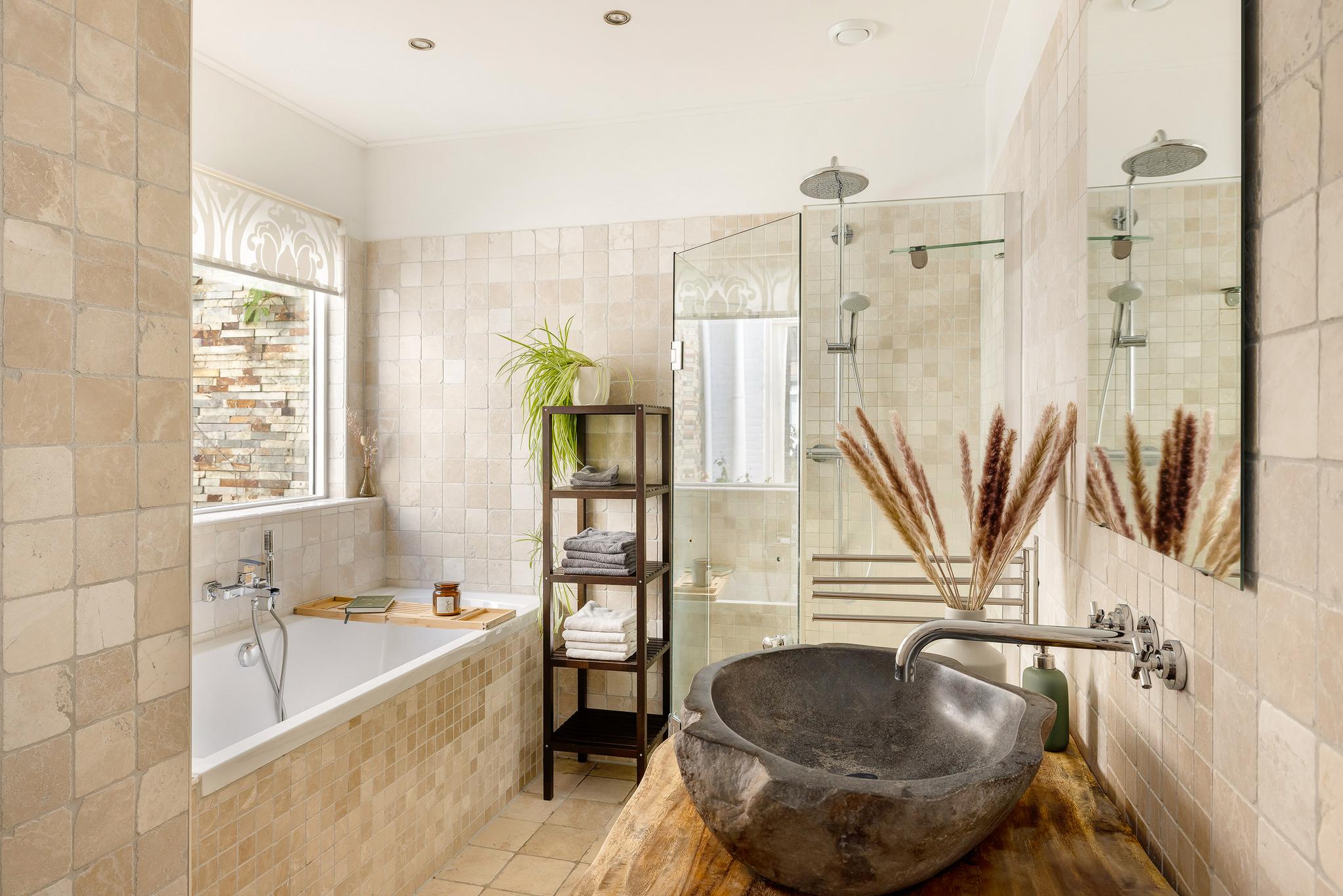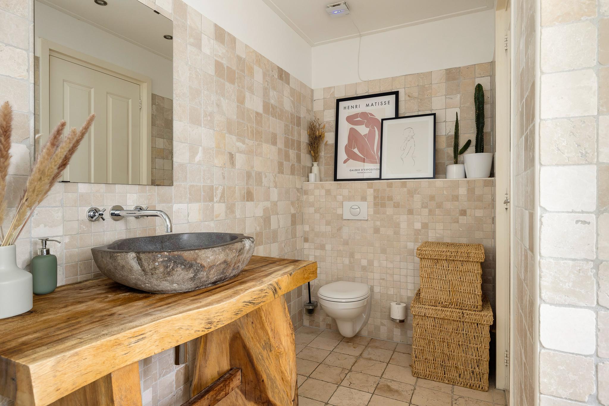Achter de keuken toegang tot de badkamer. De badkamer heeft met zijn getrommelde marmeren tegels en stenen waskom met houten ombouw een mooie natuurlijke look, er is een vrijhangend toilet aanwezig, designradiator, douche met thermostaatkraan, ligbad en elektrische ventilatie, verlaagd plafond met spots.