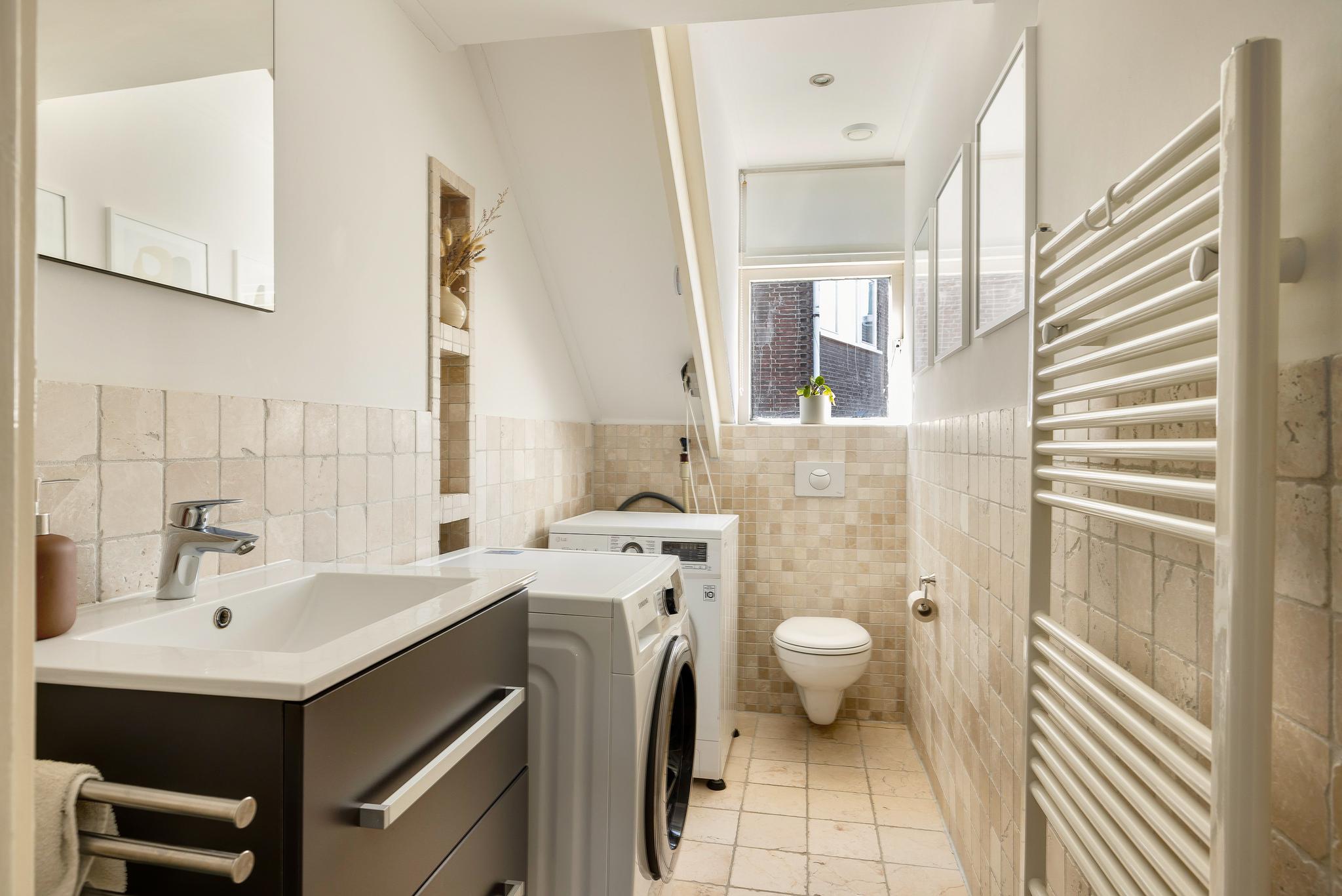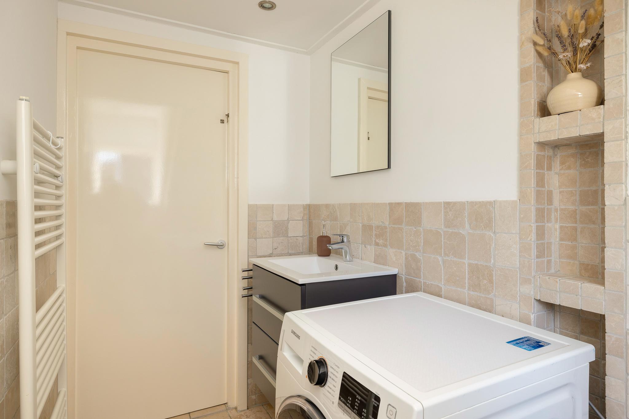 Mooie wasruimte met 2de toilet (vrijhangend), designradiator en wastafel met meubel, verlaagd plafond met spots, dezelfde marmeren tegels als in de badkamer beneden.