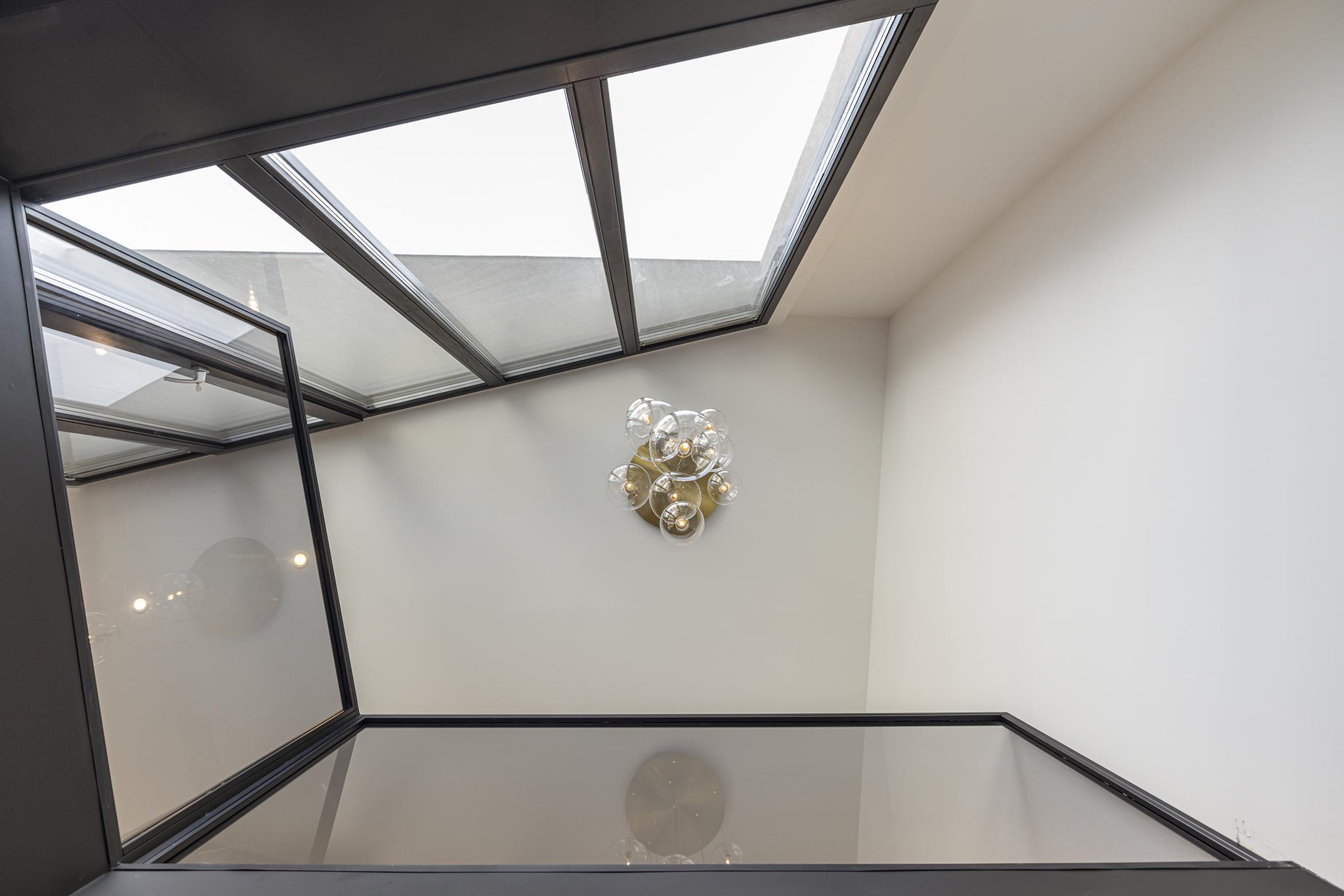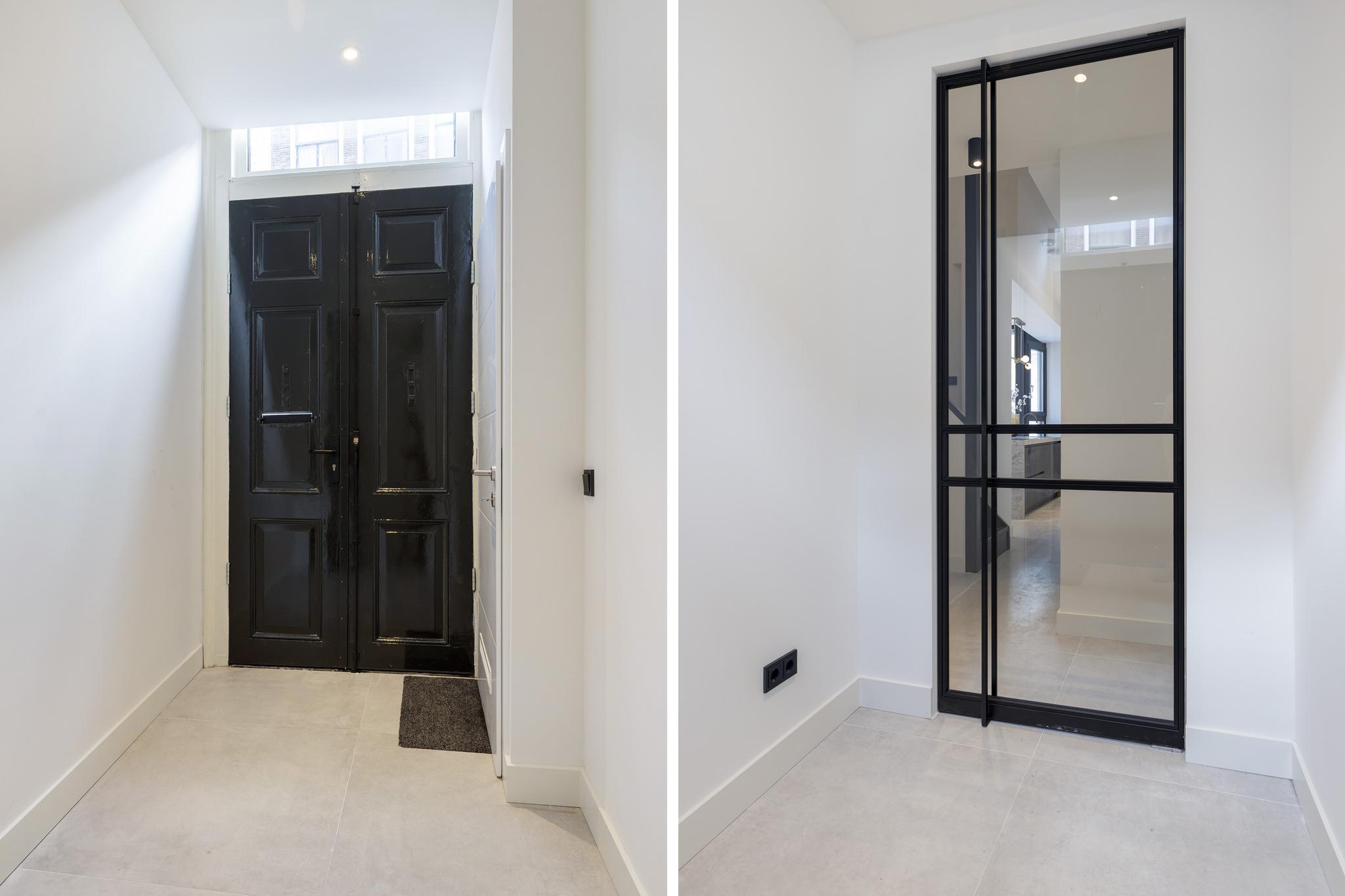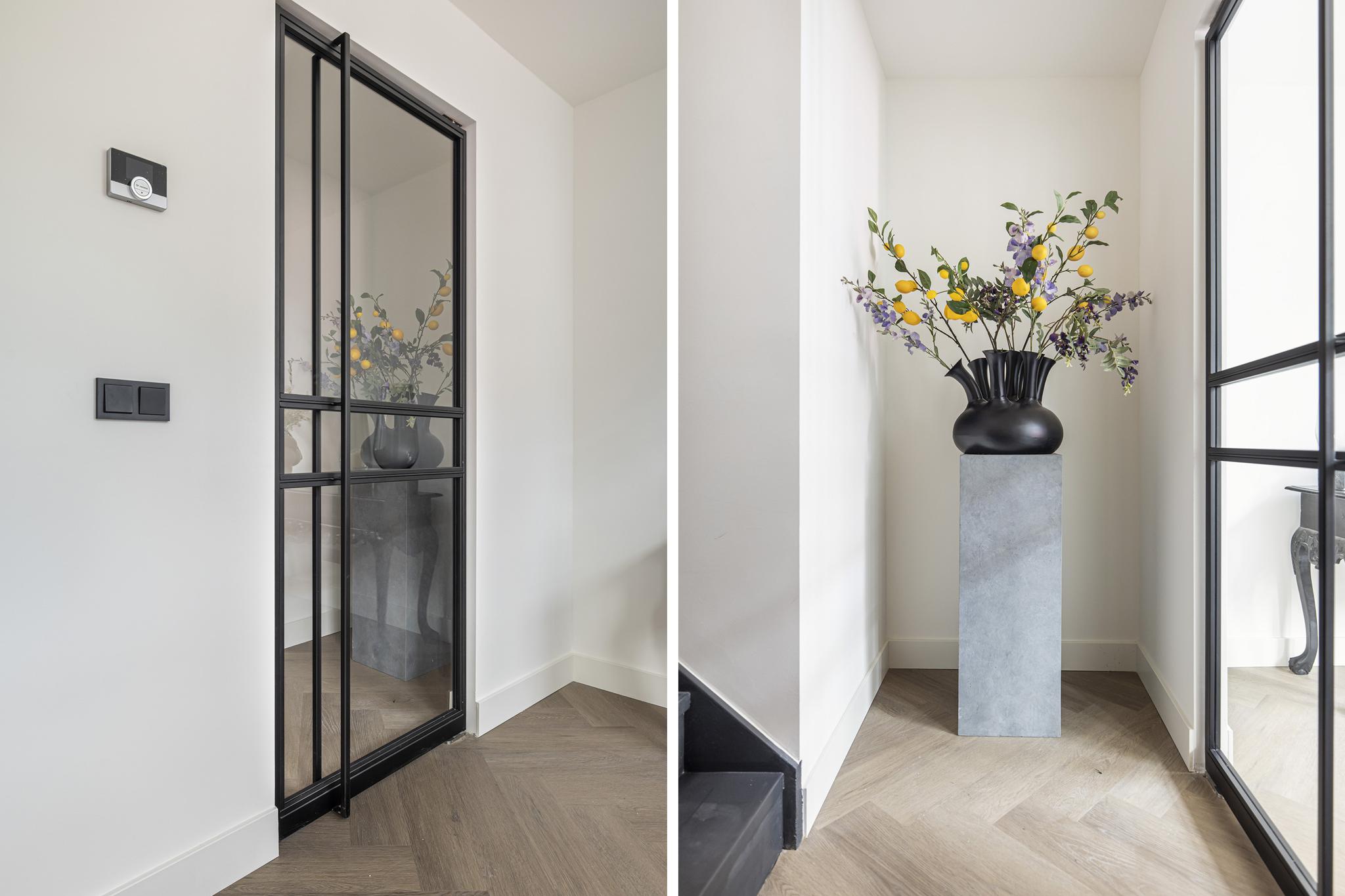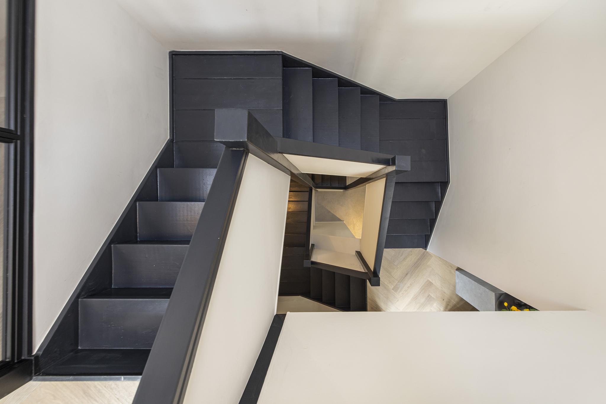 Entree in de hal met trapopgang naar de verdiepingen, meterkast, toilet en doorgang naar de leefkeuken aan de achterzijde van de woning. De trapopgang op zich is al bijzonder door de enorme hoogtes en de mooie strakke vormgeving.