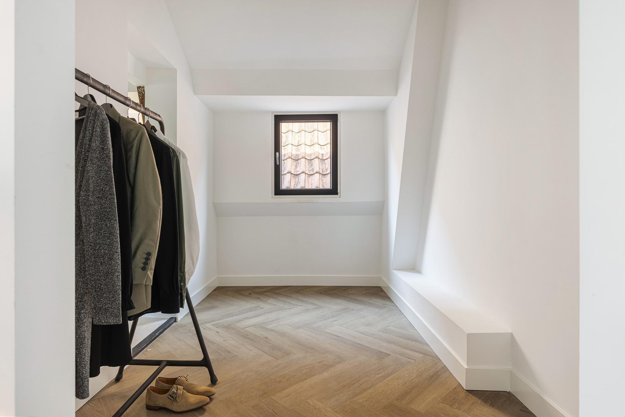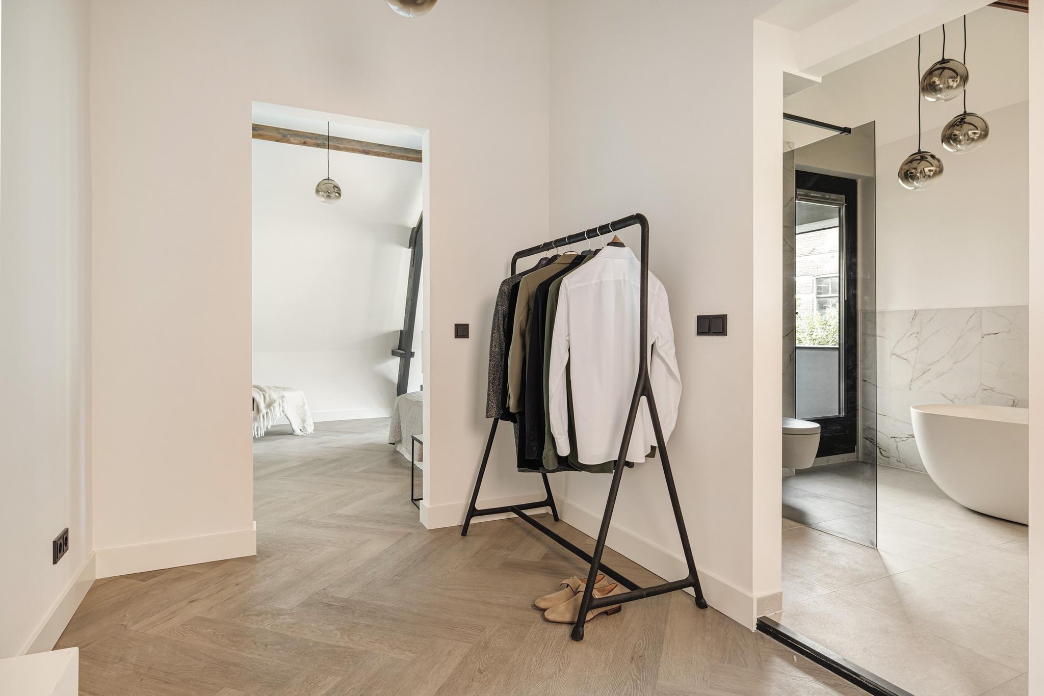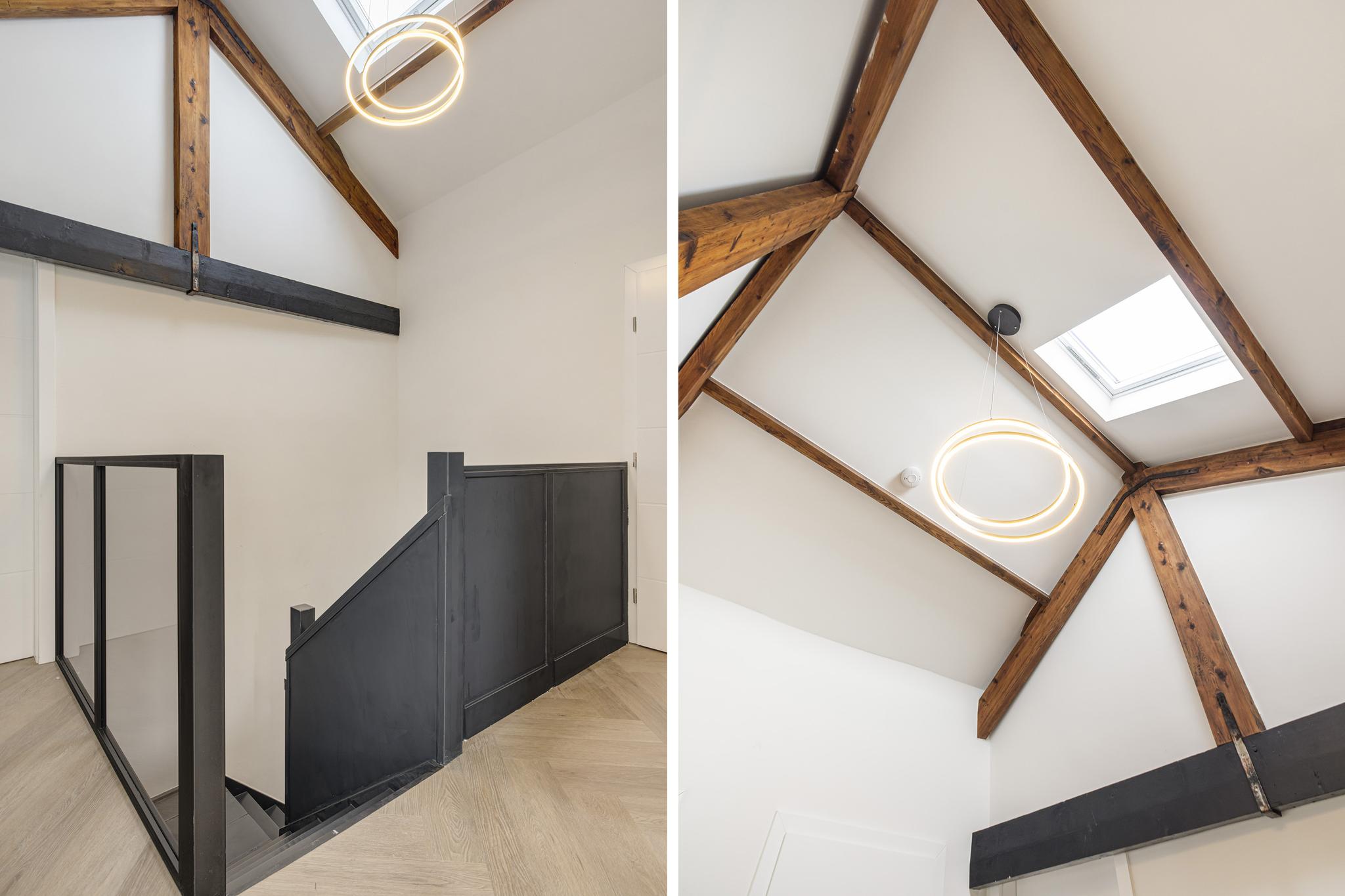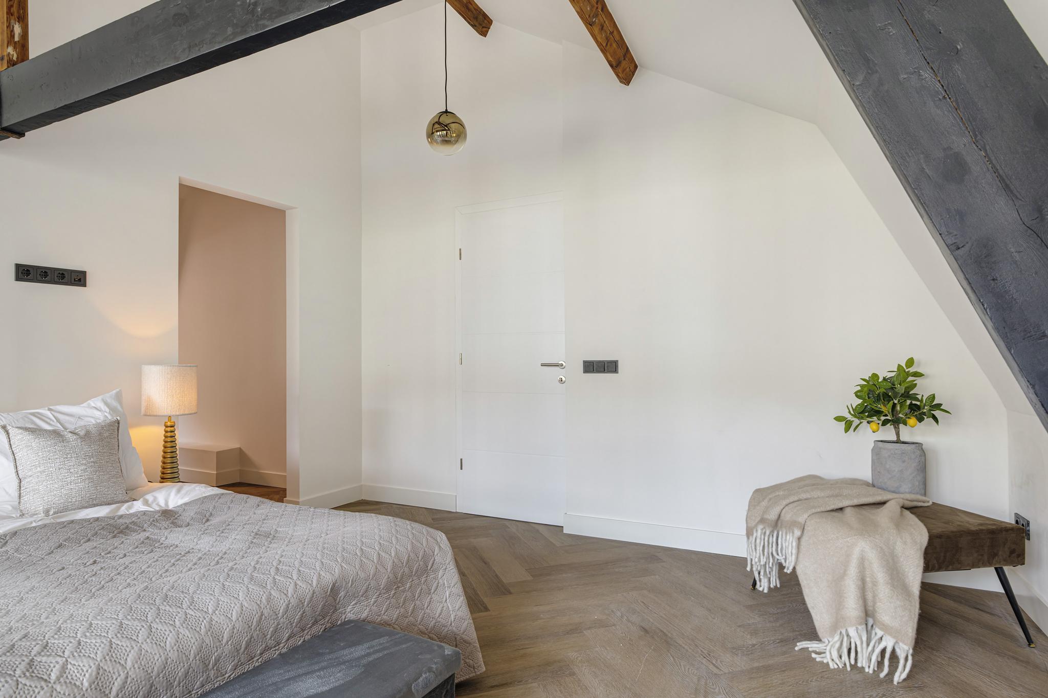Het mooie van deze verdieping is dat de originele balken nog zichtbaar zijn gebleven in het volledig geïsoleerde dak. Ook hier is de visgraat vloer doorgelegd.