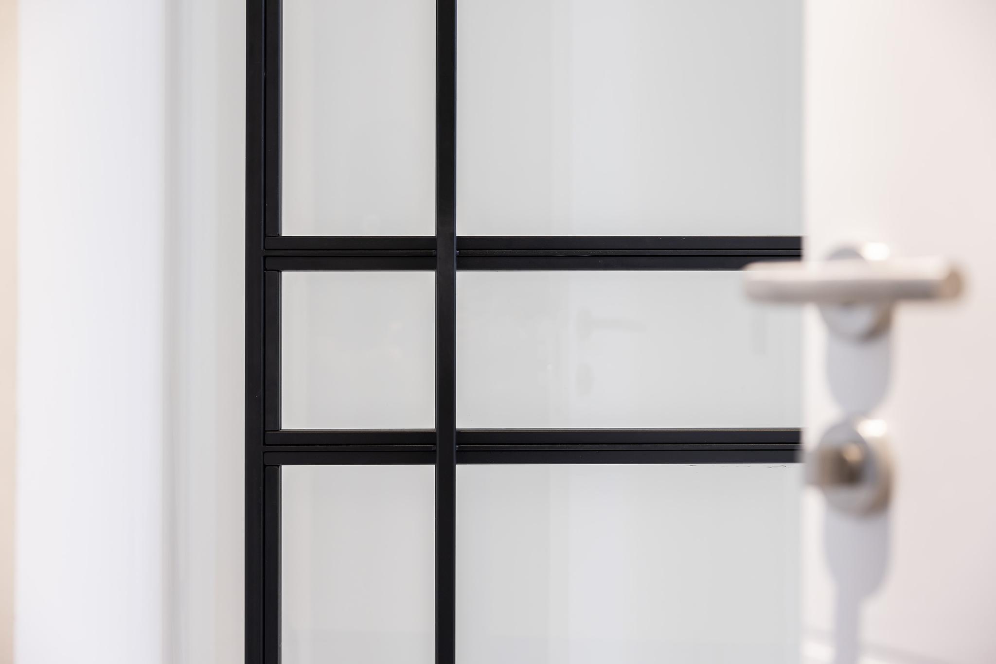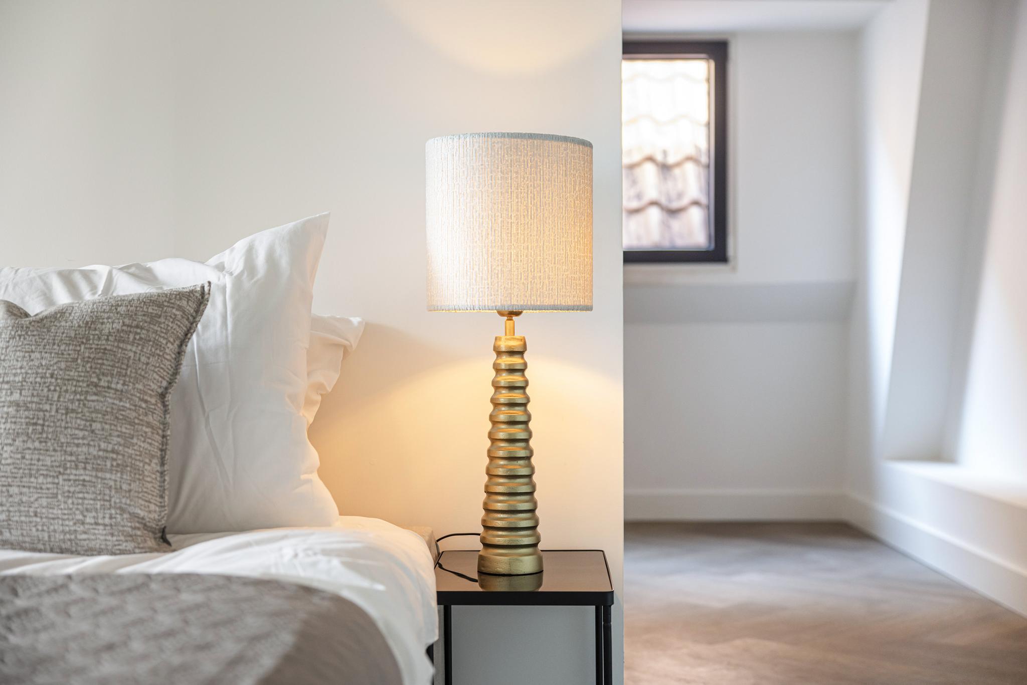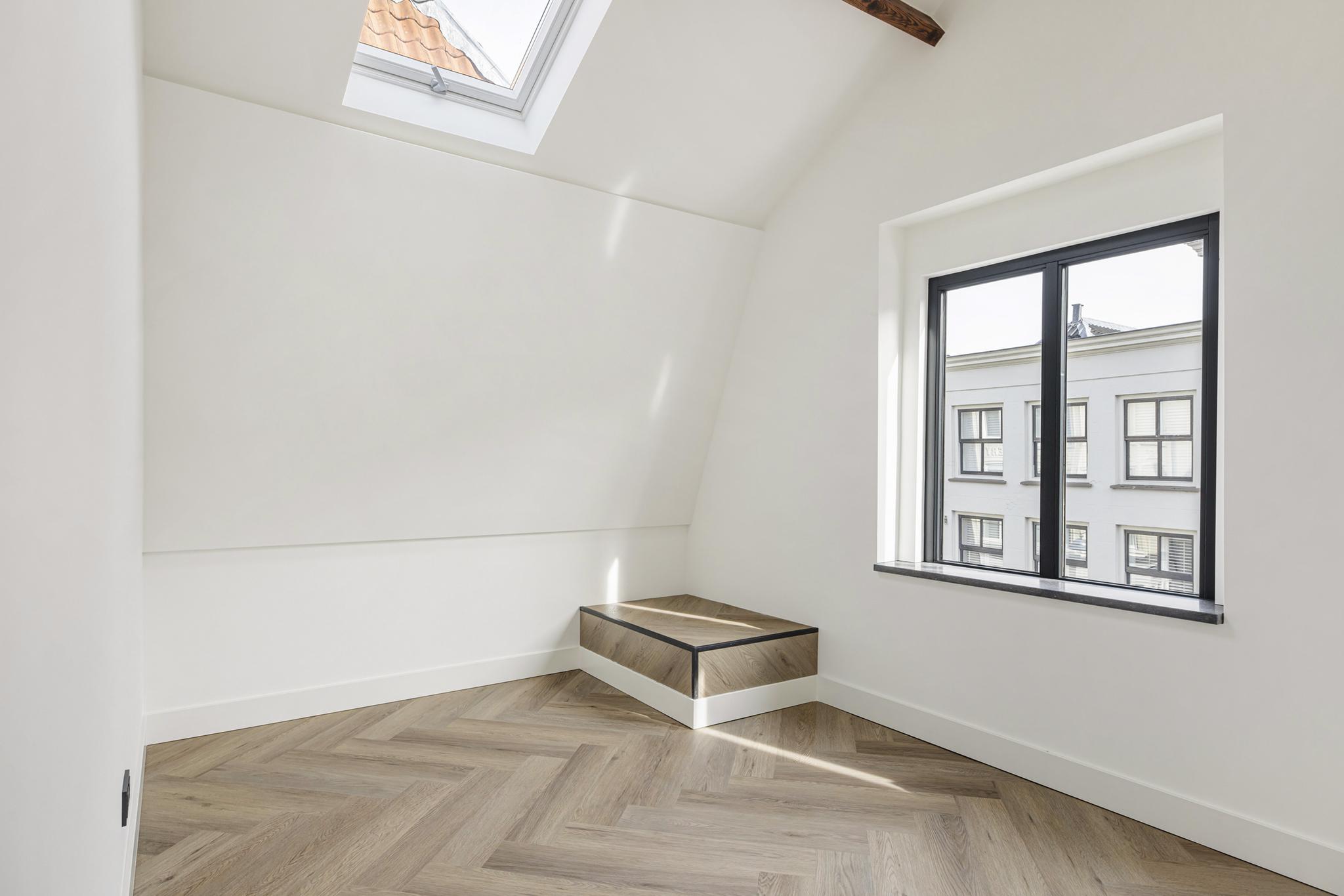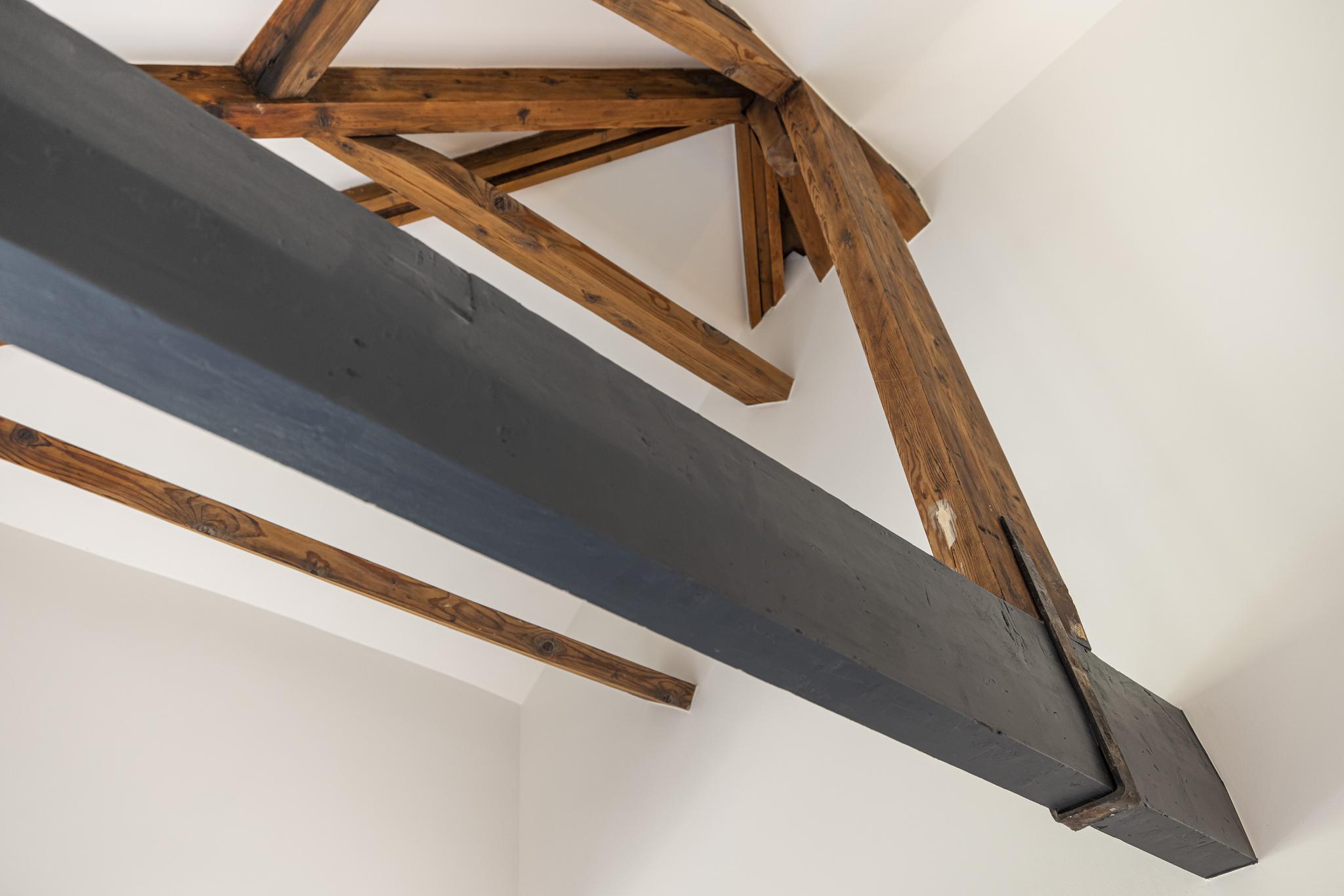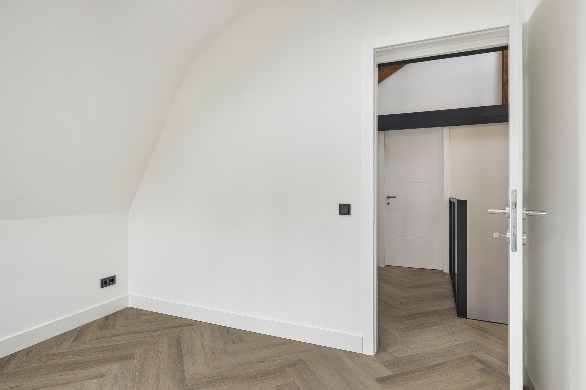Het mooie van deze verdieping is dat de originele balken nog zichtbaar zijn gebleven in het volledig geïsoleerde dak. Ook hier is de visgraat vloer doorgelegd.
