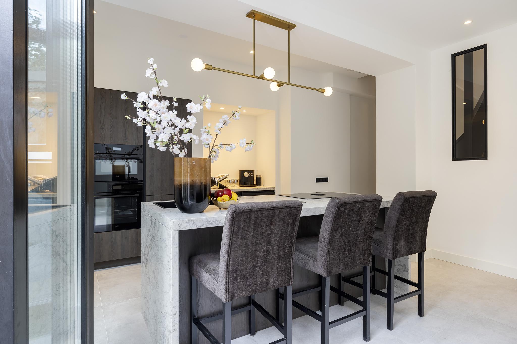 Via een stalen deur kom je in de prachtige kwaliteits leefkeuken terecht welke in een wandopstelling geplaatst is met koffie hoekje en uiteraard een eiland waar je ook heerlijk aan kunt zitten. Door de grote ramen met openslaande deuren naar de tuin zorgen voor veel licht, daarnaast kijk je via de vide de woonkamer in, dit geeft een speels effect en extra contact met je mede bewoners!