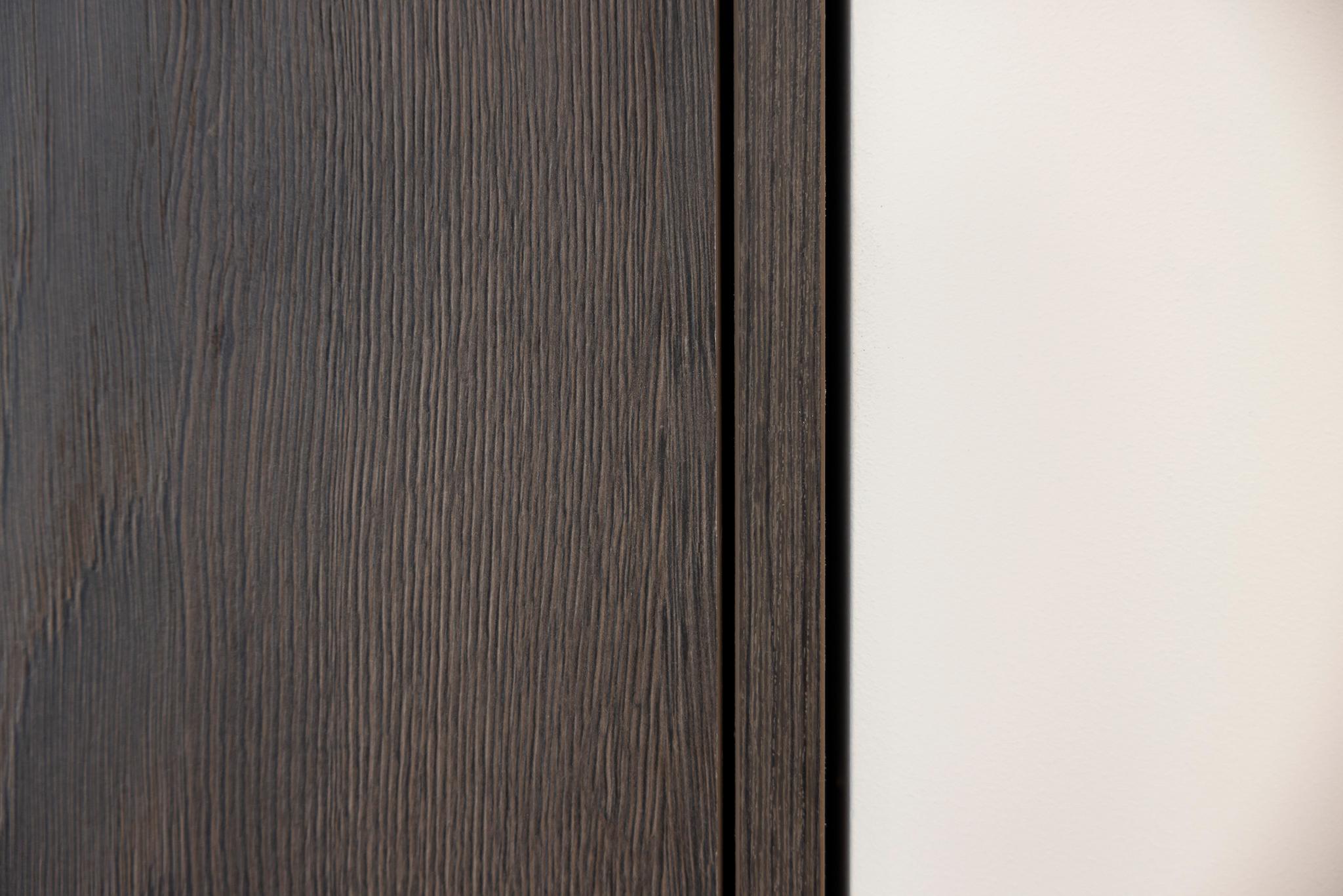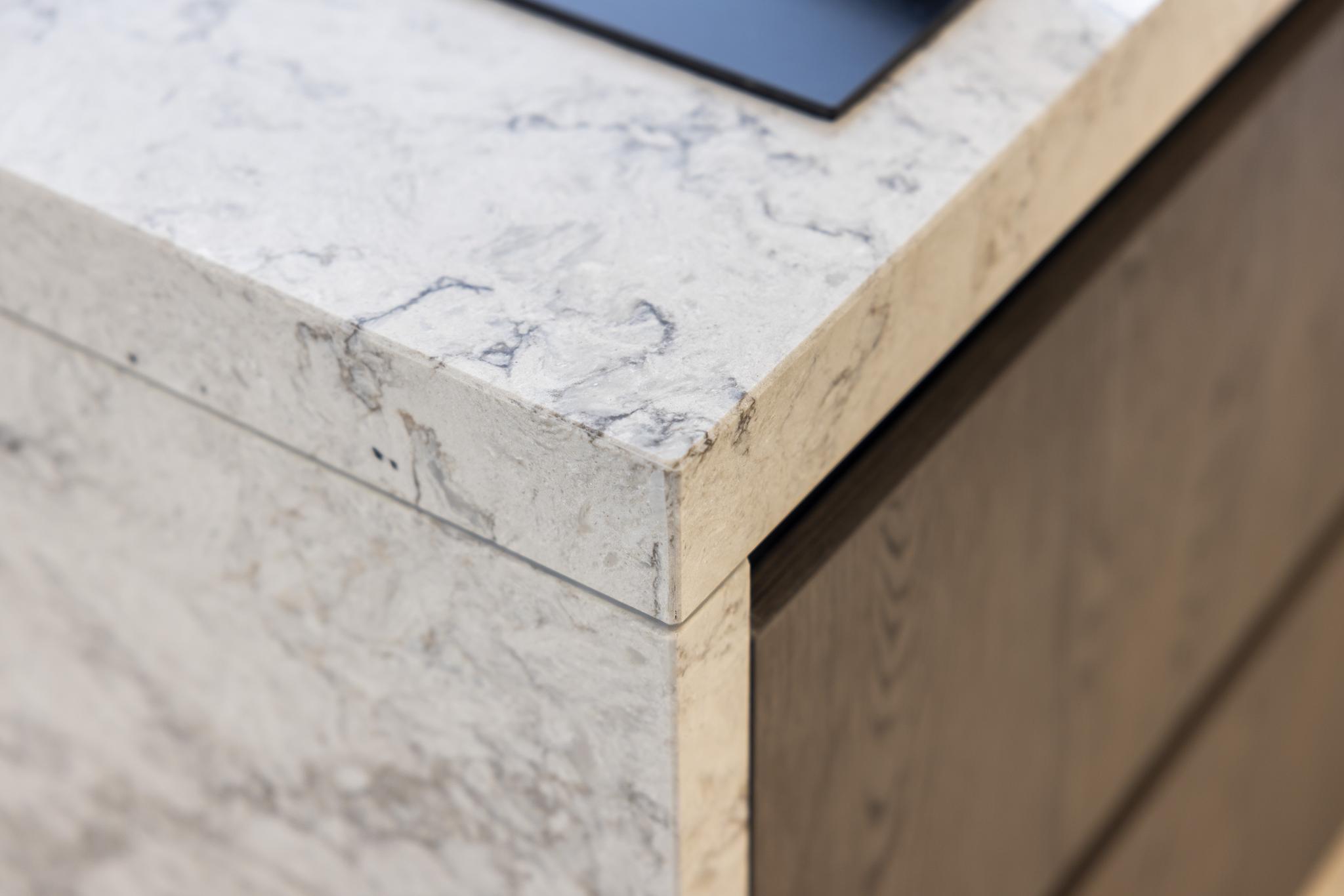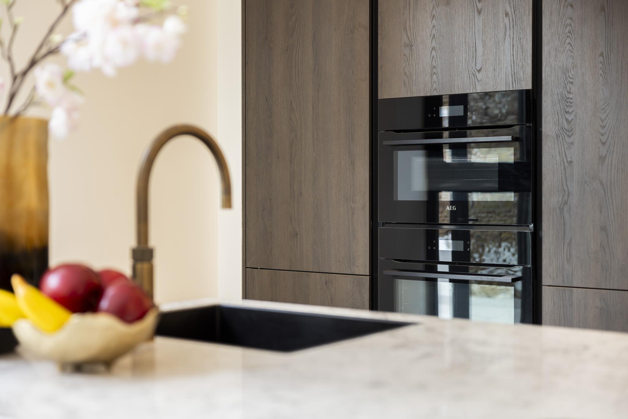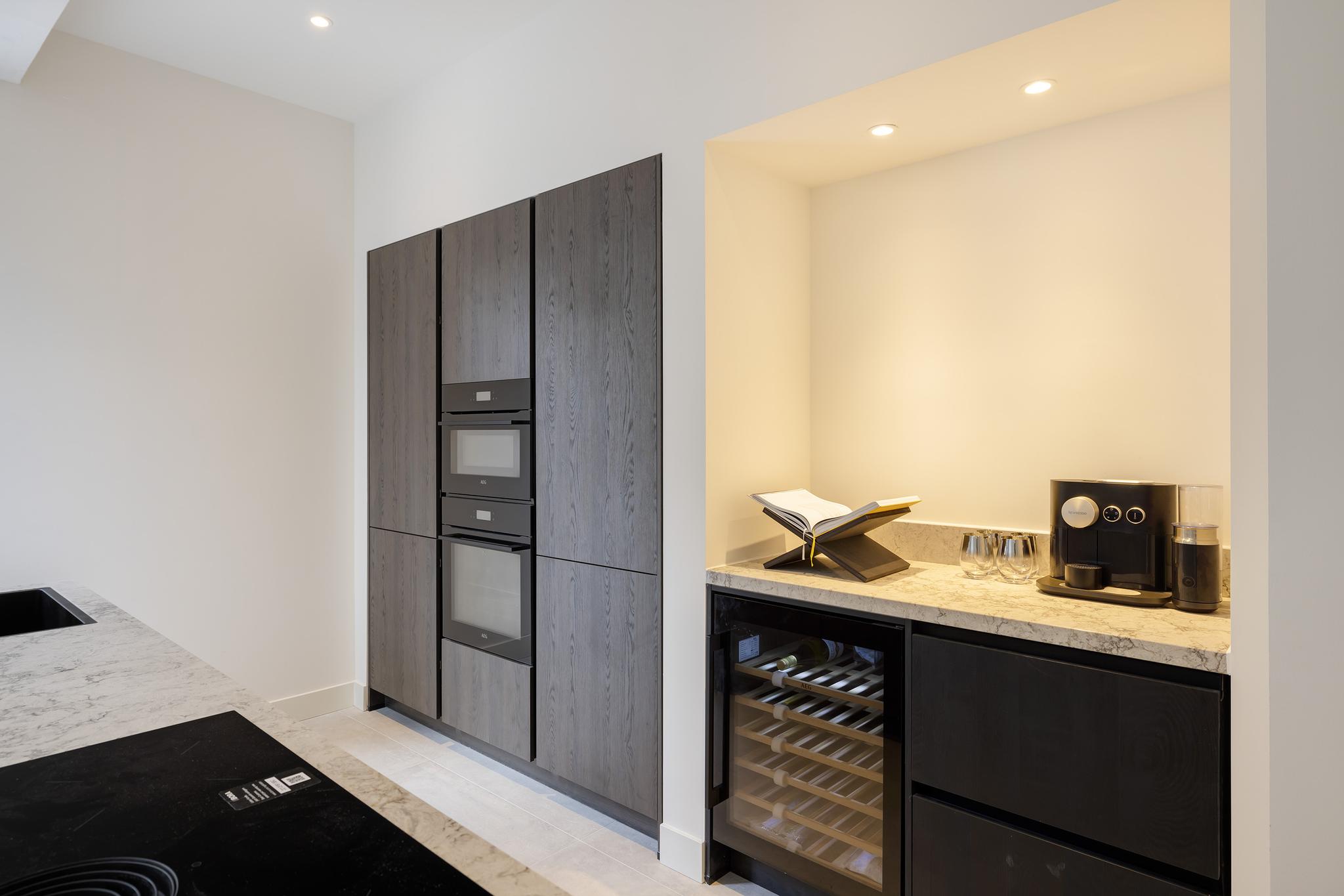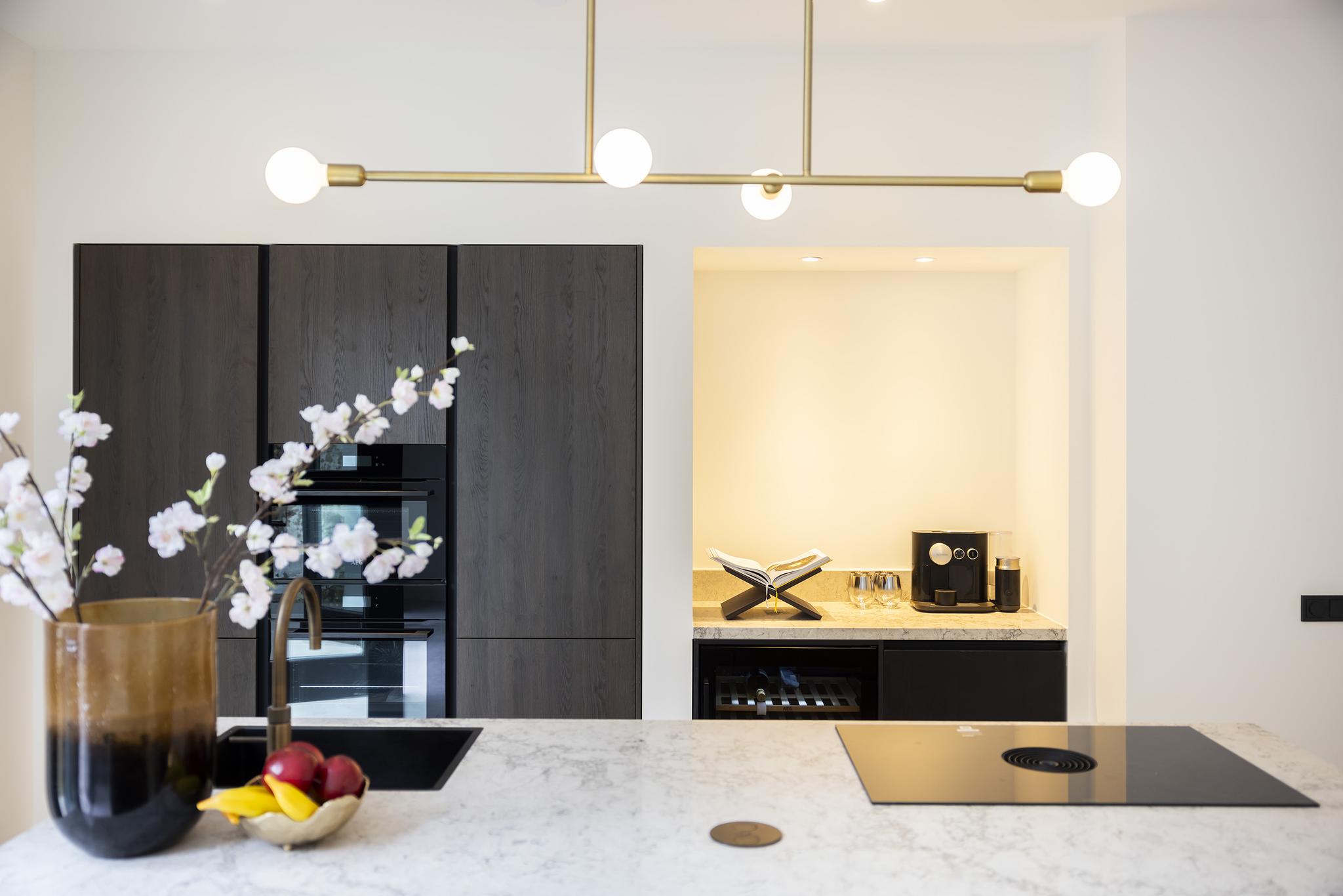 Qua apparatuur in de keuken mag je rekenen op een Bora inductie kookplaat, Quooker, vaatwasser, koel/vries combinatie, combi-oven, oven en natuurlijk mag een wijnkast ook niet ontbreken in zo'n luxe keuken als dit. De keuken is afgewerkt met kastjes in hout look en een luxe composiet opgedikt blad in crème tint, met zijwanden.