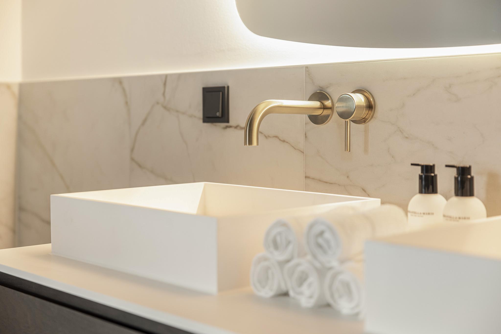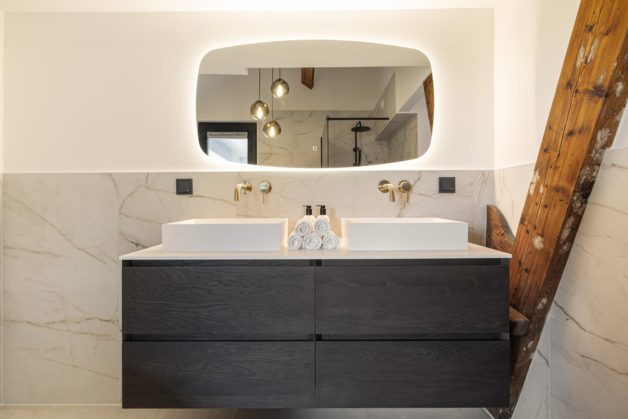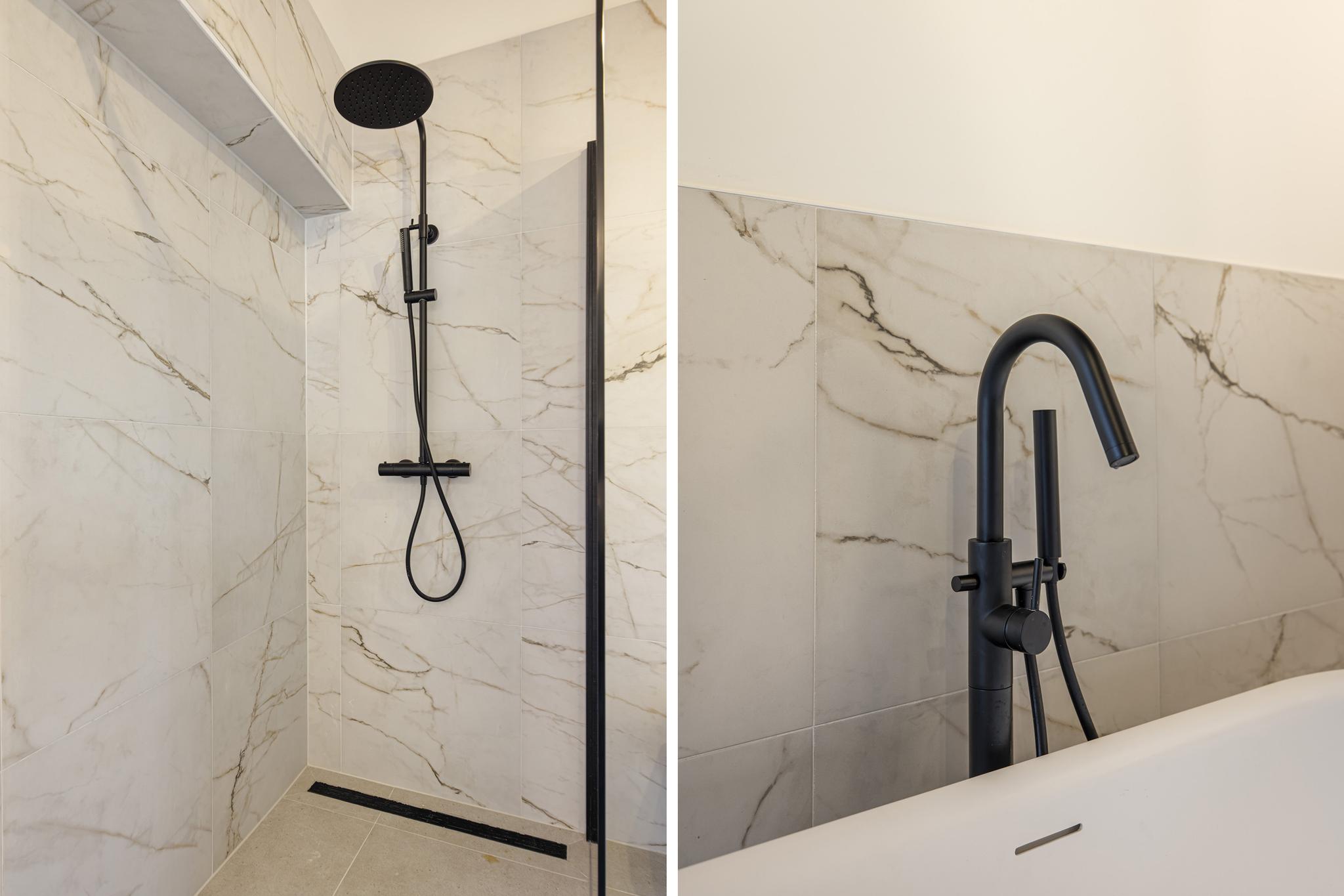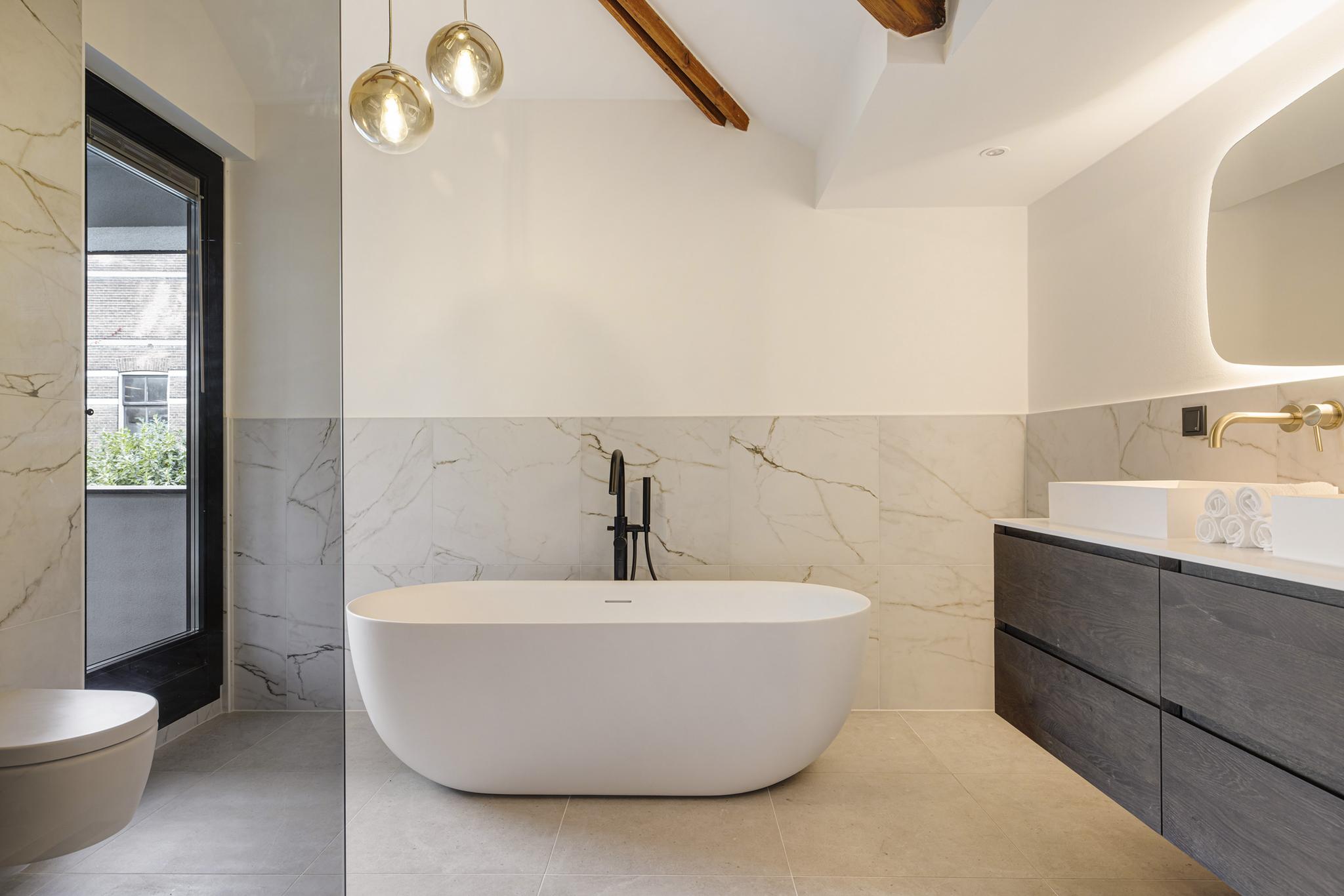 De badkamer is voorzien van een bad, aparte inloop douche, vrijhangend toilet en dubbele wastafel, geheel/ gedeeltelijk betegelde wanden en mooie verlichting.