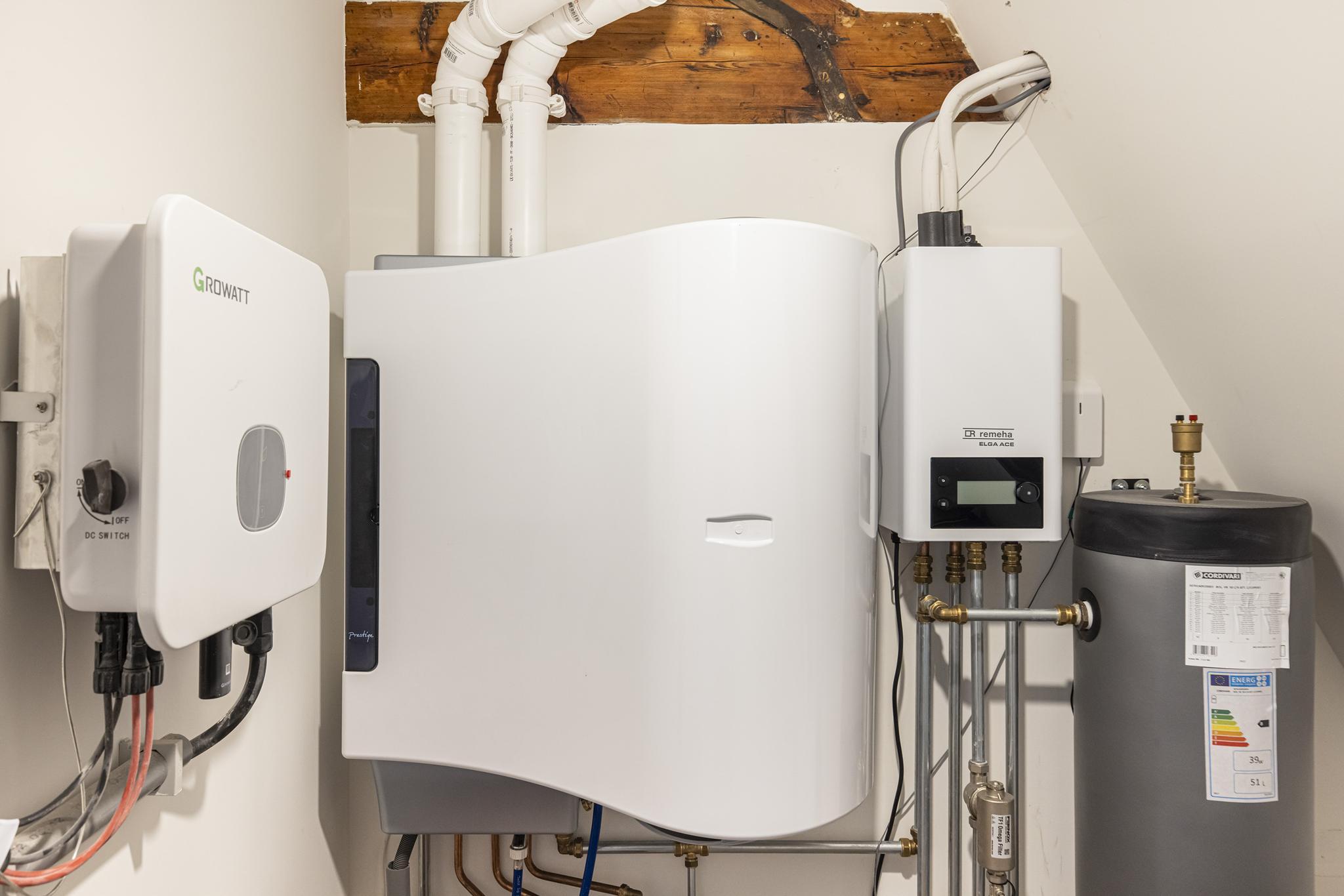 Technische ruimte met opstelling van de Hybride warmtepomp 6KW + CV ketel CW6 (voornamelijk voor tapwater) en de vraag gestuurde ventilatie.