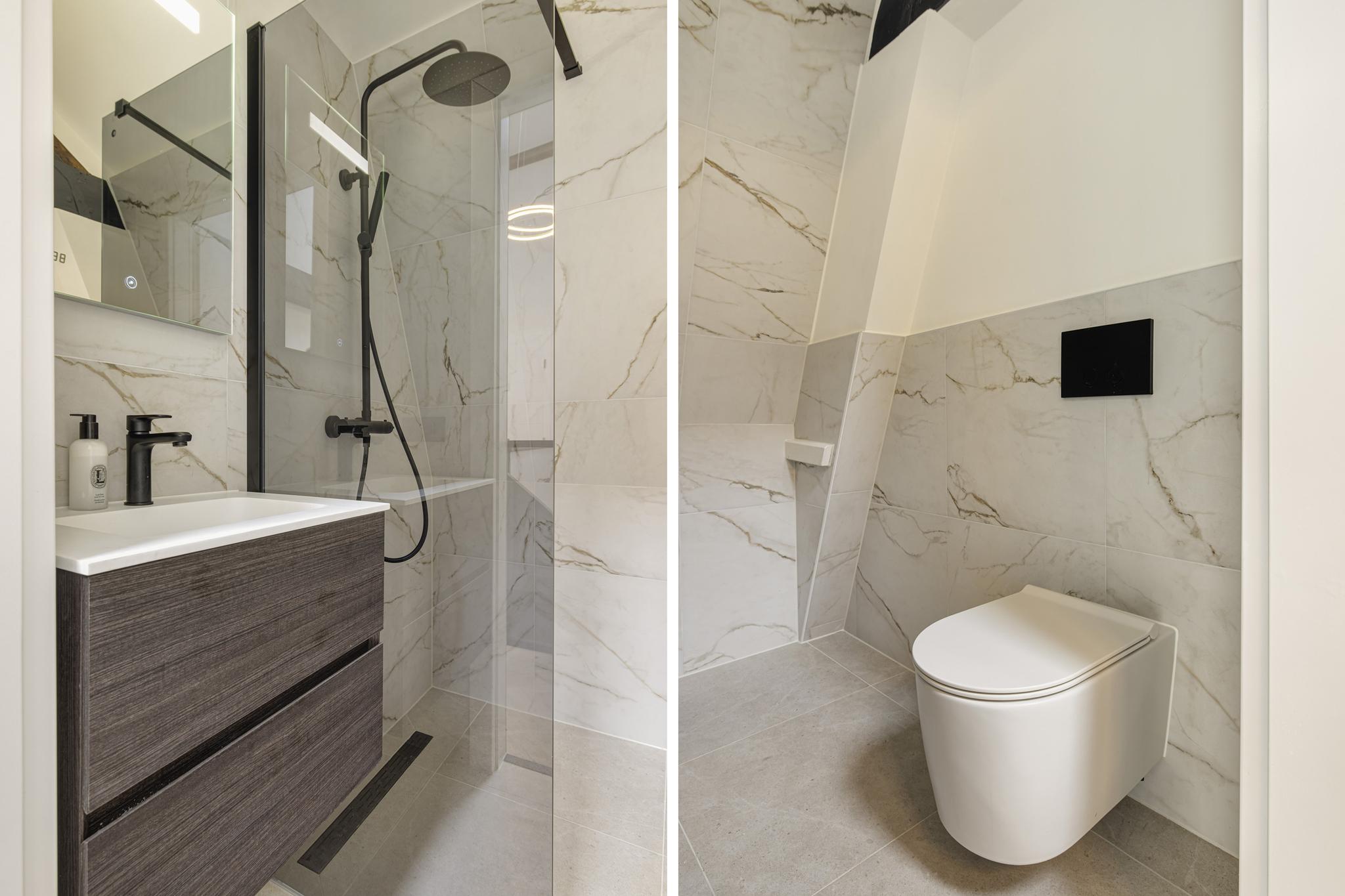 Voor slaapkamer 1 en 2 is een eigen badkamer aanwezig op de overloop met inloop douche, wastafel en toilet. De wanden zijn geheel/ gedeeltelijk betegeld en spots.