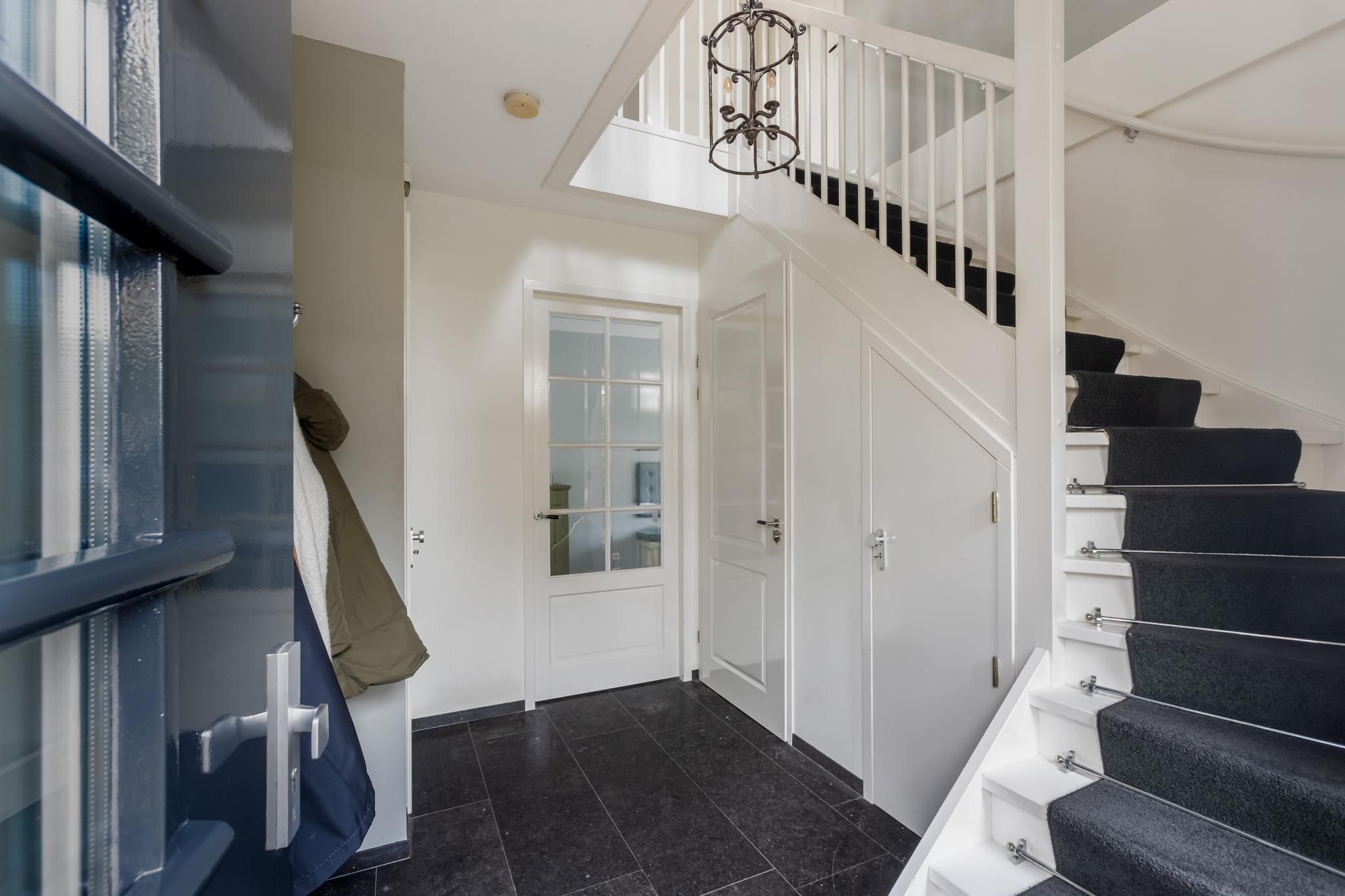 Entree in de hal met meterkast, trapkast, toilet, trapopgang en toegang tot de kamer.