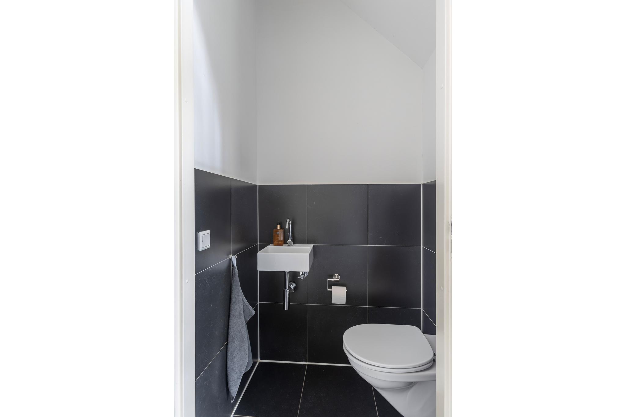 Separaat toilet, vrijhangend met fonteintje en deels betegelde wanden.