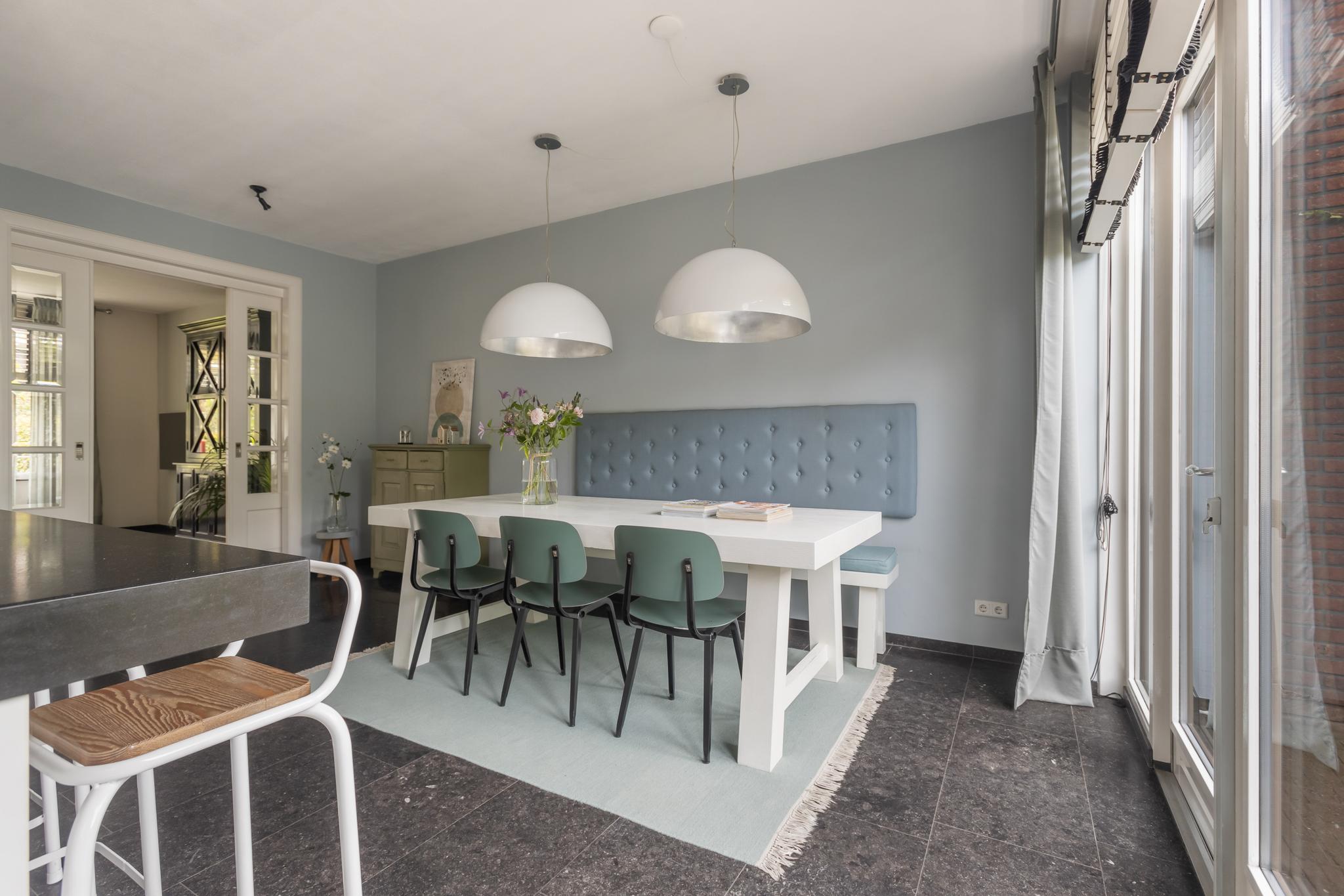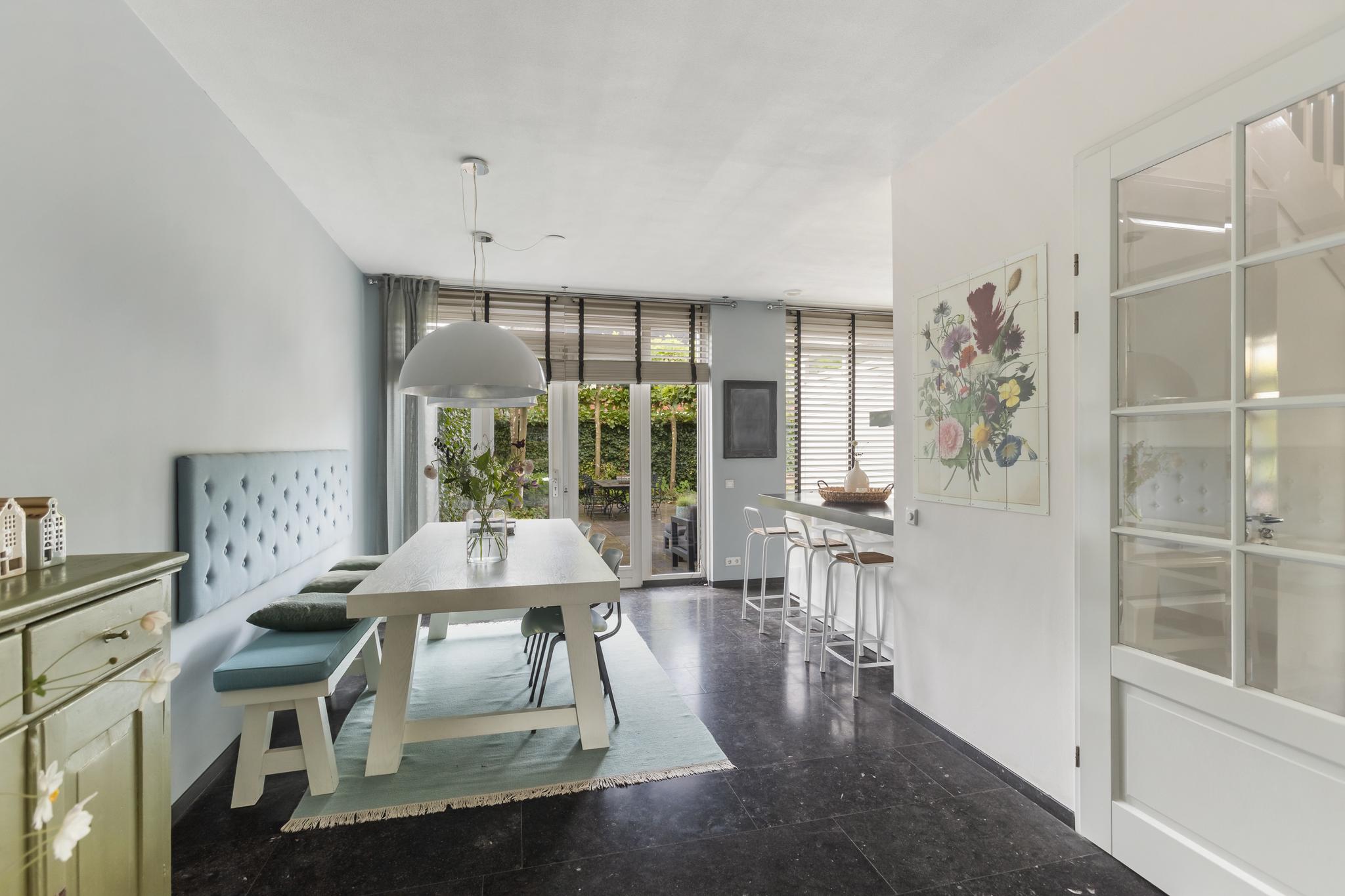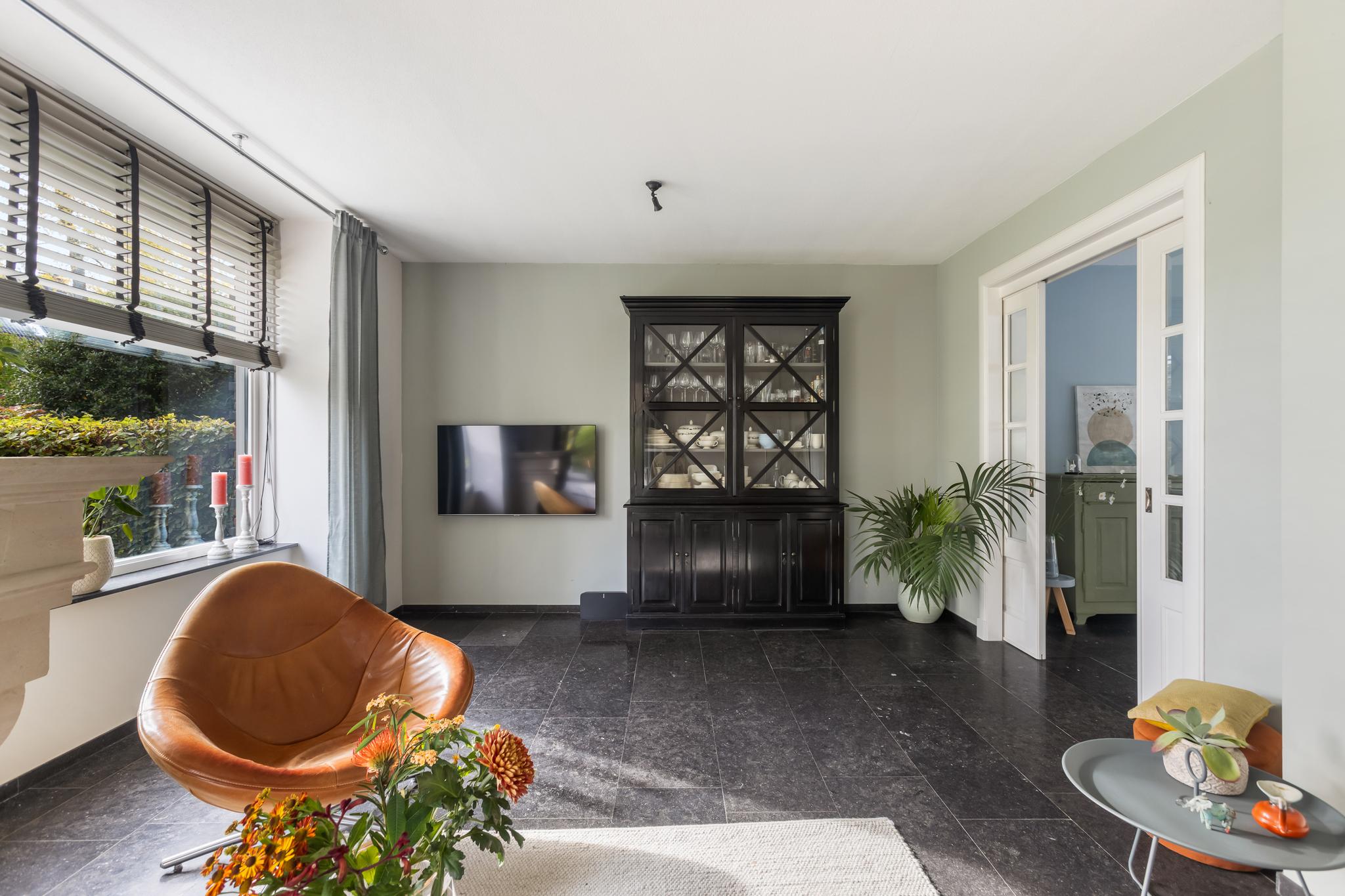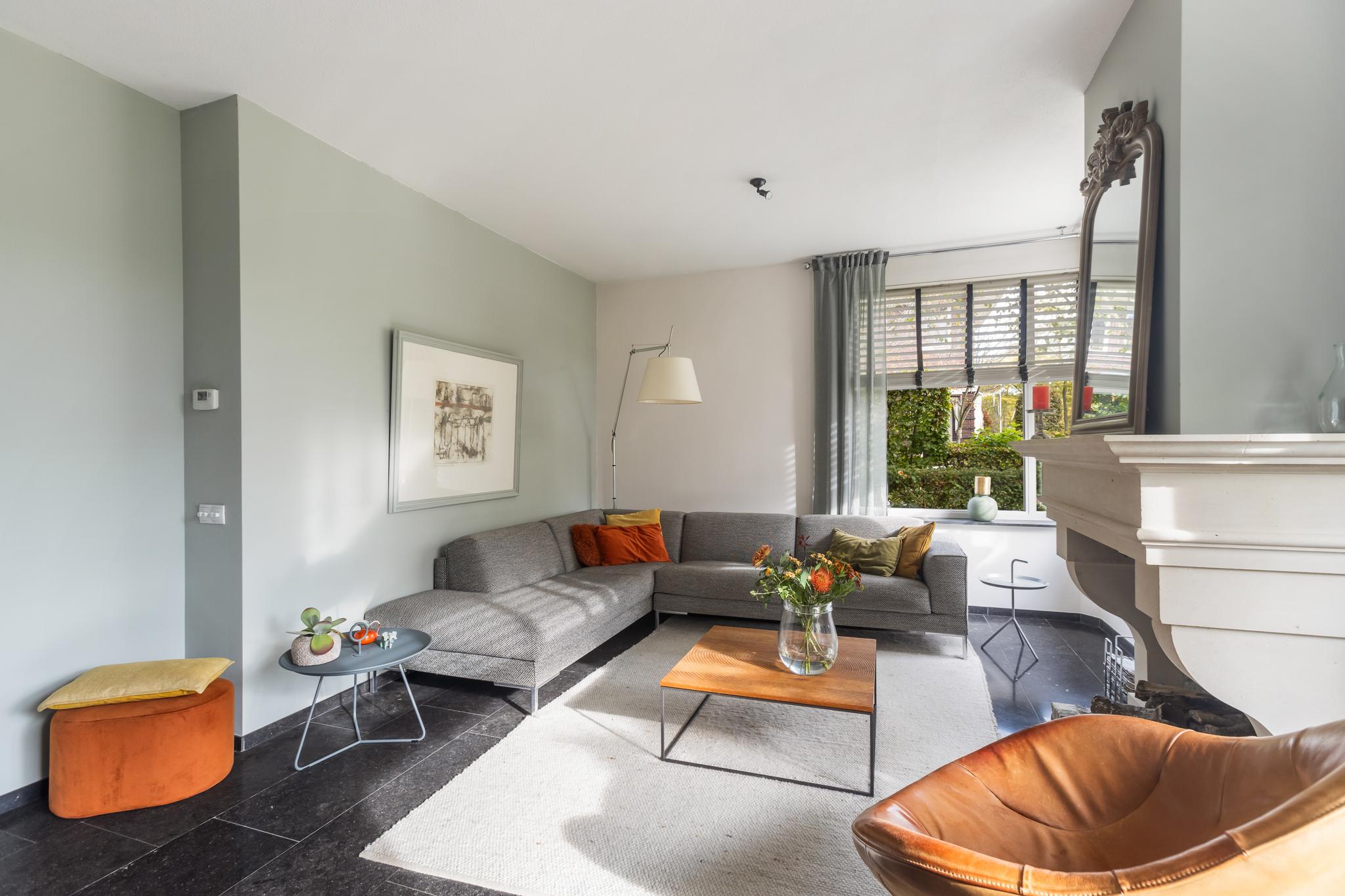 Woonkamer-en-suite met hardstenen vloer en vloerverwarming, voorkamer met gashaard (thans niet functioneel), achterkamer als eetkamer in gebruik met openslaande deuren naar de tuin en open keuken.
