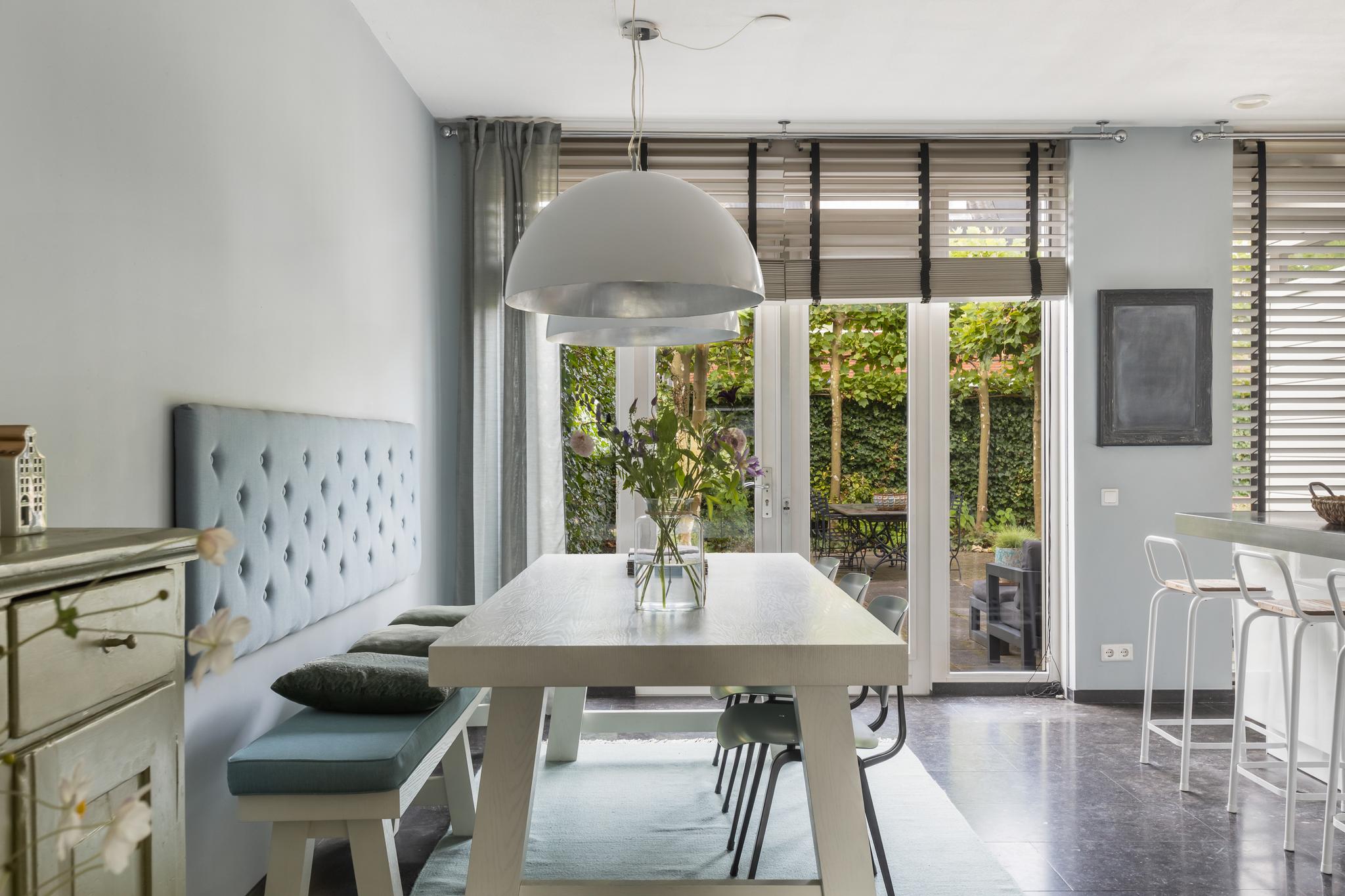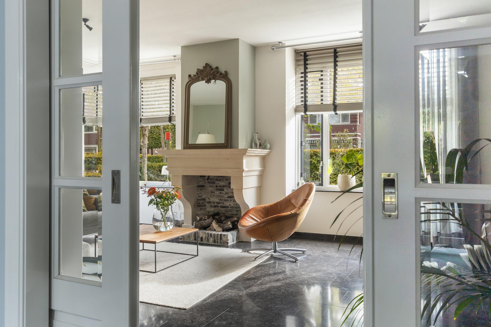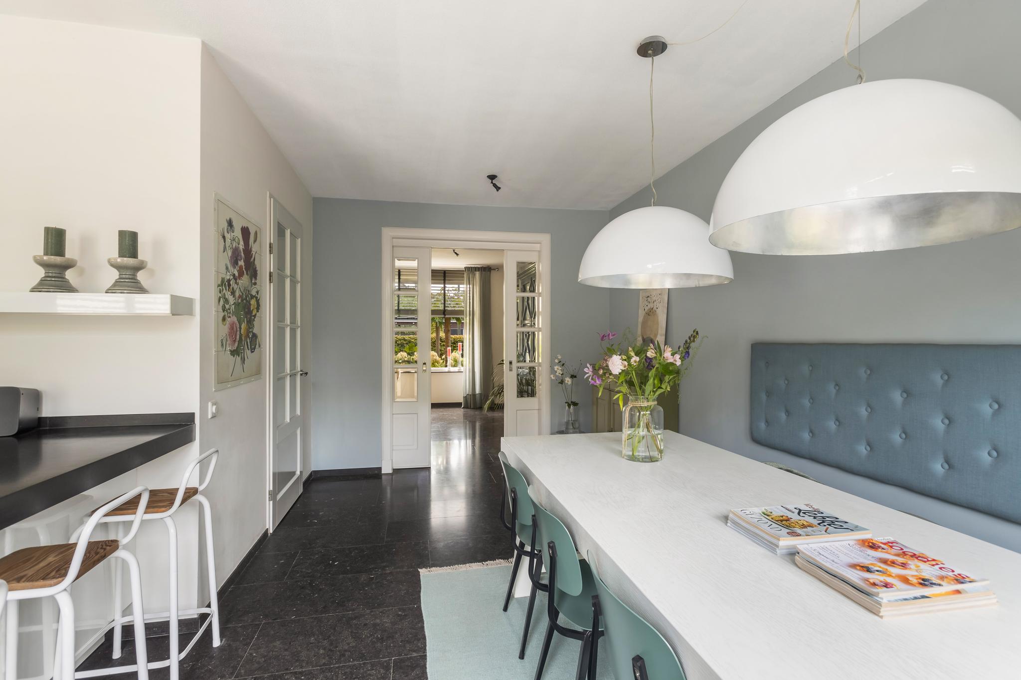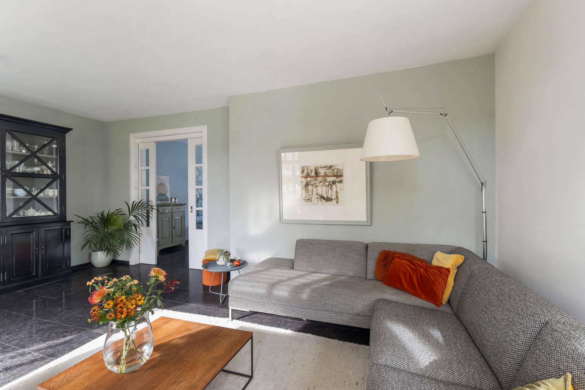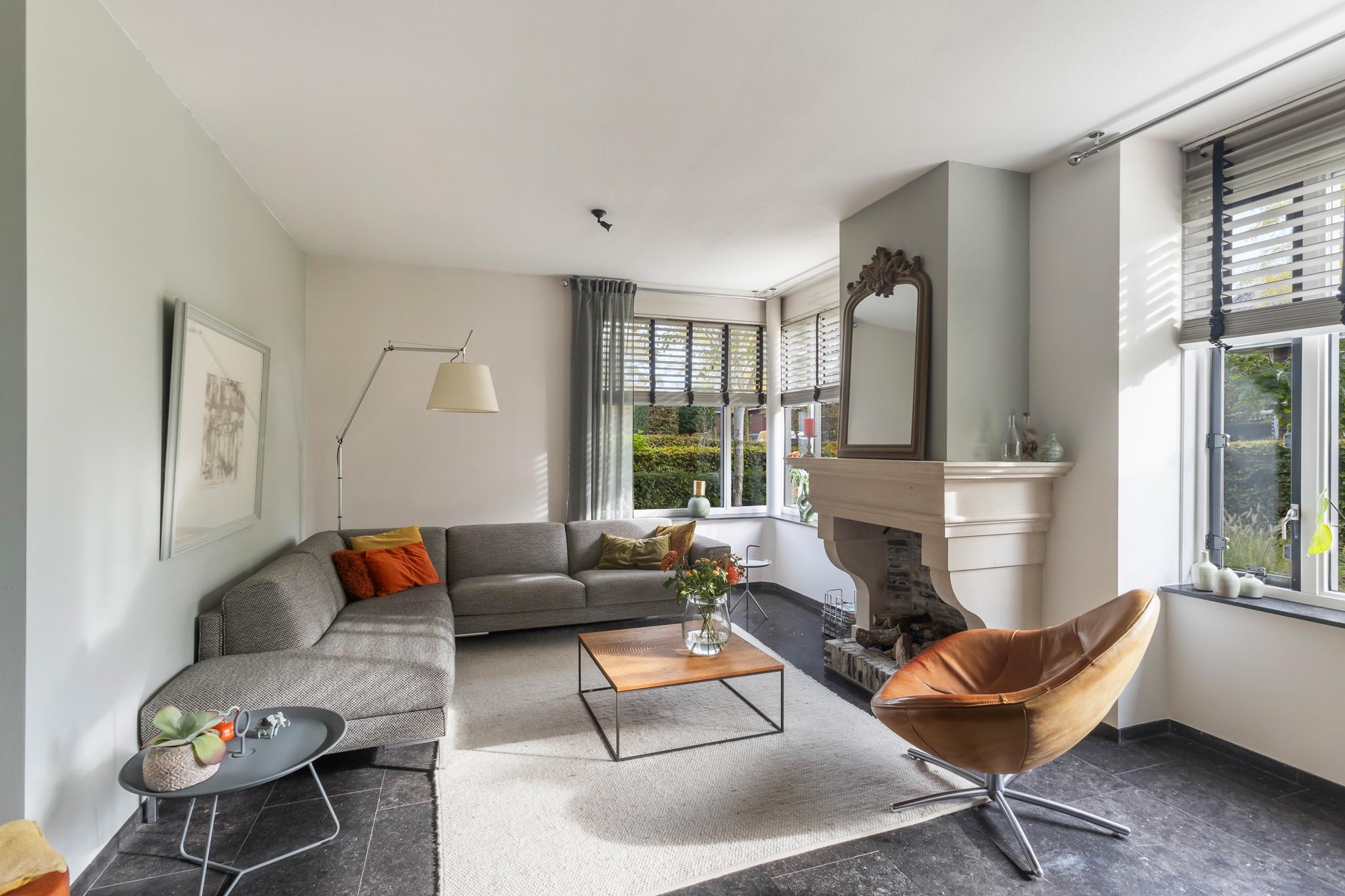 Woonkamer-en-suite met hardstenen vloer en vloerverwarming, voorkamer met gashaard (thans niet functioneel), achterkamer als eetkamer in gebruik met openslaande deuren naar de tuin en open keuken.