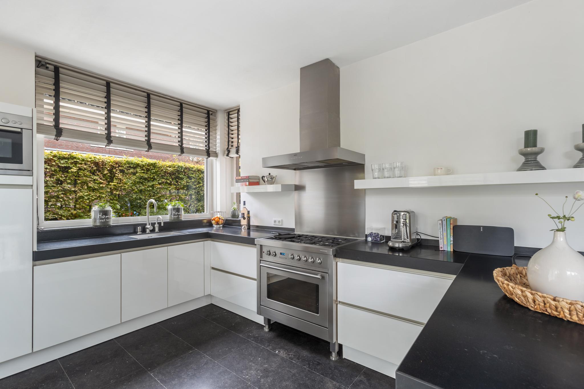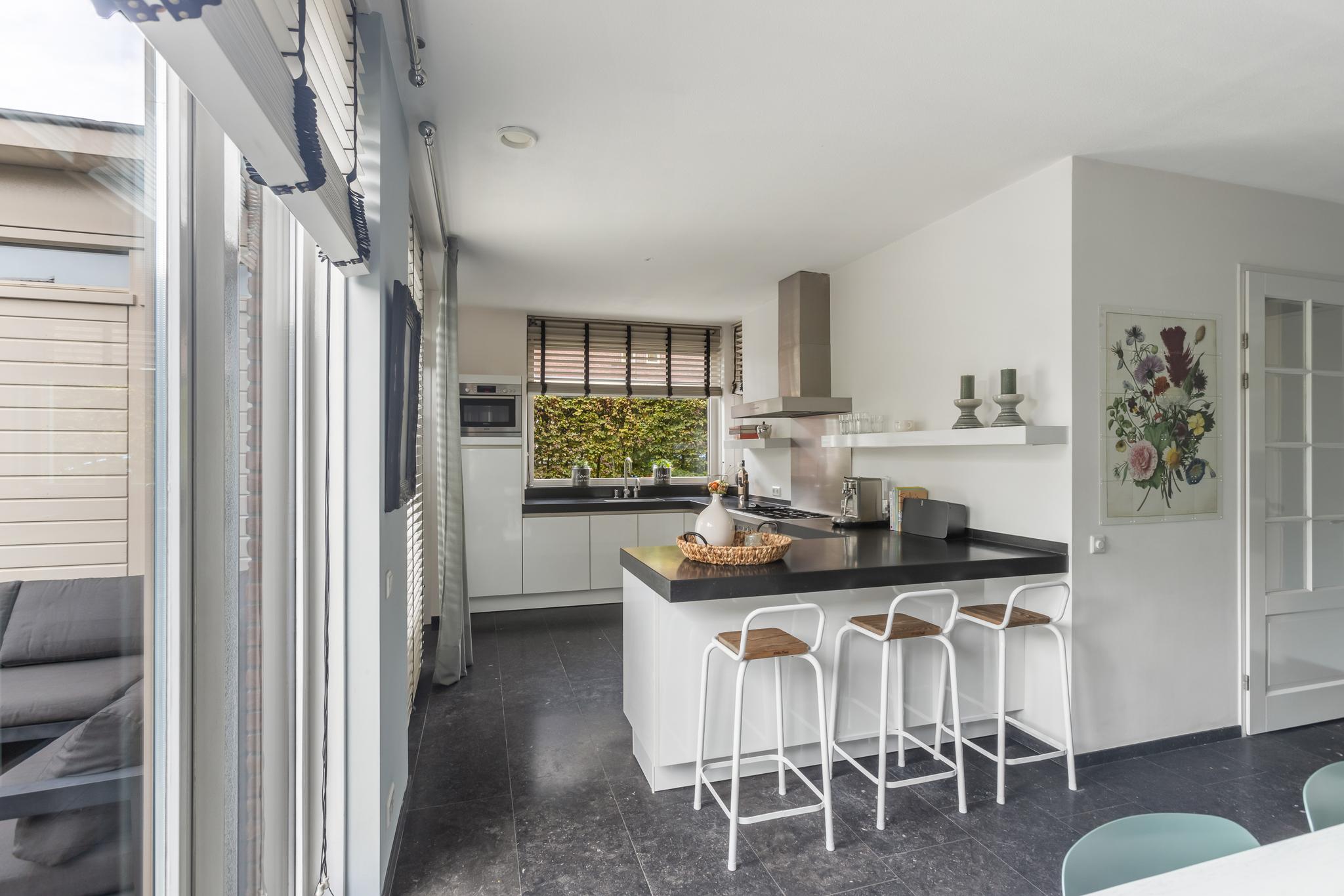 Gaan we naar binnen via de voordeur of de ruime garage? We kiezen de garage, door de bijkeuken en dán stappen we de strakke keuken binnen. Strijk neer op een barkruk en nuttig een drankje, terwijl je geniet van het uitzicht op de achtertuin! De tuin ligt op het noordwesten en biedt door de grote tuin en de situering van zitplekken, door de gehele dag heen altijd zon.