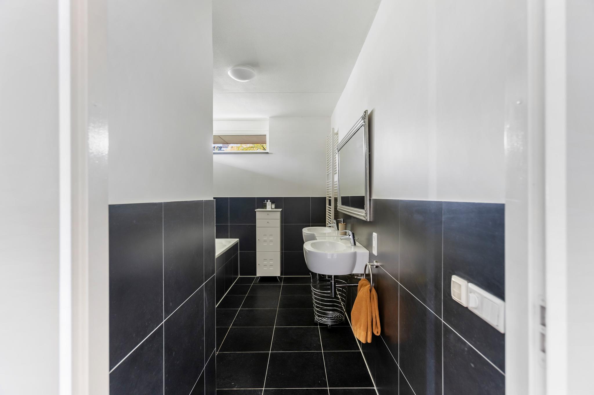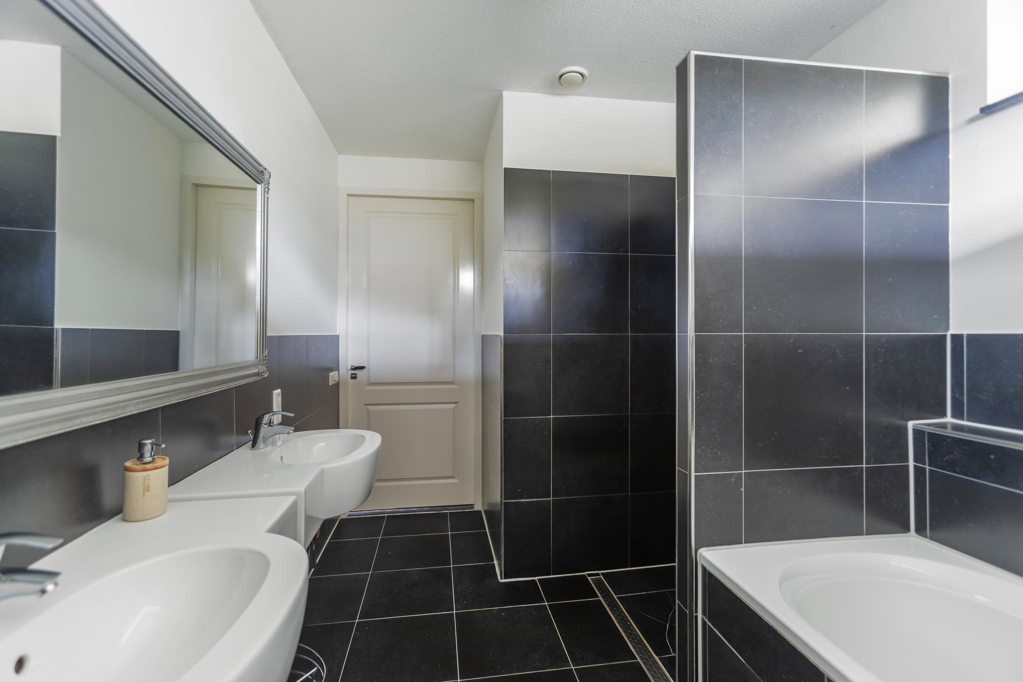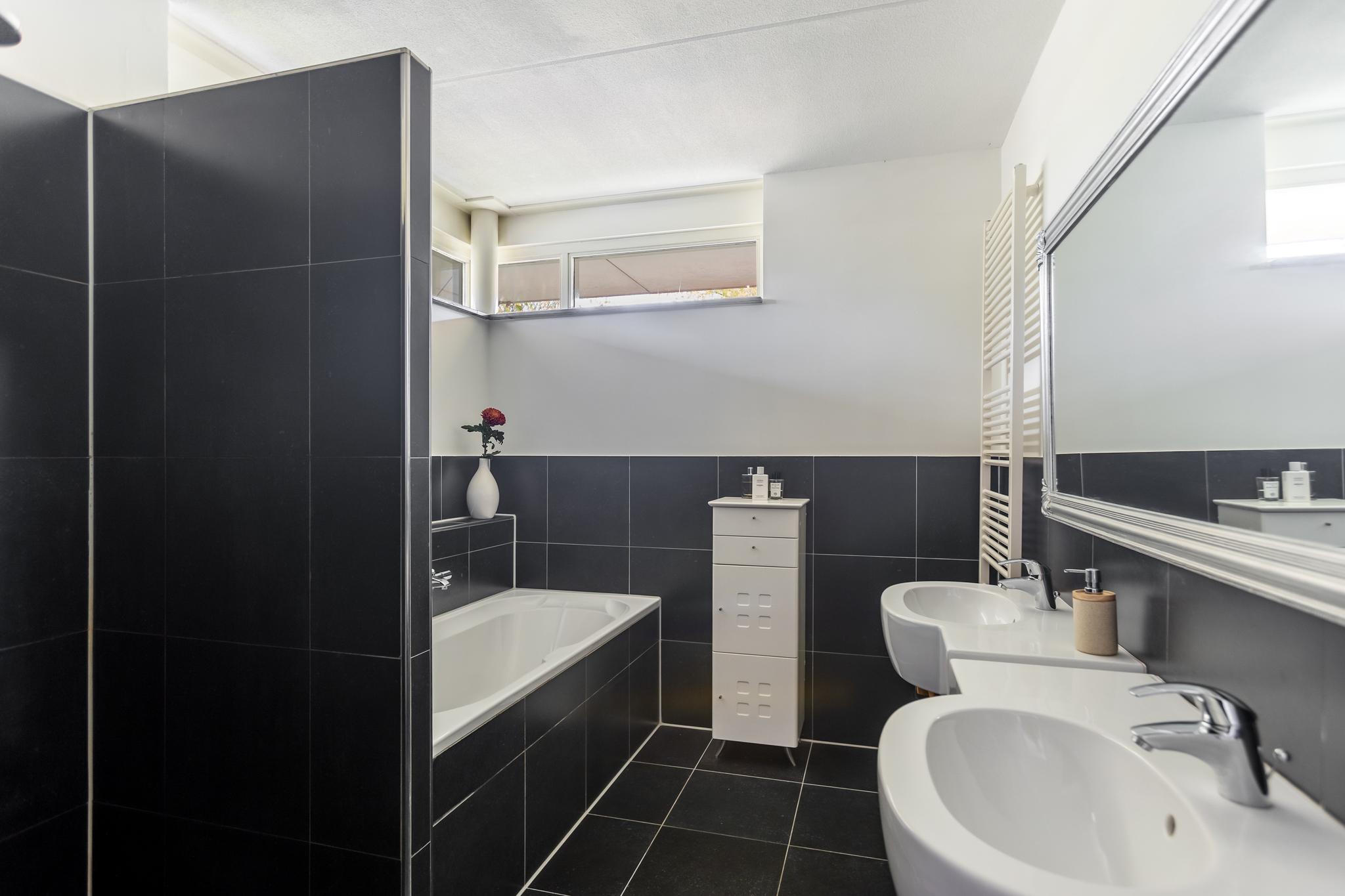 Badkamer met bad, douche, beide met thermostaatkraan, dubbele wastafel met designradiator en gedeeltelijk betegelde wanden.