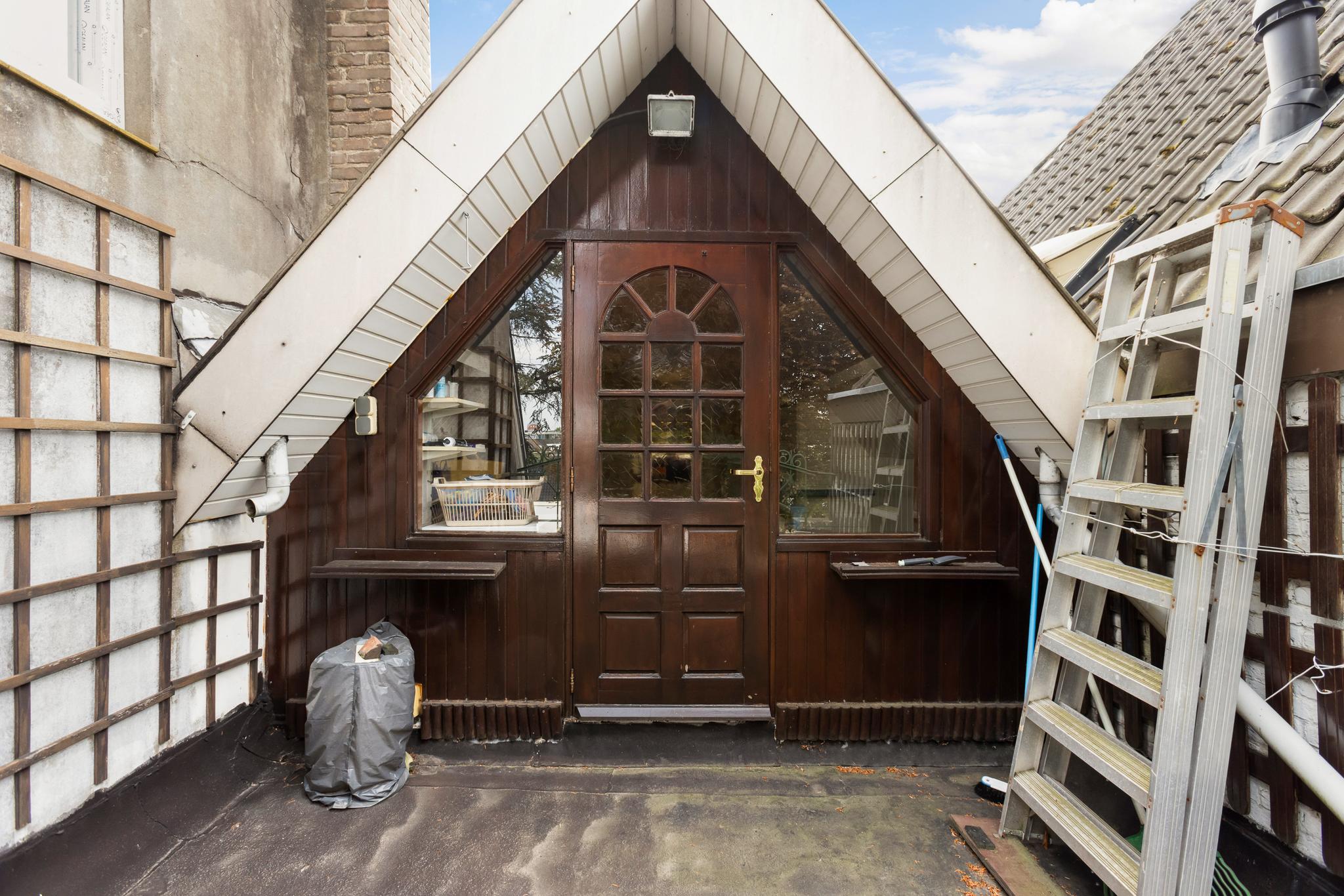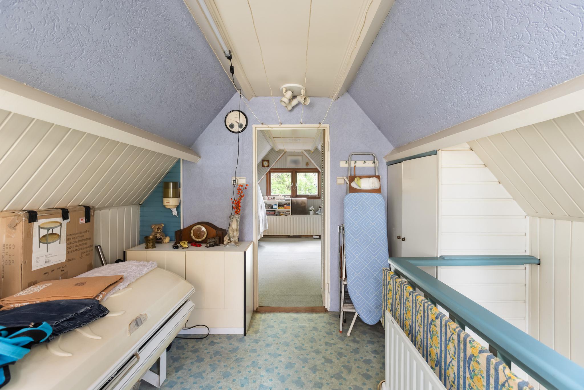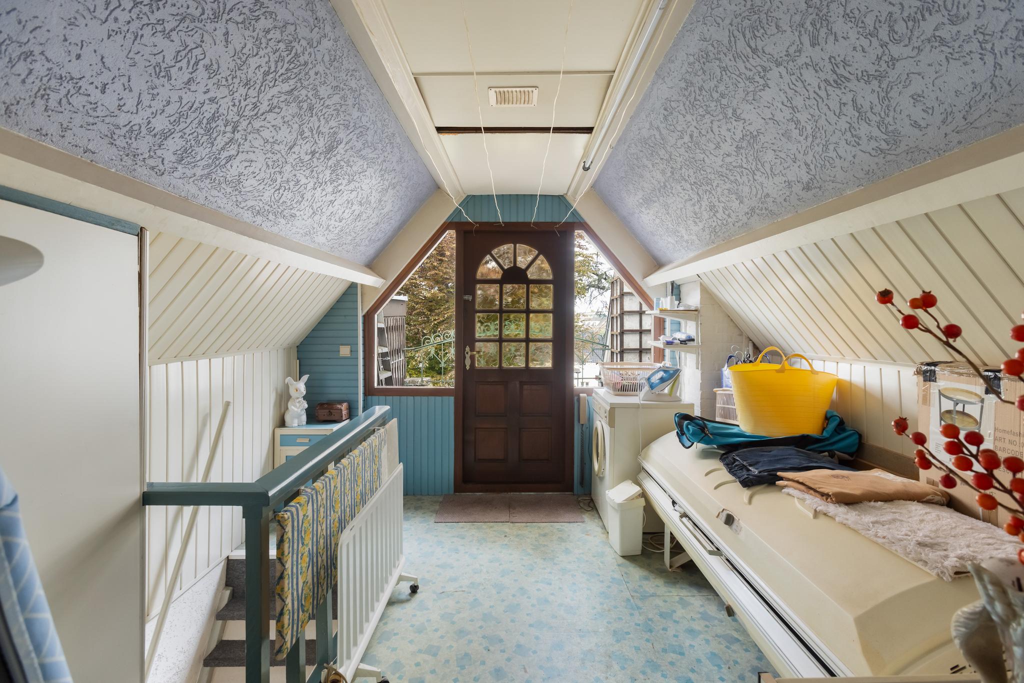 Overloop met deur naar het dakterras aan de achterzijde en bergruimte onder het schuine dak.