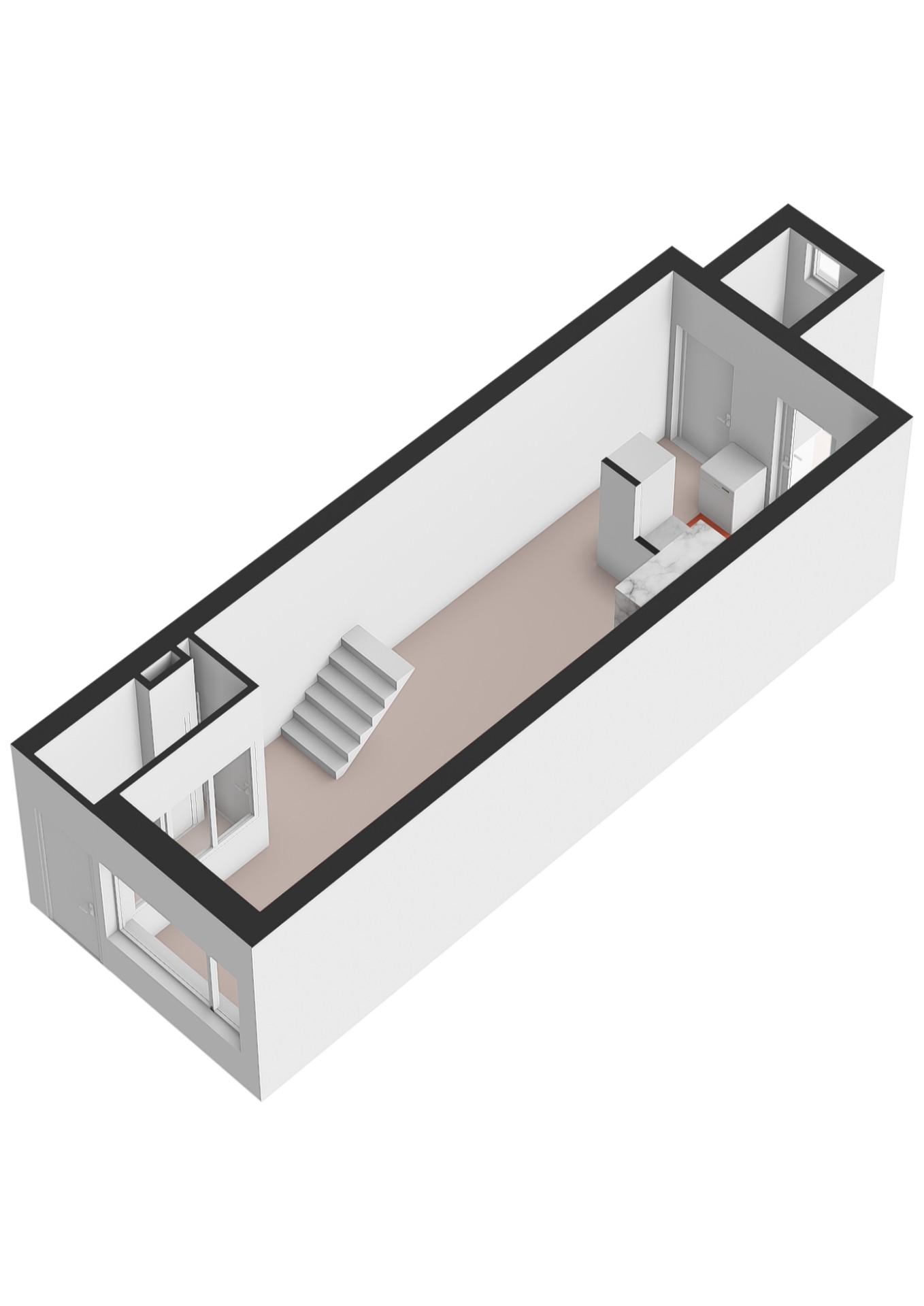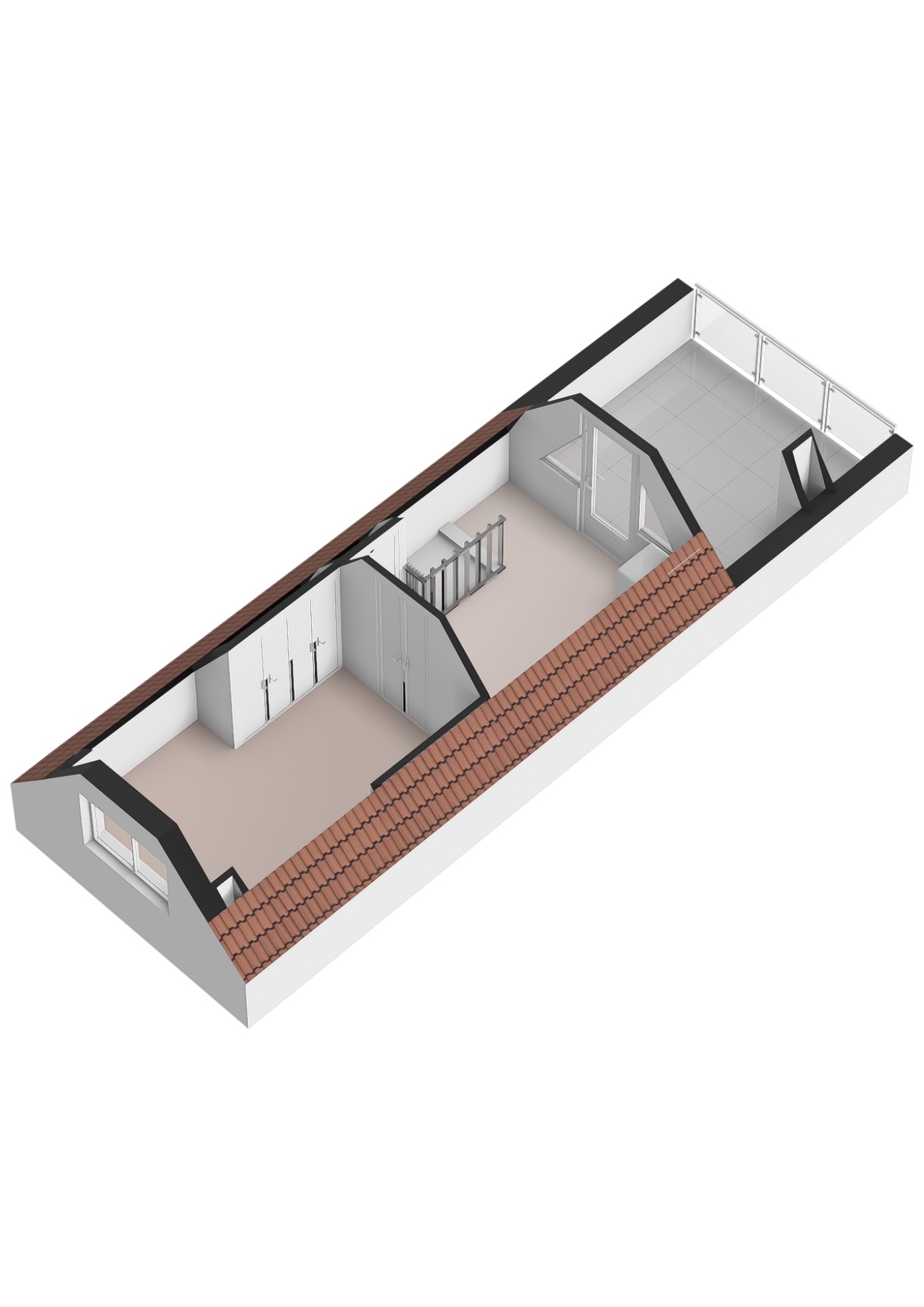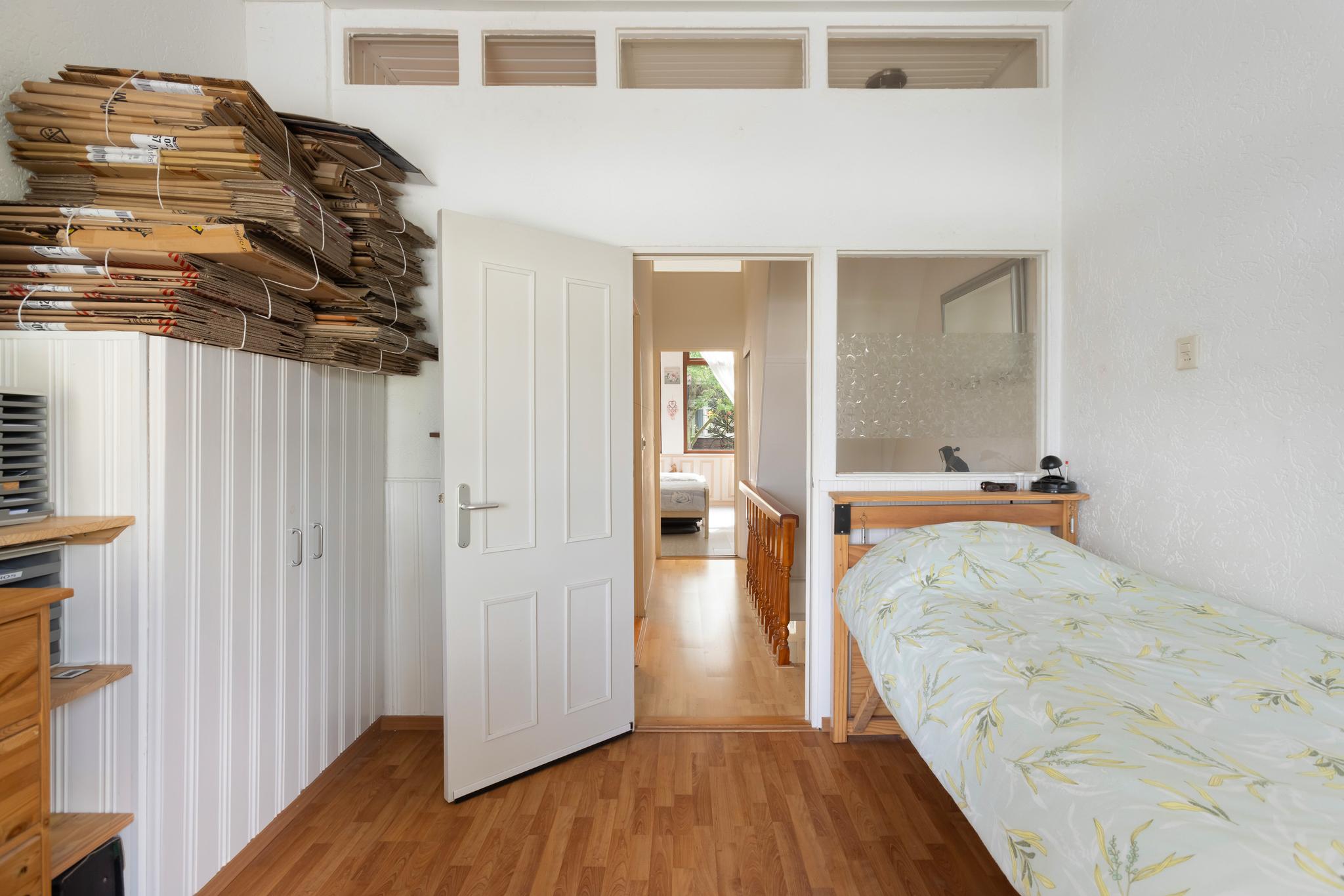 Overloop met deur naar het dakterras aan de achterzijde en bergruimte onder het schuine dak.