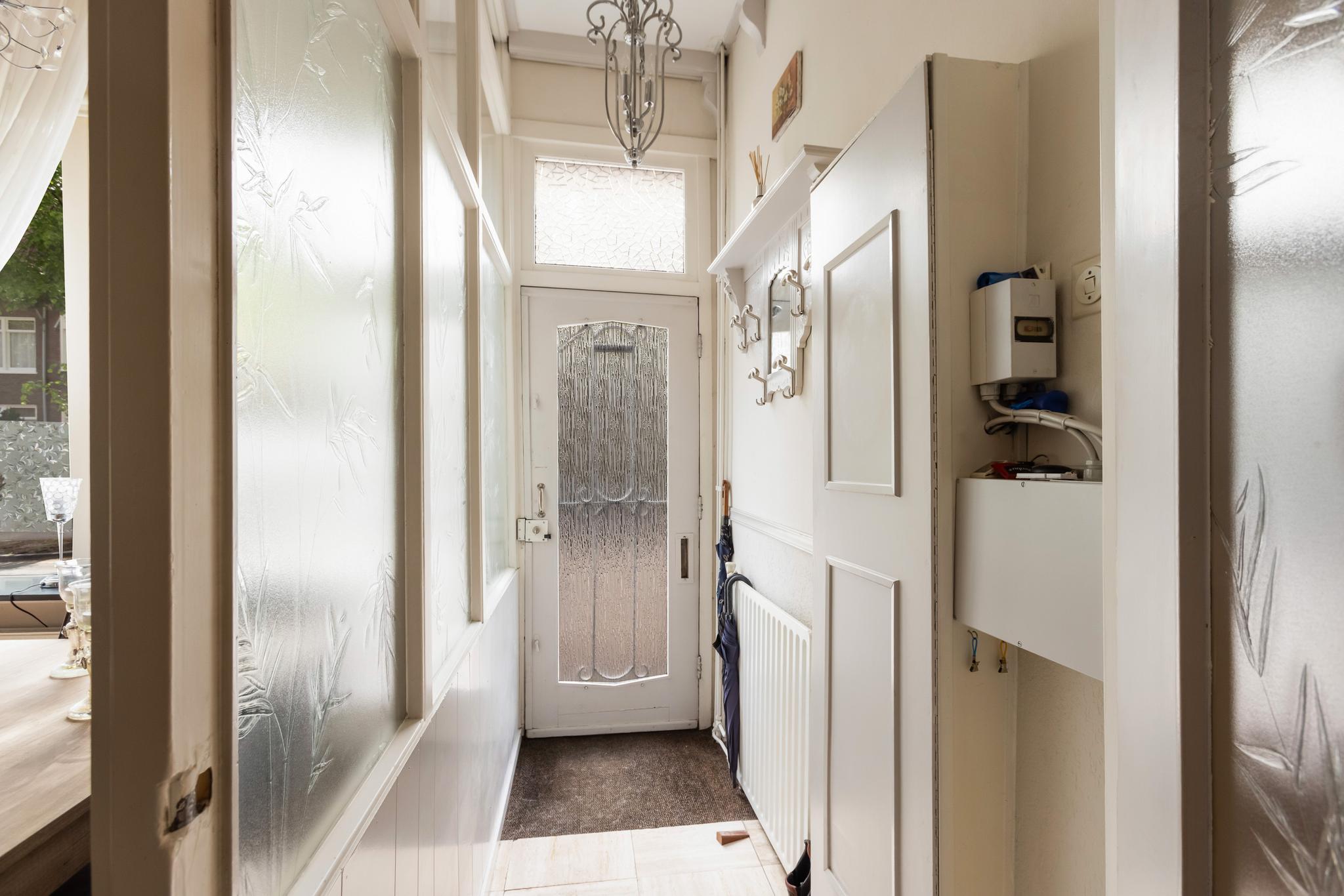 Entree in de hal met meterkast en luik naar de watermeter, deur naar de woonkamer.